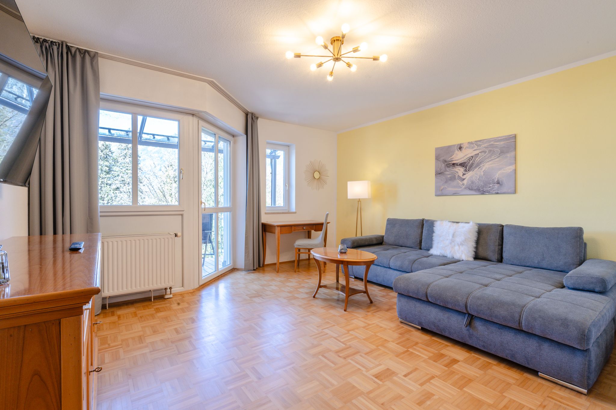 Unsere schöne, gemütliche Ferienwohnung befindet sich im 1. OG und ist im klassisch- eleganten Stil eingerichtet. Sie verfügt über ein separates Schlafzimmer mit einem Doppelbett (Boxspringmatratzen - 1,80 x 2,00), ein Wohnzimmer mit Schlafsofa, eine gut ausgestattete Küche mit Essecke, sowie ein Bad mit Badewanne/WC. Auf dem Balkon können Sie den Blick auf die Alpenstadt mit Bergpanorama genießen!