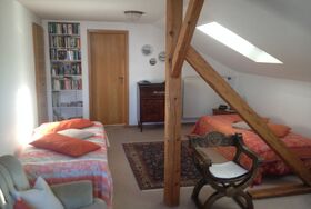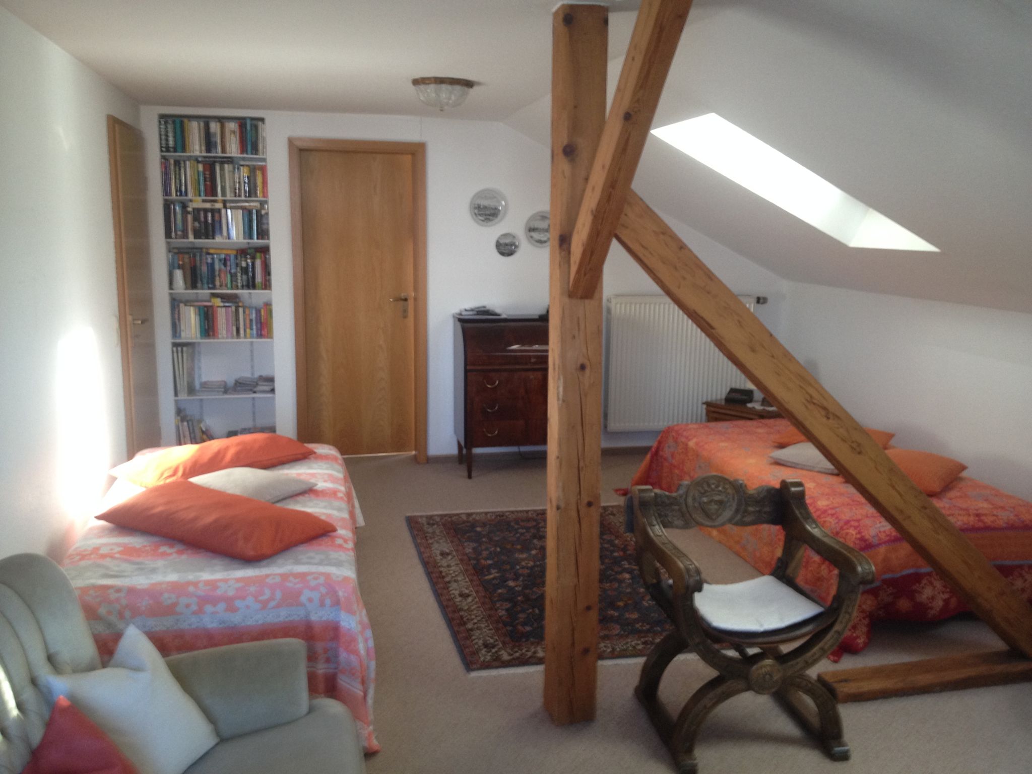 Gemütlich eingerichtet, viel Komfort, ruhig und sehr zentral. Im DG eines bayerischen Hauses. Geräumiges Schlafzimmer, großes Wohnzimmer mit zusätzl. Bett, Vollküche mit Essplatz und großes Bad mit Dusche und WC. Schöner Garten und Balkon stehen zur Verfügung. Das Bett für die 5. Person ist ein Zustellbett.