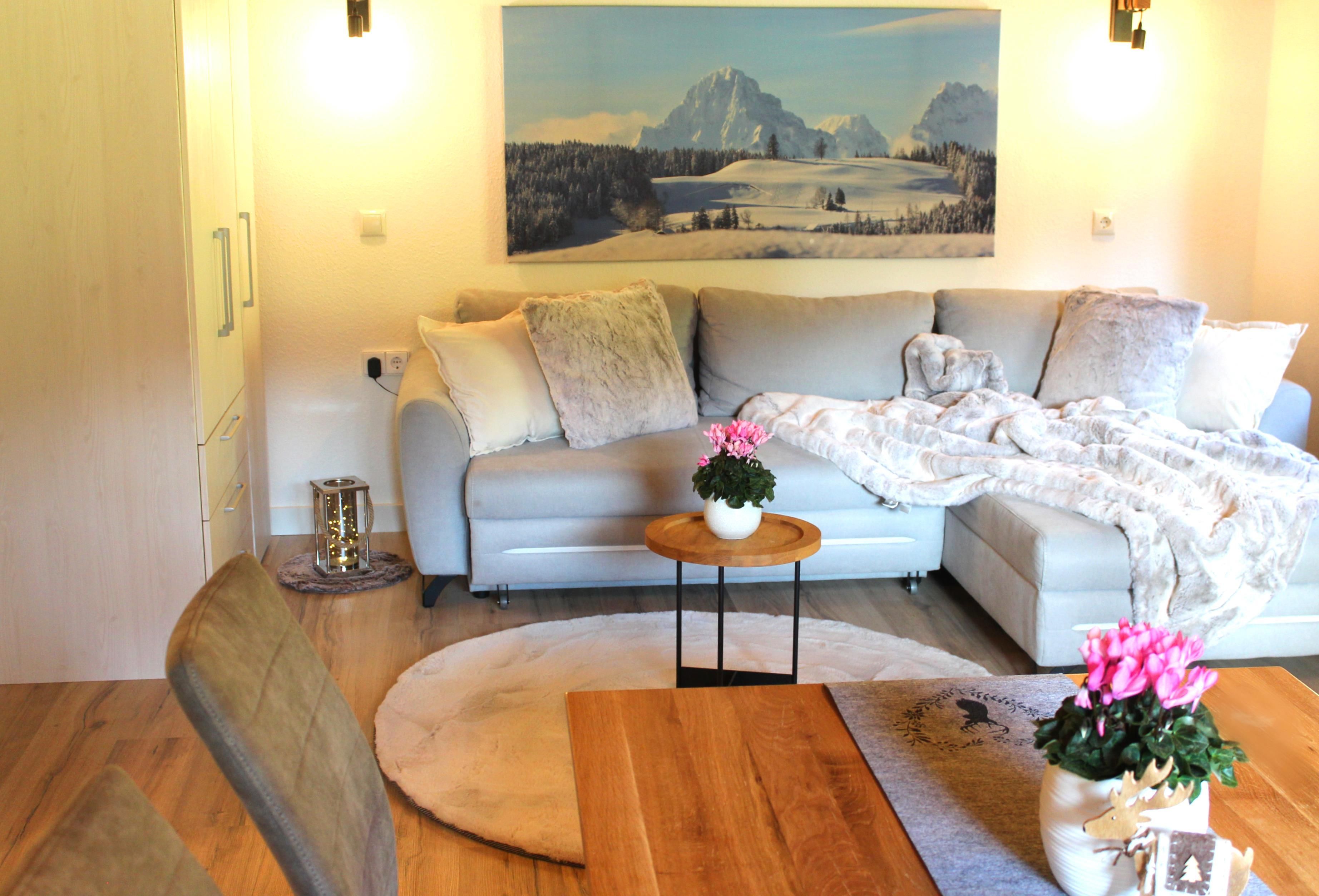 • Gemütliche Wohnecke mit Kuscheldecke und Flachbildfernseher