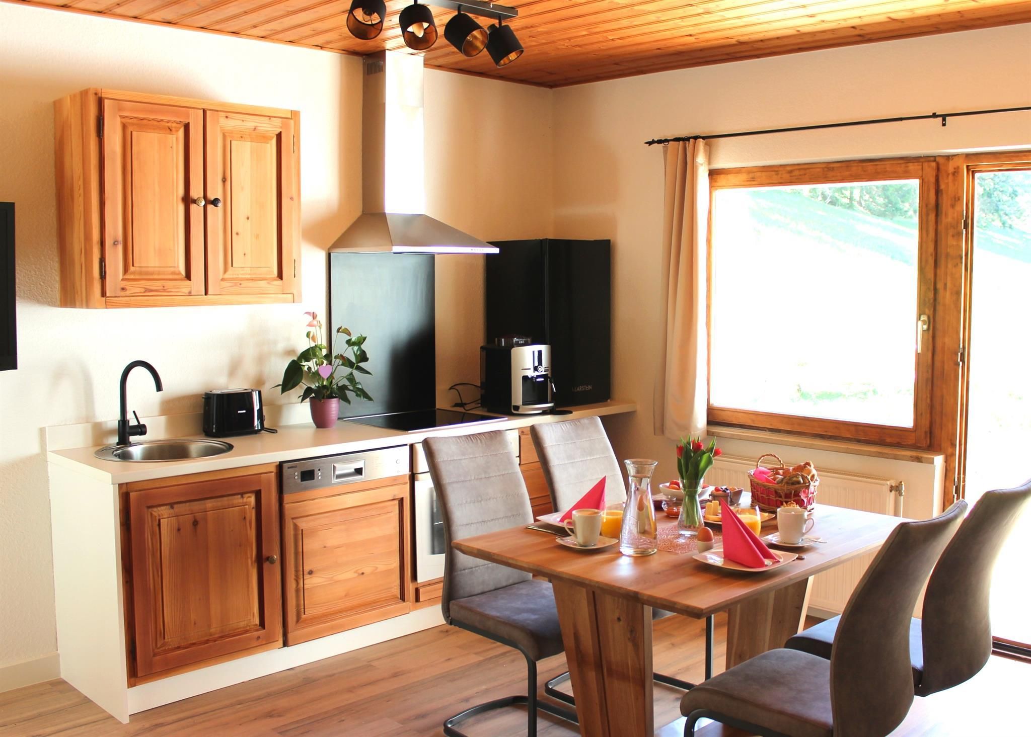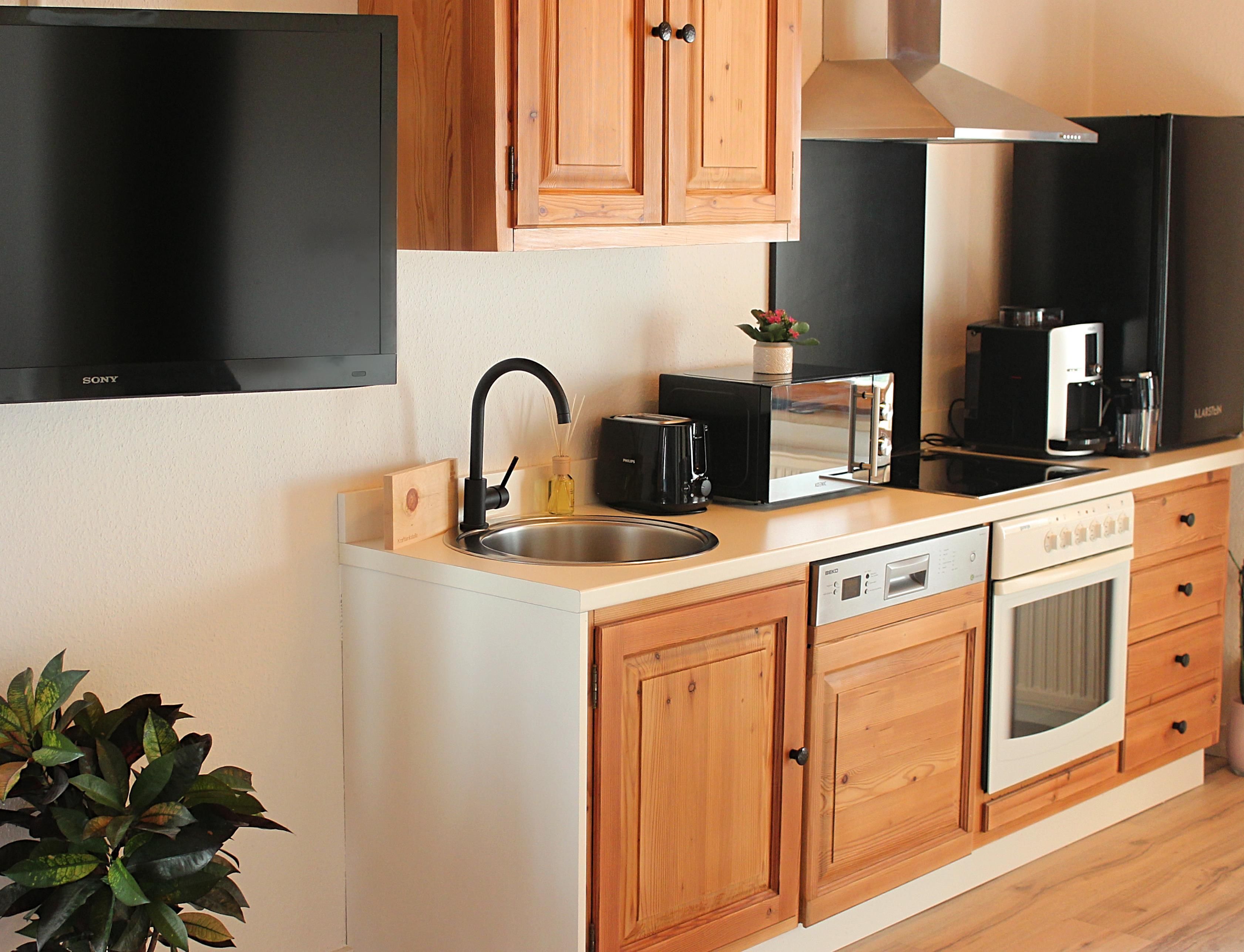 • Voll ausgestattete Holzküche mit Küchenutensilien, Kaffeevollautomat, Kühlschrank, Geschirrspüler, Toaster