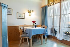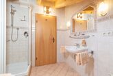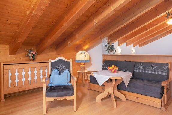 Großer Wohn- Schlafraum, feststehende Betten, Raumteiler mit Sitzgruppe, Kachelofen und Essecke. Abgeschlossene Küche mit Mikrowelle u. Spülmaschine. Badezimmer mit Fenster, Dusche/WC und Waschbecken. Südbalkon mit freien Blick zum Wilden Kaiser.