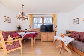 Großer heller Wohn-, Schlafraum, feststehende Betten, eingebaute Essecke, Kachelofen u. Sitzgruppe. Separate Küche mit Mikrowelle u. Spülmaschine. Helles Badezimmer mit Fenster, Dusche/WC und Waschbecken. Großer Balkon zur Südseite mit Blick zum Wilden Kaiser (ganzer Tag Sonne).