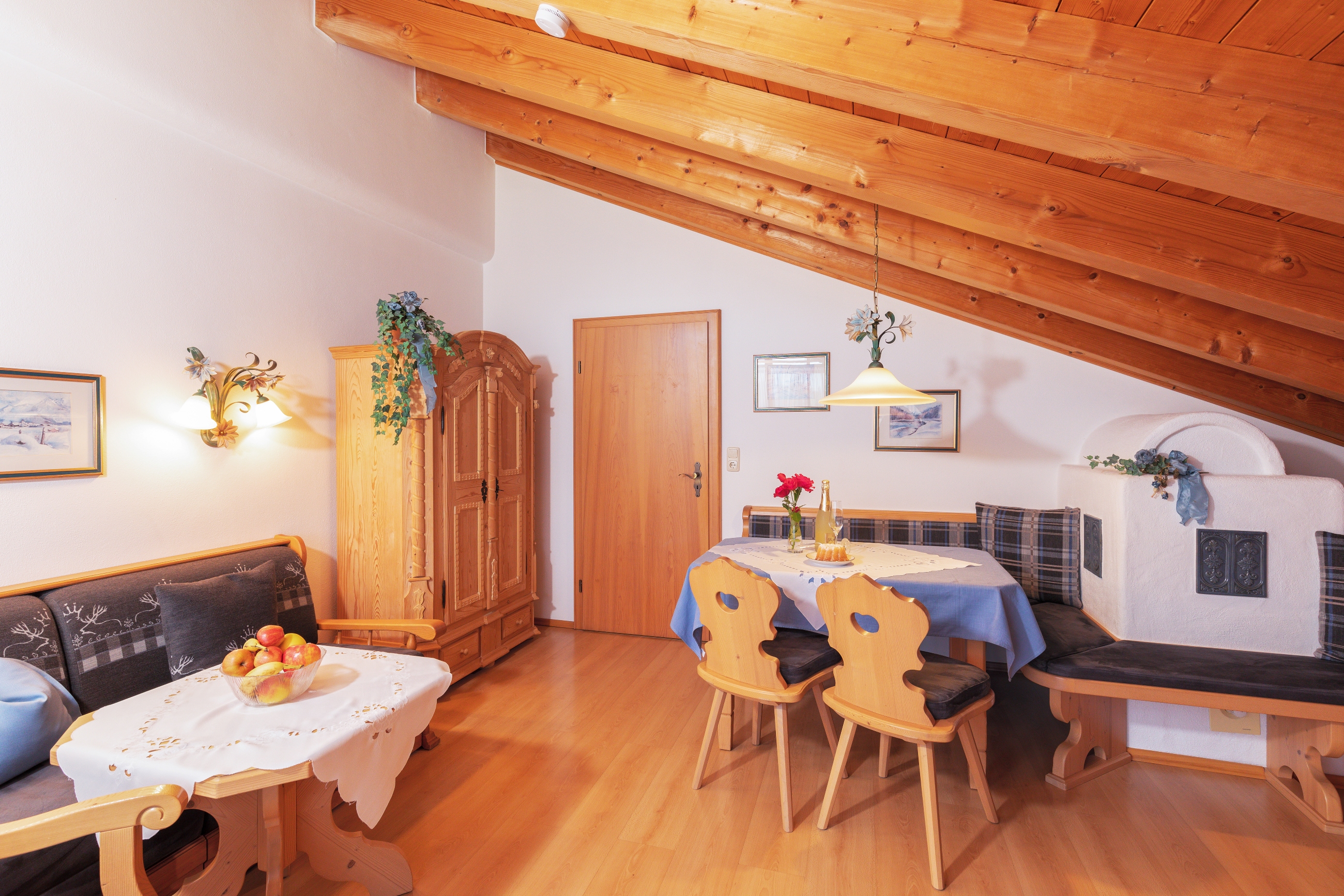Zwei Schlafzimmer, gemütlicher, großer Wohnraum mit eingebauter Essecke mit Kachelofen. Abgeschlossene Küche mit Spülmaschine u. Mikrowelle. Badezimmer mit Fenster,Doppelwaschbecken, Dusche/WC. Südseitenbalkon mit Blick zum Wilden Kaiser.
