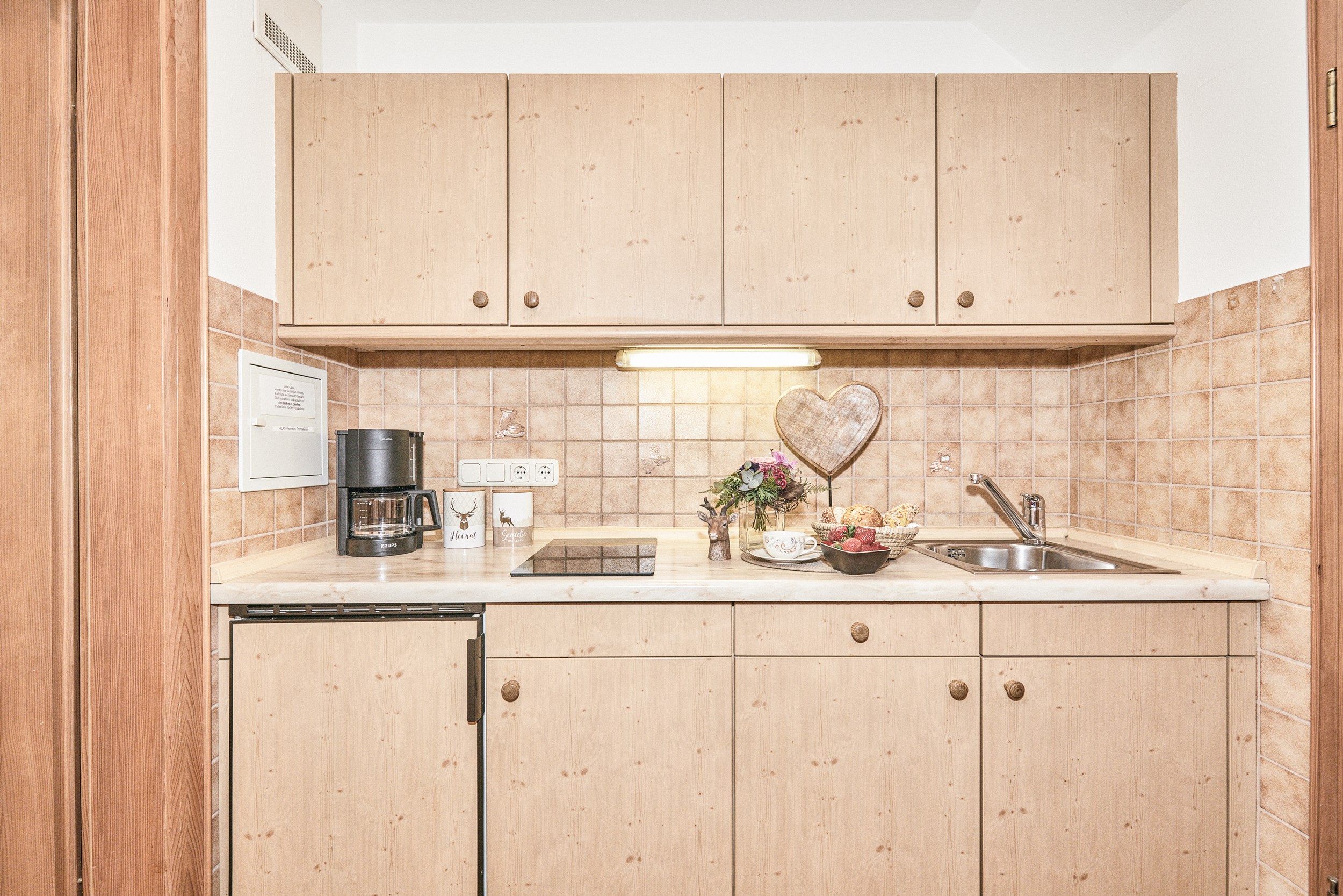 Wohn- und Schlafraum kombiniert, feststehende Betten, Eßecke und Sitzgruppe. Abgeschlossene Küche. Badezimmer-Dusche/WC. Abgeschlossener Südbalkon mit Blick zum Wilden Kaiser.