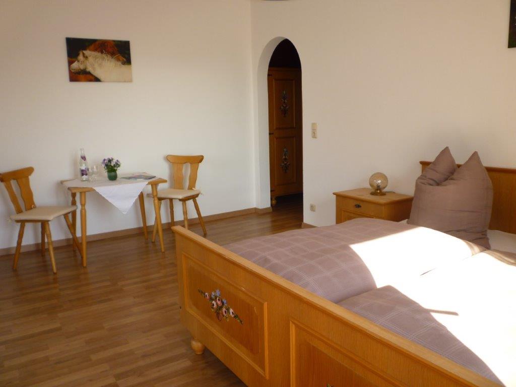 Das gemütliche Doppelzimmer im Erdgeschoss verfügt über ein Doppelbett und ist im bayerisch-rustikalen Stil eingerichtet. Es verfügt über Dusche/WC und Toilettenartikel sowie über einen Balkon bzw. eine Terrasse. Bettwäsche und Handtücher werden gestellt. Der Balkon bzw. die Terrasse sind mit Gartenmöbeln bestuhlt. Alle Zimmer haben einen direkten Blick auf die heimische Bergwelt und die umliegende Natur. Ein reichhaltiges Frühstück im gemütlichen Frühstücksraum ist im Preis inbegriffen.