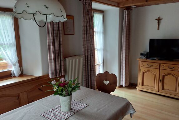 Unsere Ferienwohnungen sind sehr gemütlich im bäuerlichen Stil mit Kabelfernsehen eingerichtet. Sie sind ausgestattet mit Bettwäsche, Handtücher, Geschirr, 4-Plattenherd, Kaffee- und Brotmaschine sowie Wasserkocher.