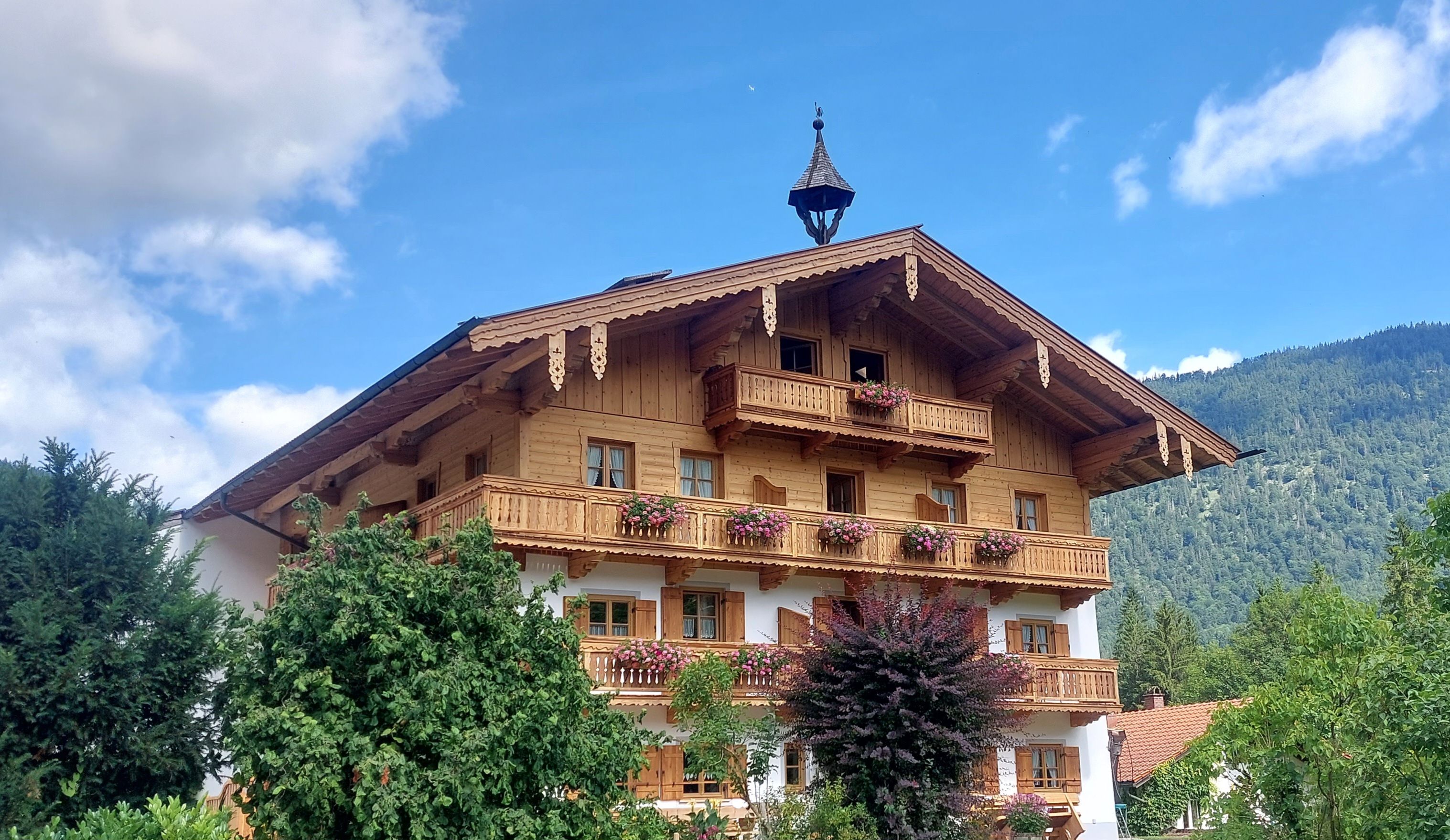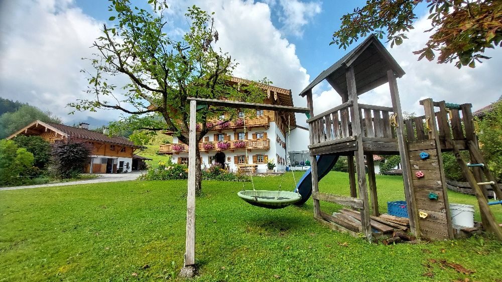 Kinderfreundliches (mit Kinderspielplatz) Bauernhaus mit Milchwirtschaft in zentraler, schöner Lage am Waldrand. Vom Balkon direkter Blick auf die Berge. Im Haus befinden sich vier FeWo für 2 bis 6 Personen. Ein gemütlicher Aufenthaltsraum sowie eine Frühstücksterrasse sind vorhanden. Die FeWo bestehen aus einem bzw. zwei Schlafzimmern und einem Wohn-Schlafraum.