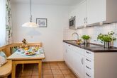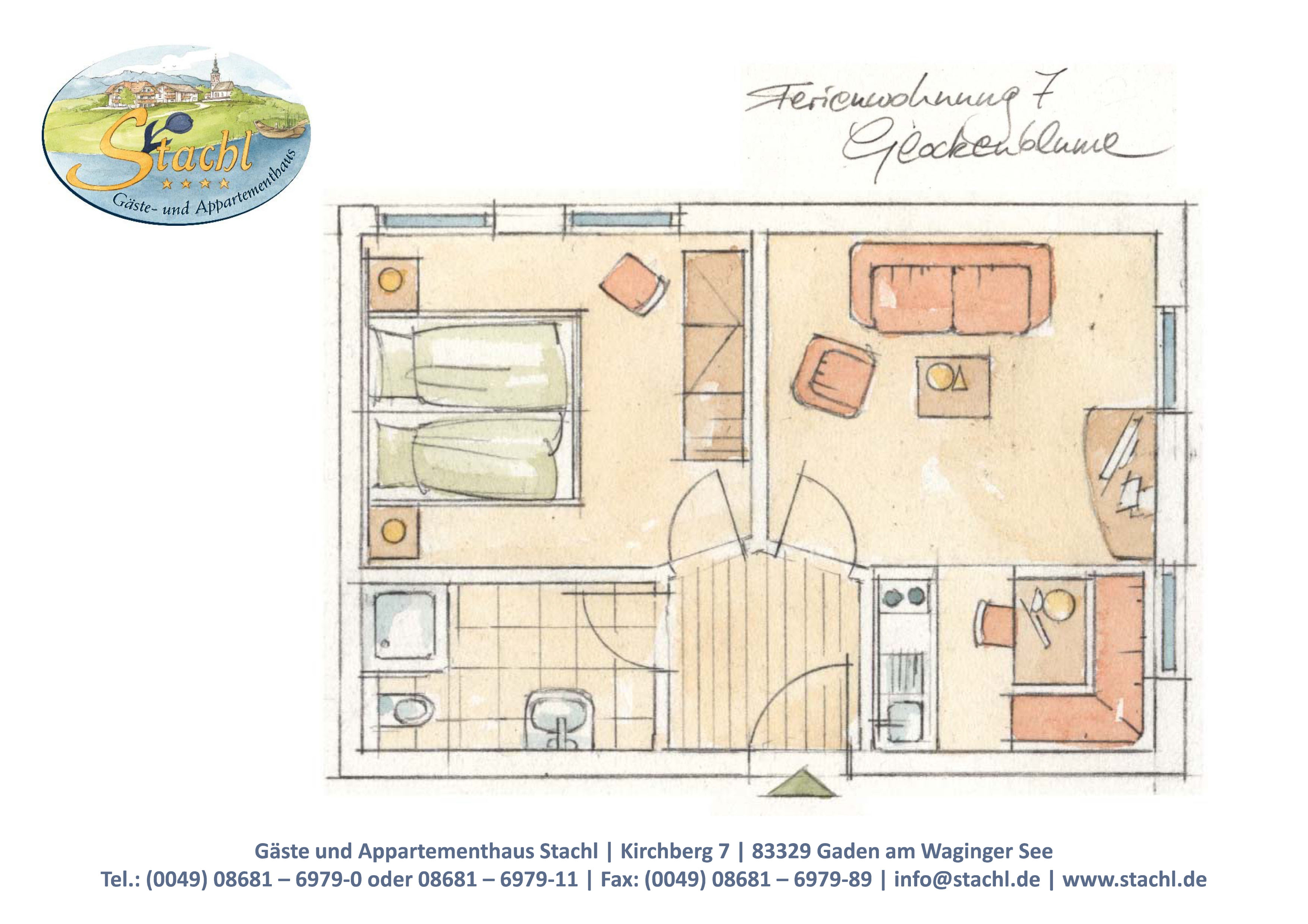 Die 4-Sterne-Ferienwohnung Glockenblume für 2 Personen befindet sich im 1. Stock und ist 45 m² groß ohne Balkon. Die Wohnung verfügt über ein Schlafzimmer mit Doppelbett, Schrank und Tresor, ein Wohnzimmer mit gemütlicher Sitzecke, eine voll ausgestattete Küche mit Geschirrspüler und Essecke mit Ausblick Richtung See und ein Badezimmer mit Dusche, WC, Handtuchtrockner und Fön.