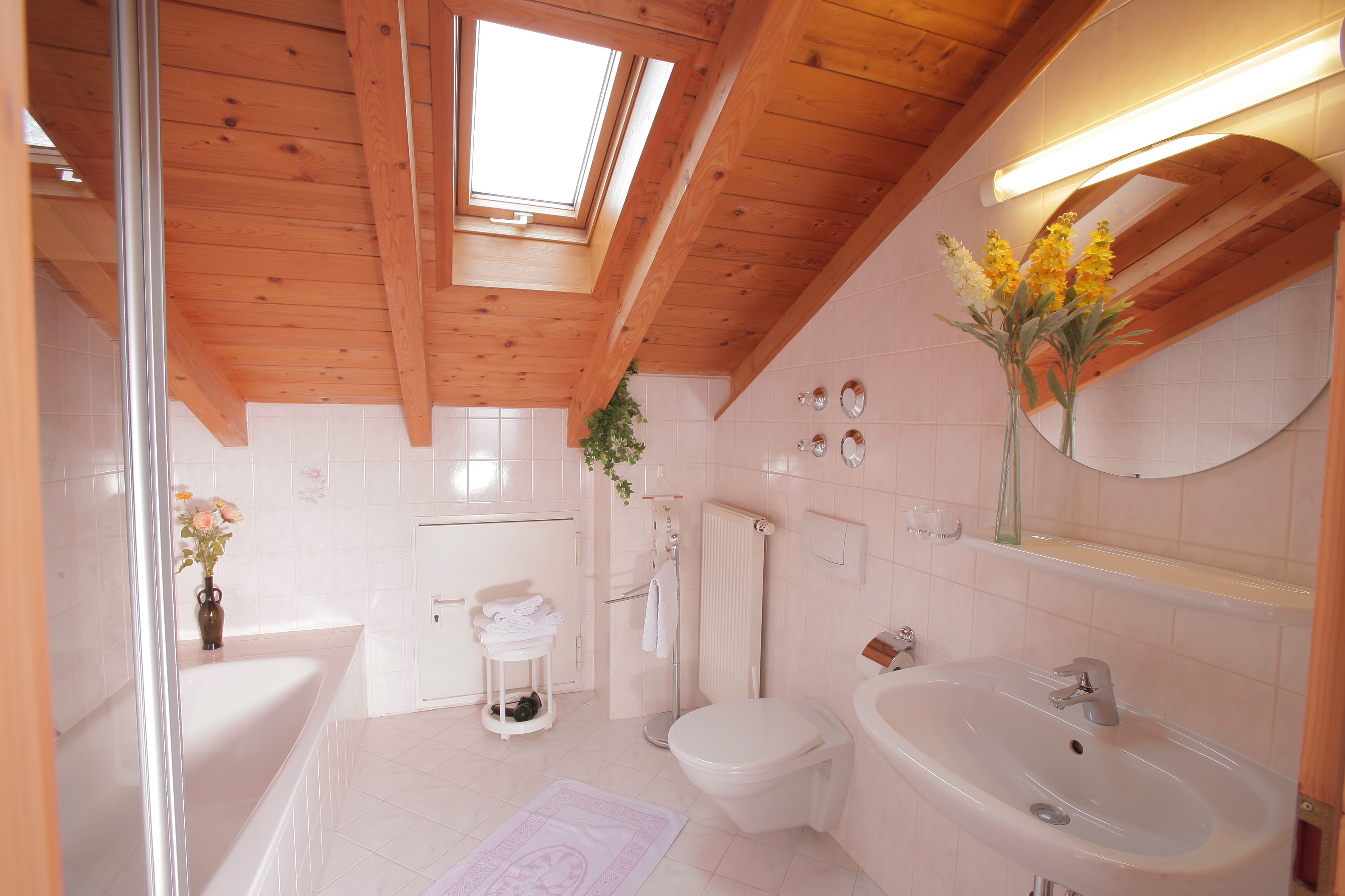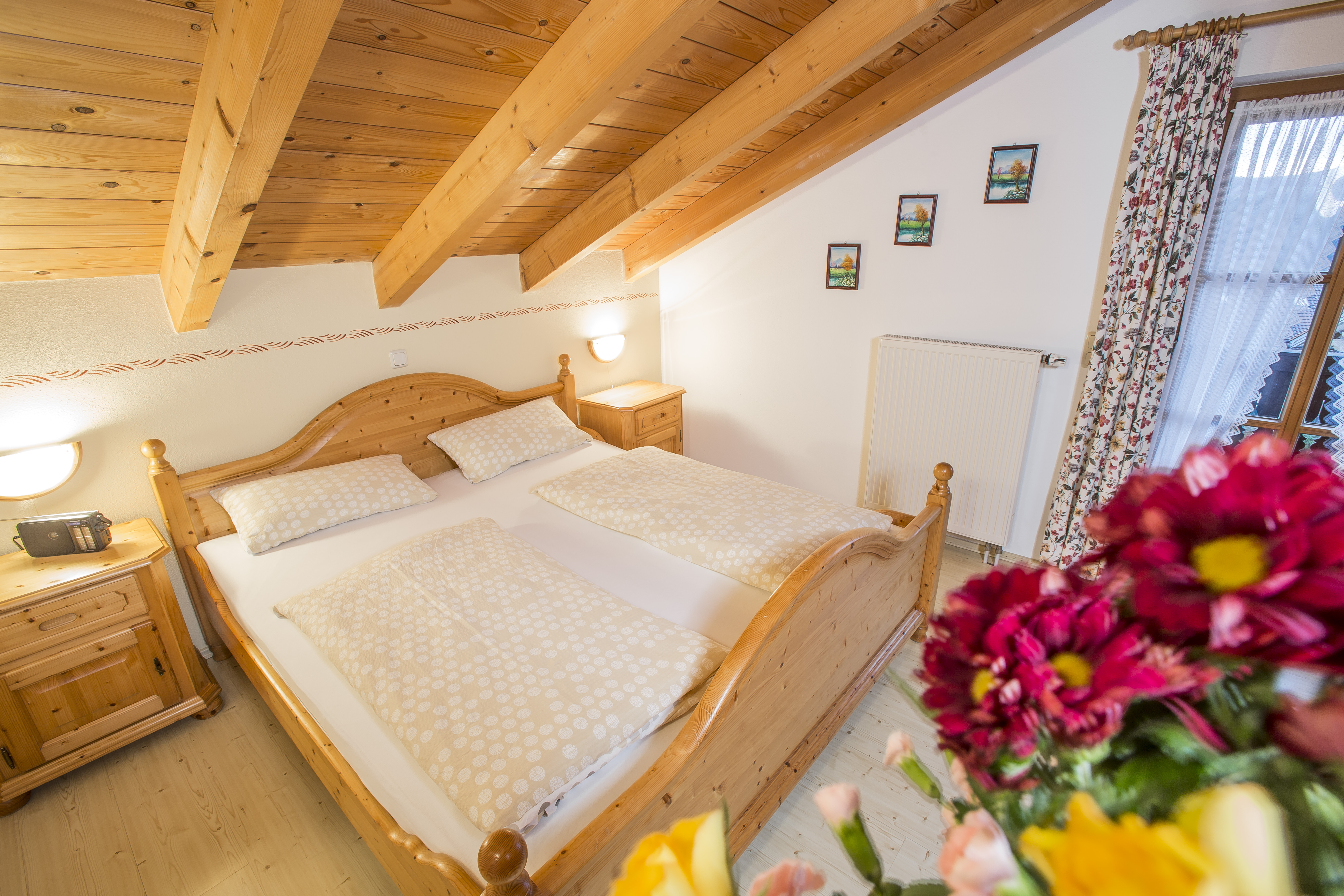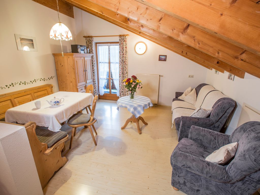 Gemütliche Ferienwohnung (48 qm) unterm Dach mit 1 separaten Schlafzimmer, Balkon mit Blick auf Dorf und Berge, große Wohnküche mit Eßecke und Couchgarnitur. Küchenzeile komplett ausgestattet mit Spülmaschine, Mikrowelle, Kaffeemaschine, Wasserkocher, 4-Plattenherd mit Backrohr, Kühlschrank mit Gefrierfach, Bad mit Badewanne, Dusche und WC. Kabel-TV, Telefon, Radio, Stereoanlage und Internet - WLAN kostenfrei nutzbar.