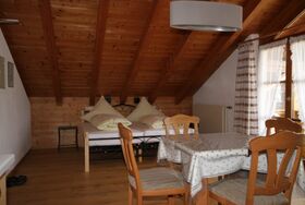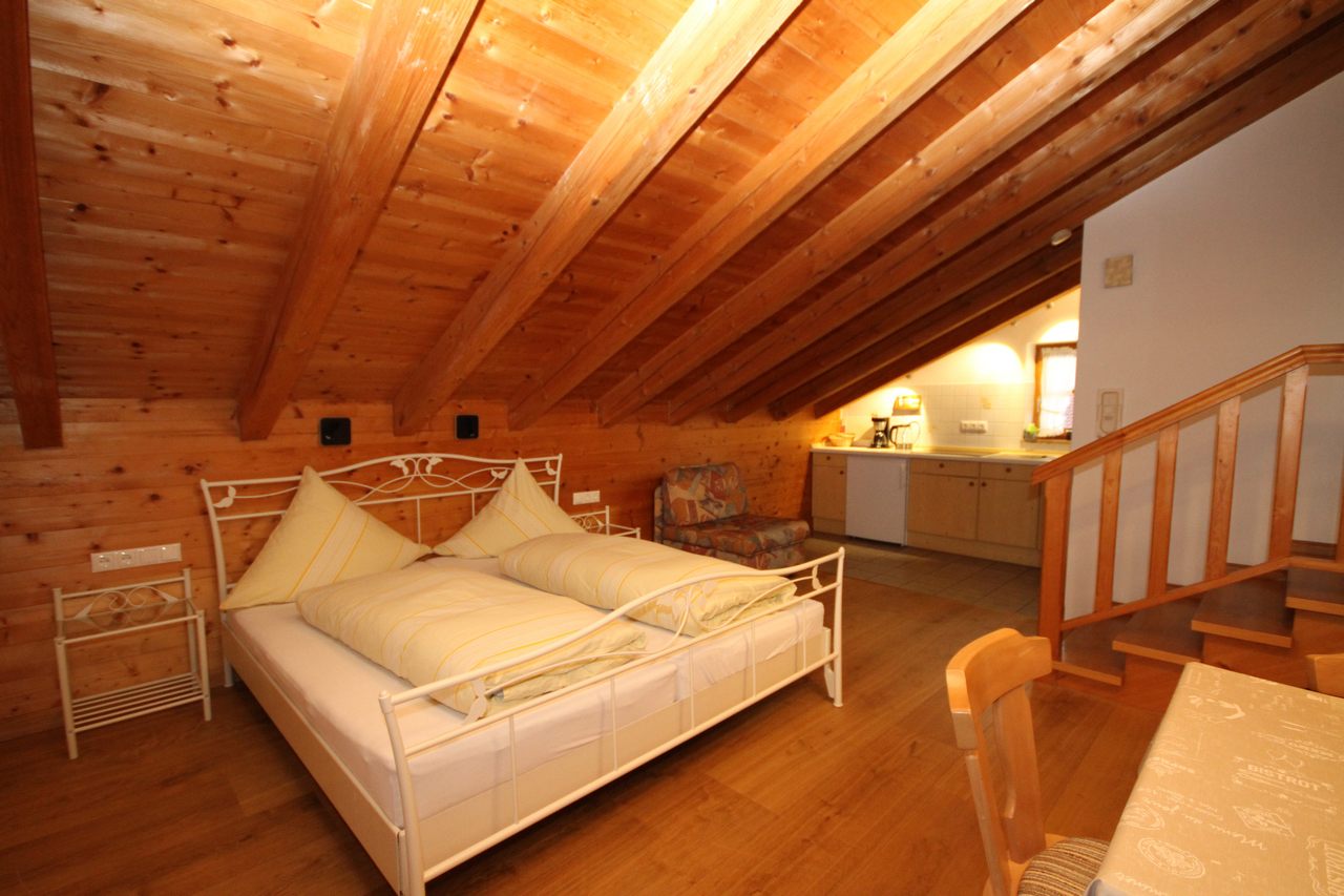Die schöne und freundliche Ferienwohnungen mit Balkon bietet wundervollen Bergblick. Der kombinierte Wohn-/Schlafraum ist mit einem Doppelbett und einer gemütlichen Essecke sowie einem Fernseher für gemütliche Urlaubsstunden ausgestattet. Bettwäsche, WC-Papier, Hand-, Dusch- und Geschirrtücher sind vorhanden. In der Kochnische sind Kaffeemaschine und -filter sowie Geschirr, Gläser, Eierkocher und Toaster vorhanden. Auf Wunsch kann ein Kinderbettchen zur Verfügung gestellt werden. Die Wohnung kann auch mit Beistellbett (also für 3 Personen für 50,00 €) vermietet werden.