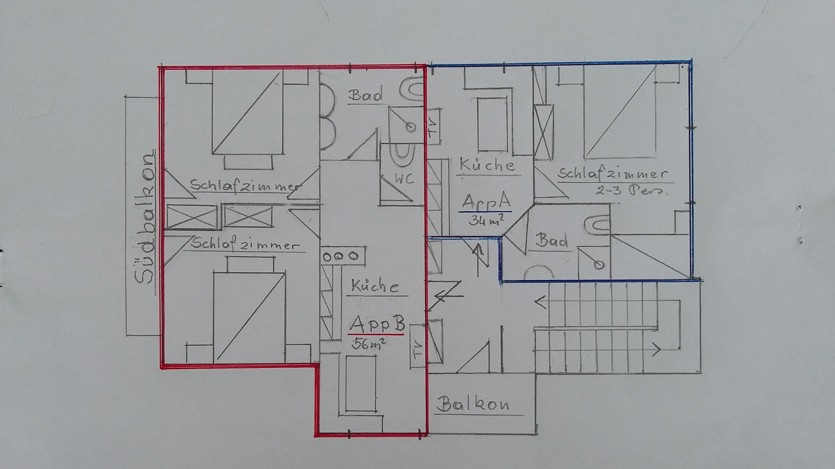 Die geräumige Wohnung B bietet Platz für bis zu 4 Personen und verfügt über 2 Schlafzimmer mit Doppelbetten, 1 Wohnküche mit Esstisch, TV und WLAN, 1 Badezimmer mit Doppelwaschbecken mit Dusche und WC, 1 extra WC sowie Balkon.