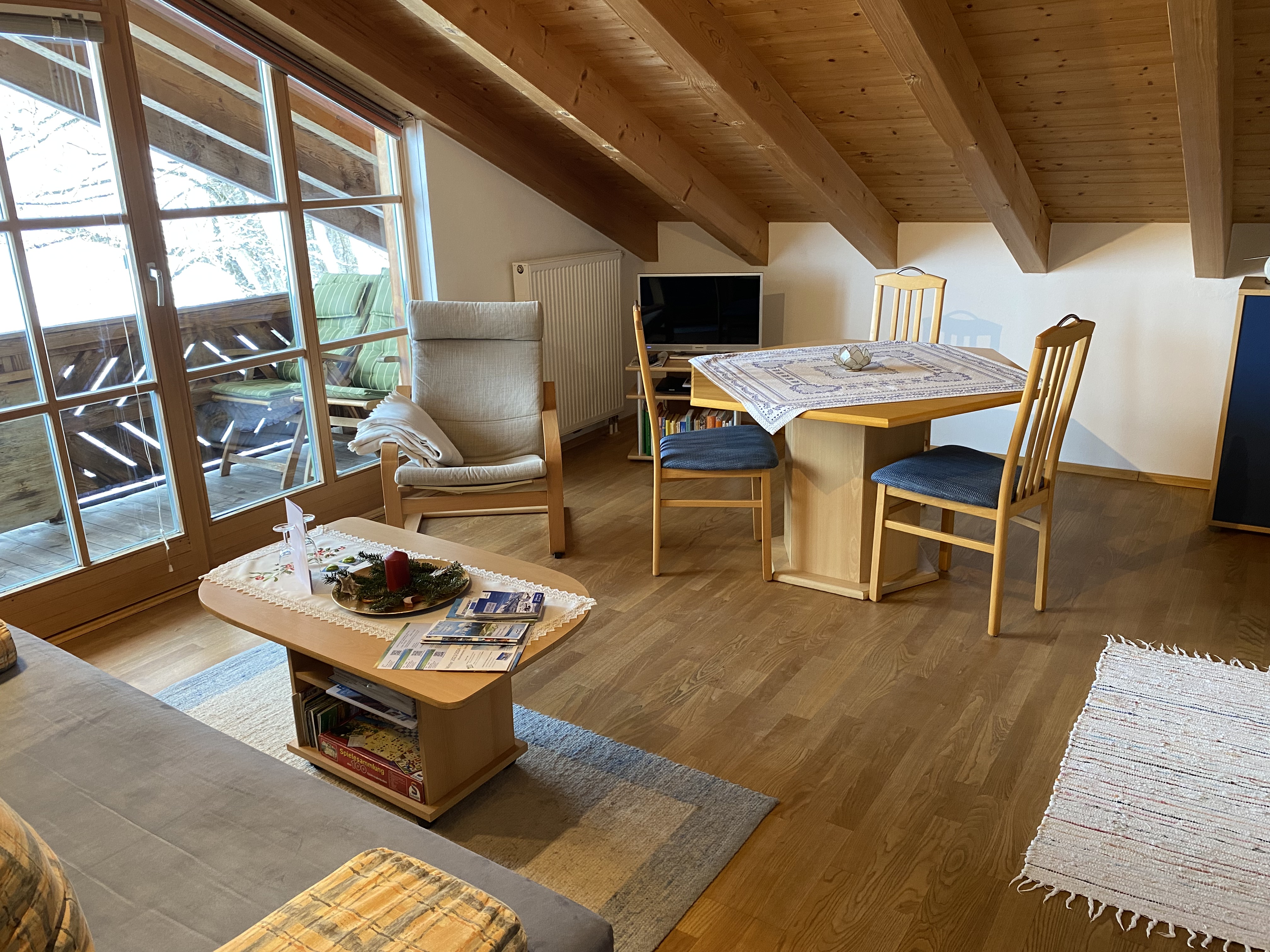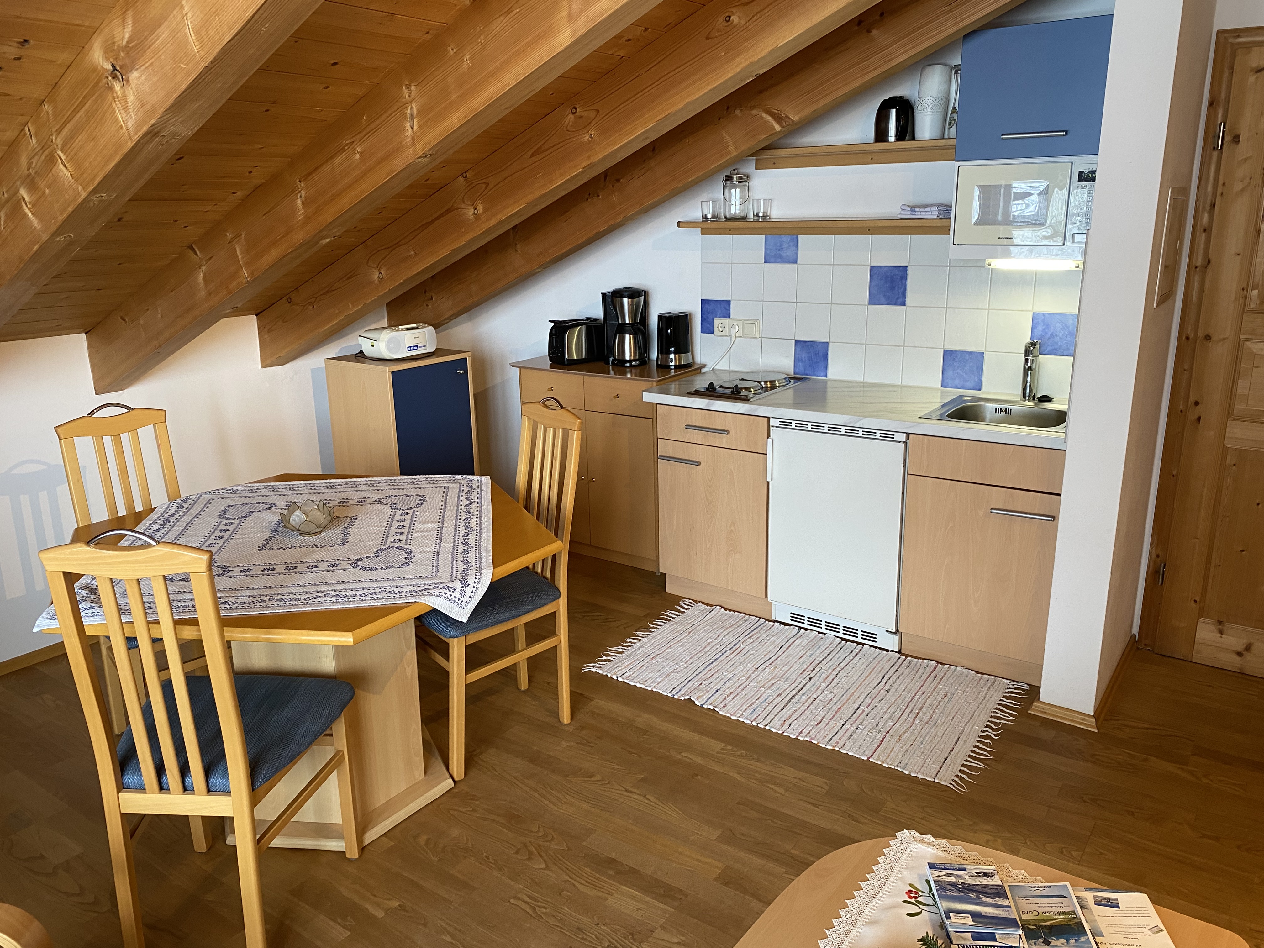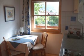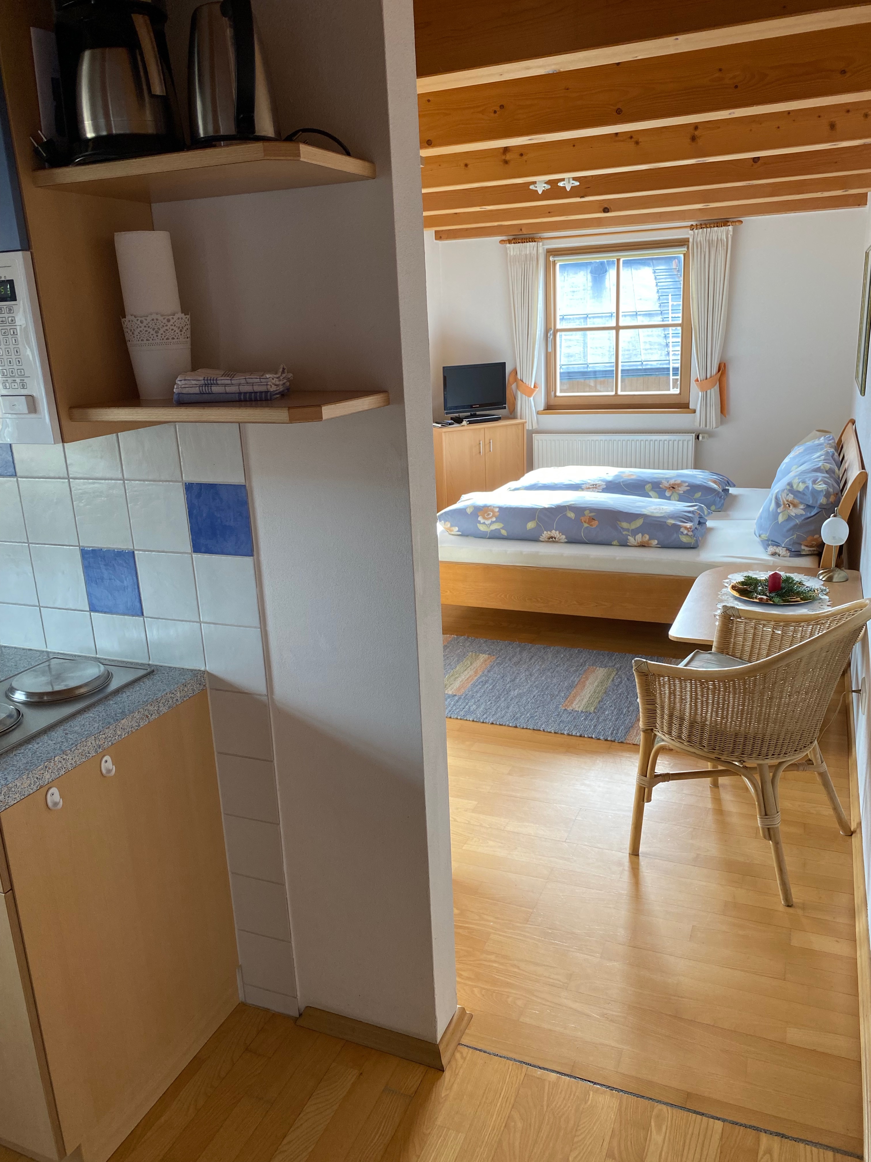 Die nach Osten und Süden orientierte Wohnung im 1. Stock bietet Platz für 2 Personen. Sie verfügt über einen Wohn-/Schlafraum mit Doppelbett, eine kleine Wohnküche mit gut ausgestatteter Küchenzeile, Tisch und Stühlen. Auf dem großen Balkon warten Stühle, ein großer Holzklapptisch und Sonnenschirm sowie ein sehr schöner Ausblick auf den Ortskern und die umliegenden Berge auf unsere Gäste.