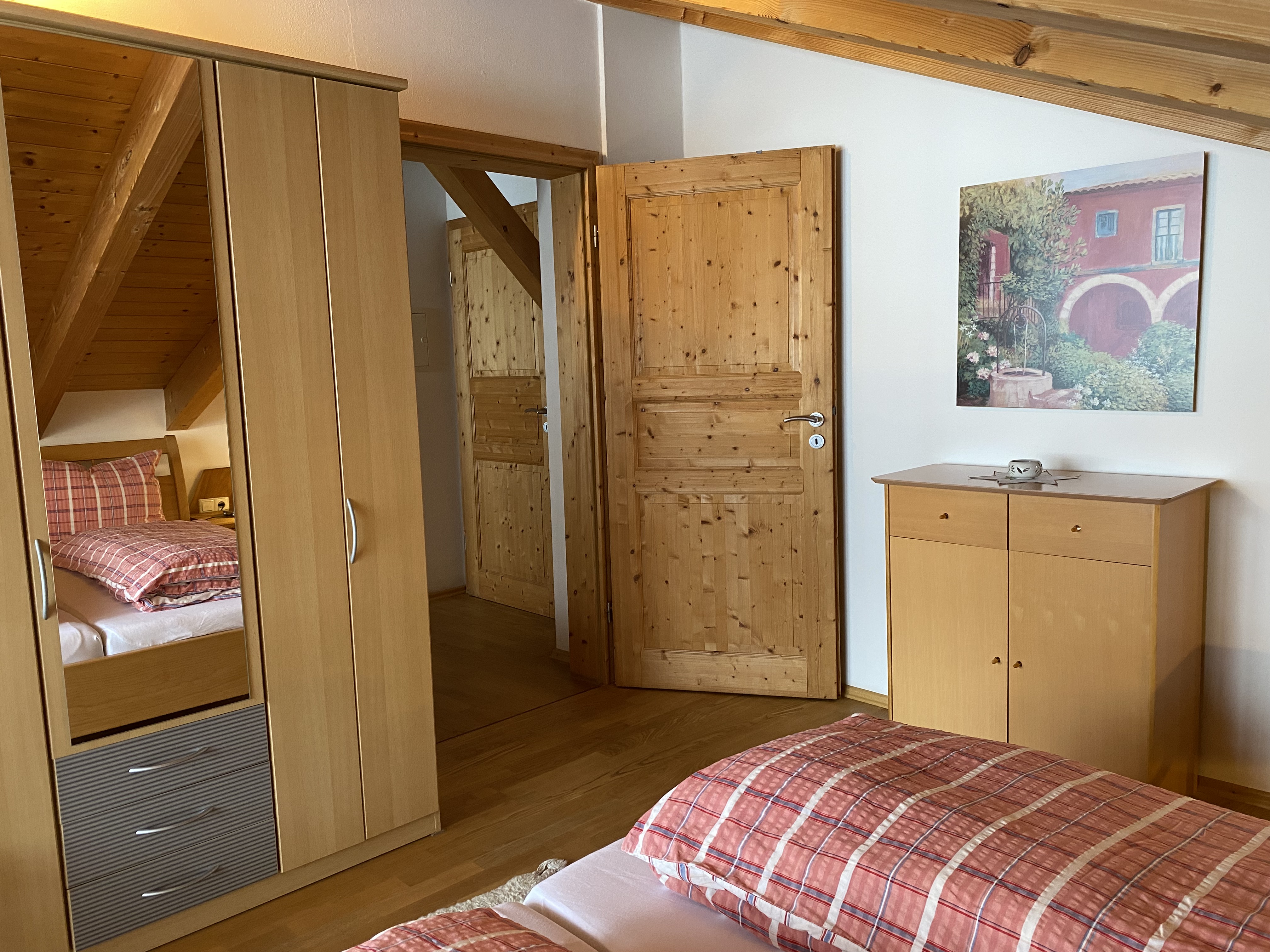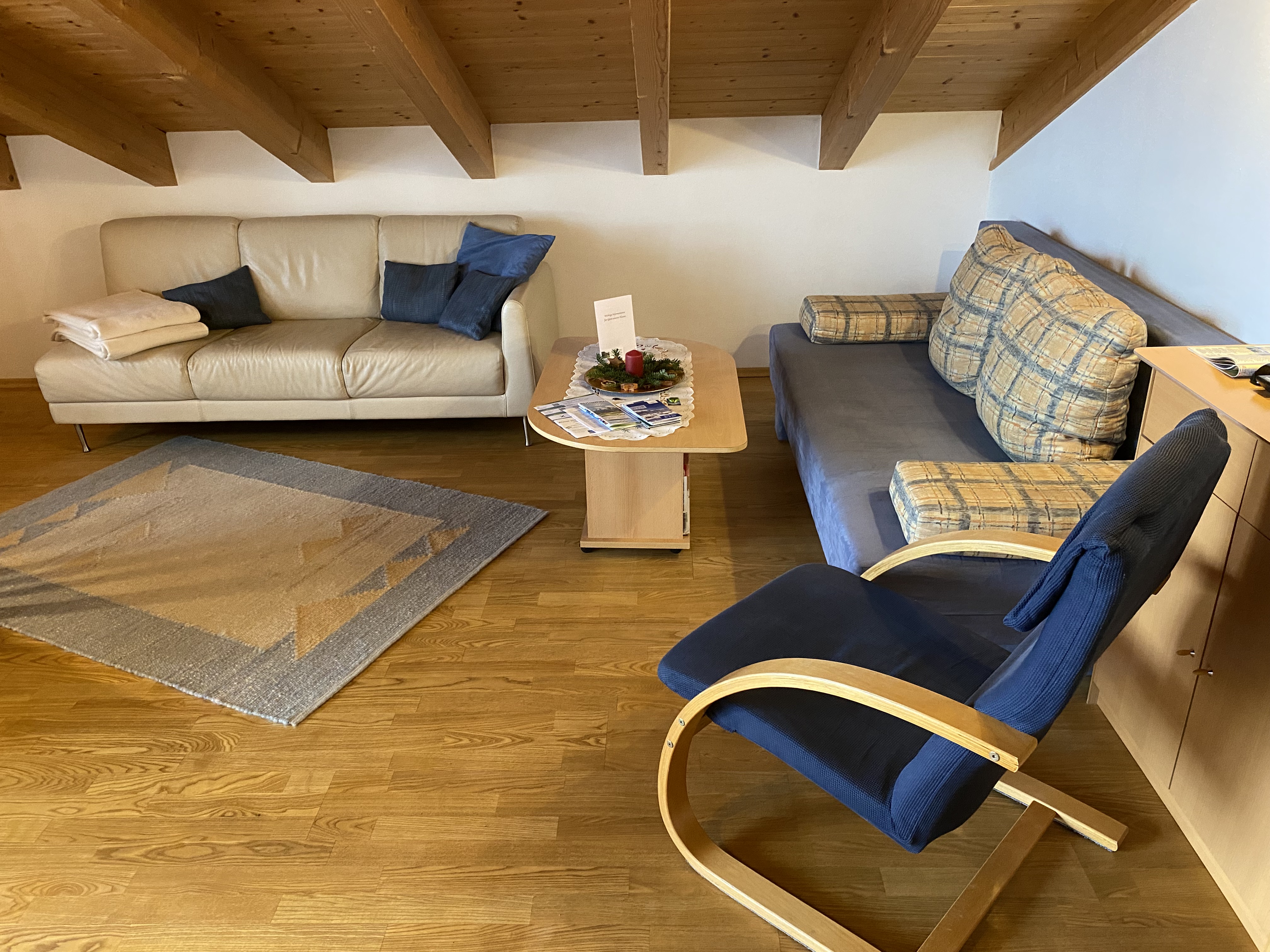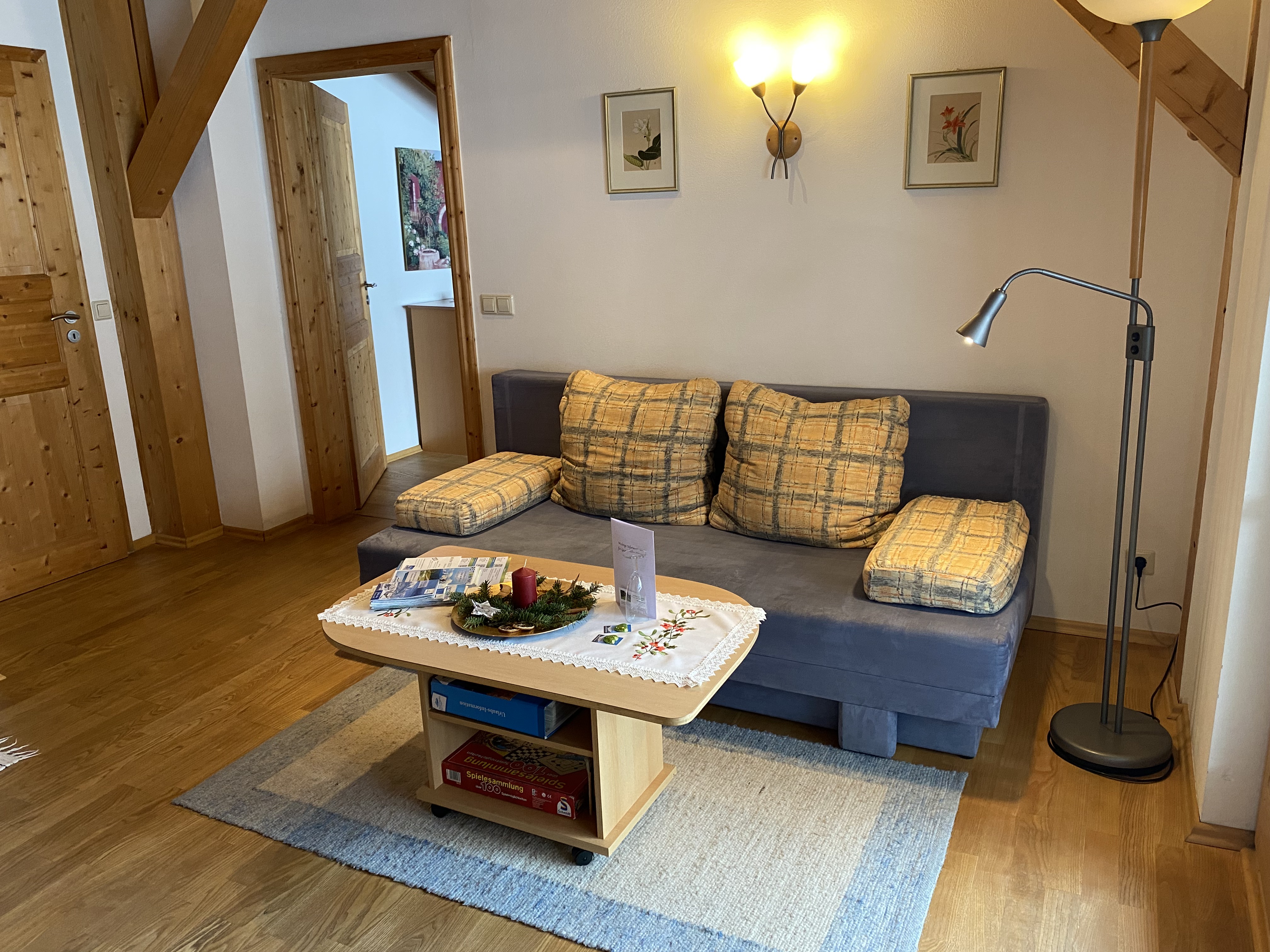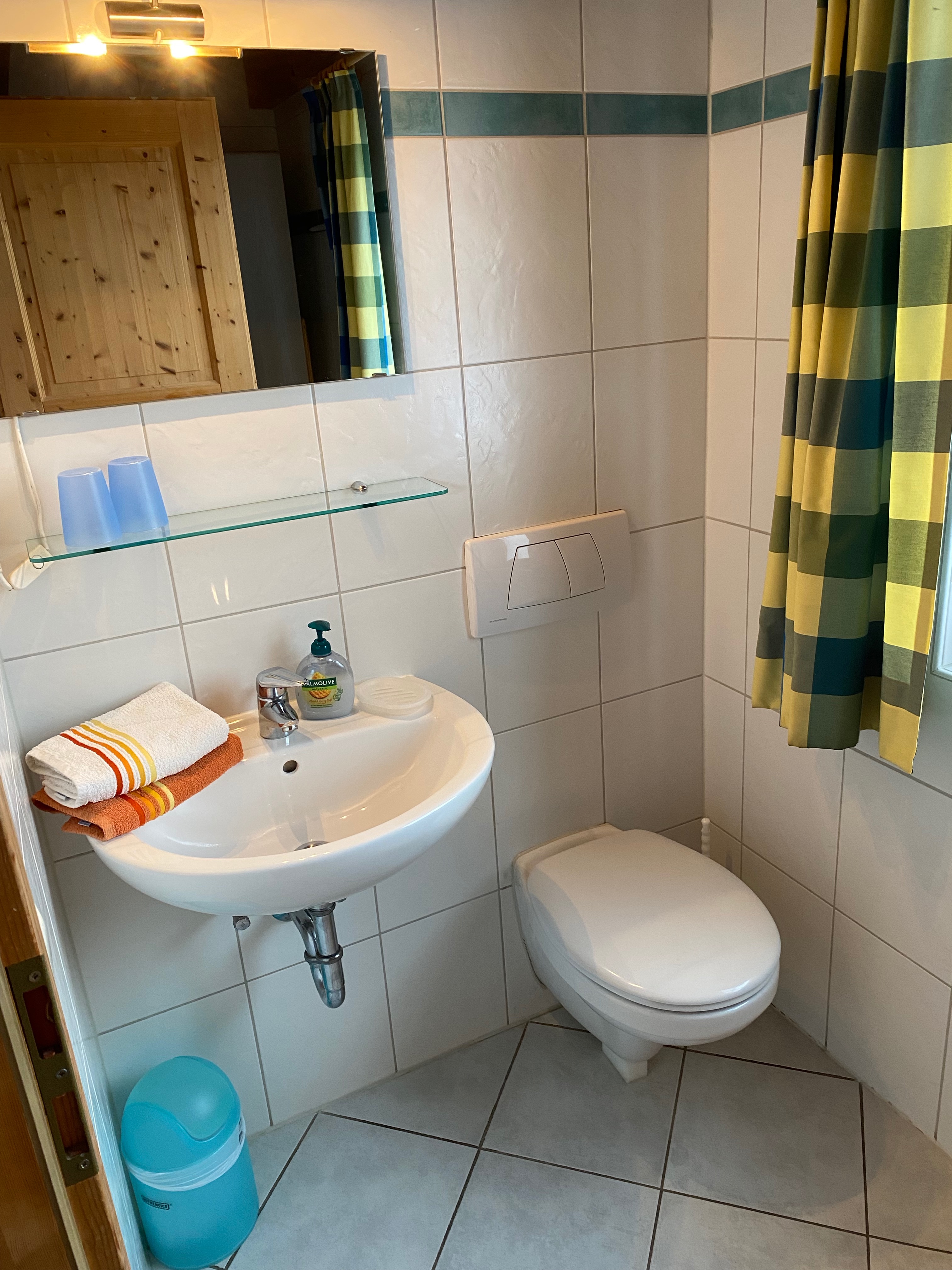 Die nach Osten und Süden orientierte Wohnung im 1. Stock bietet Platz für 2 Personen. Sie verfügt über einen Wohn-/Schlafraum mit Doppelbett, eine kleine Wohnküche mit gut ausgestatteter Küchenzeile, Tisch und Stühlen. Auf dem großen Balkon warten Stühle, ein großer Holzklapptisch und Sonnenschirm sowie ein sehr schöner Ausblick auf den Ortskern und die umliegenden Berge auf unsere Gäste.