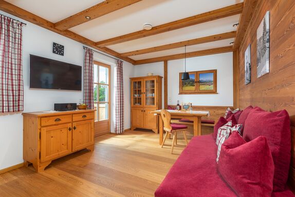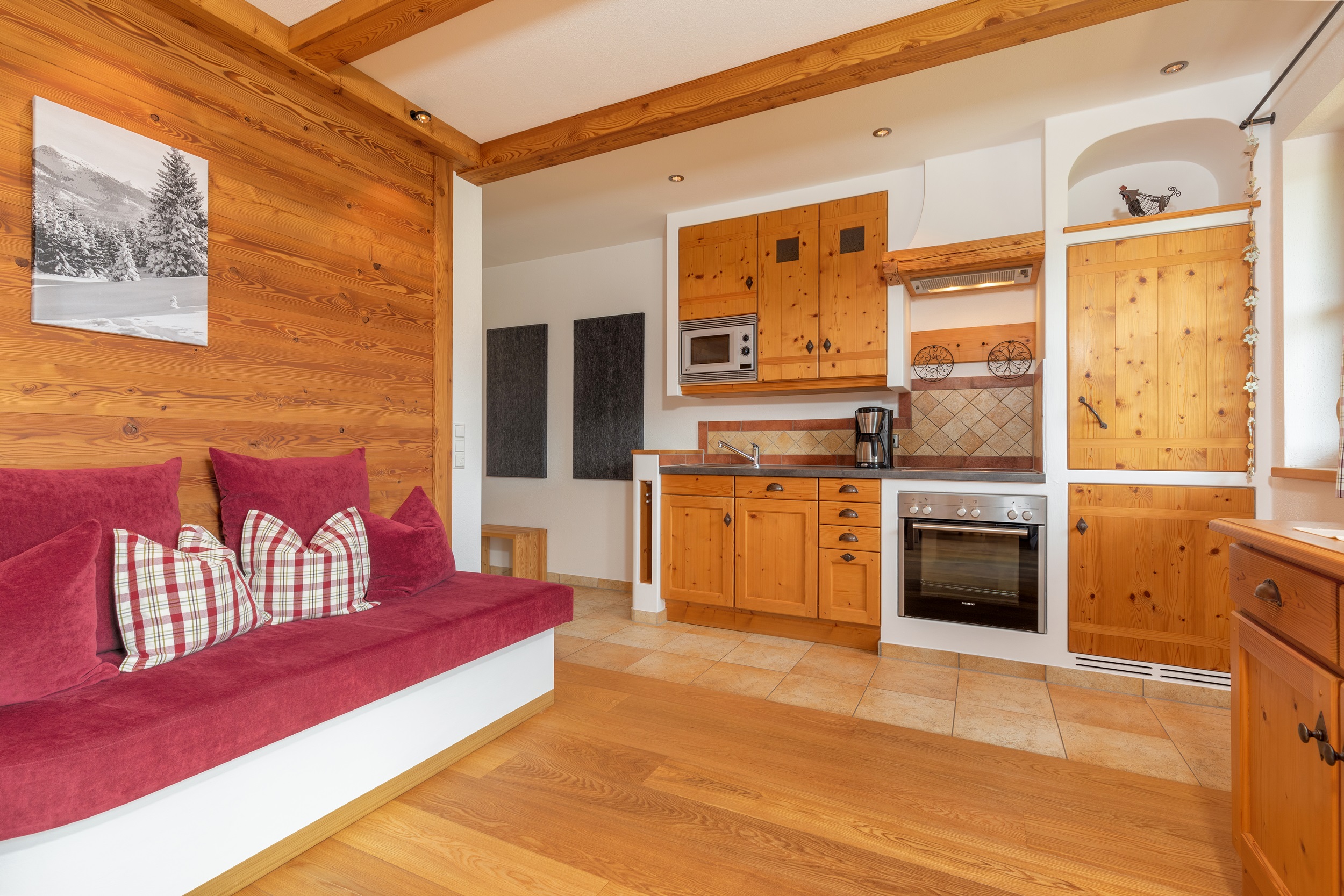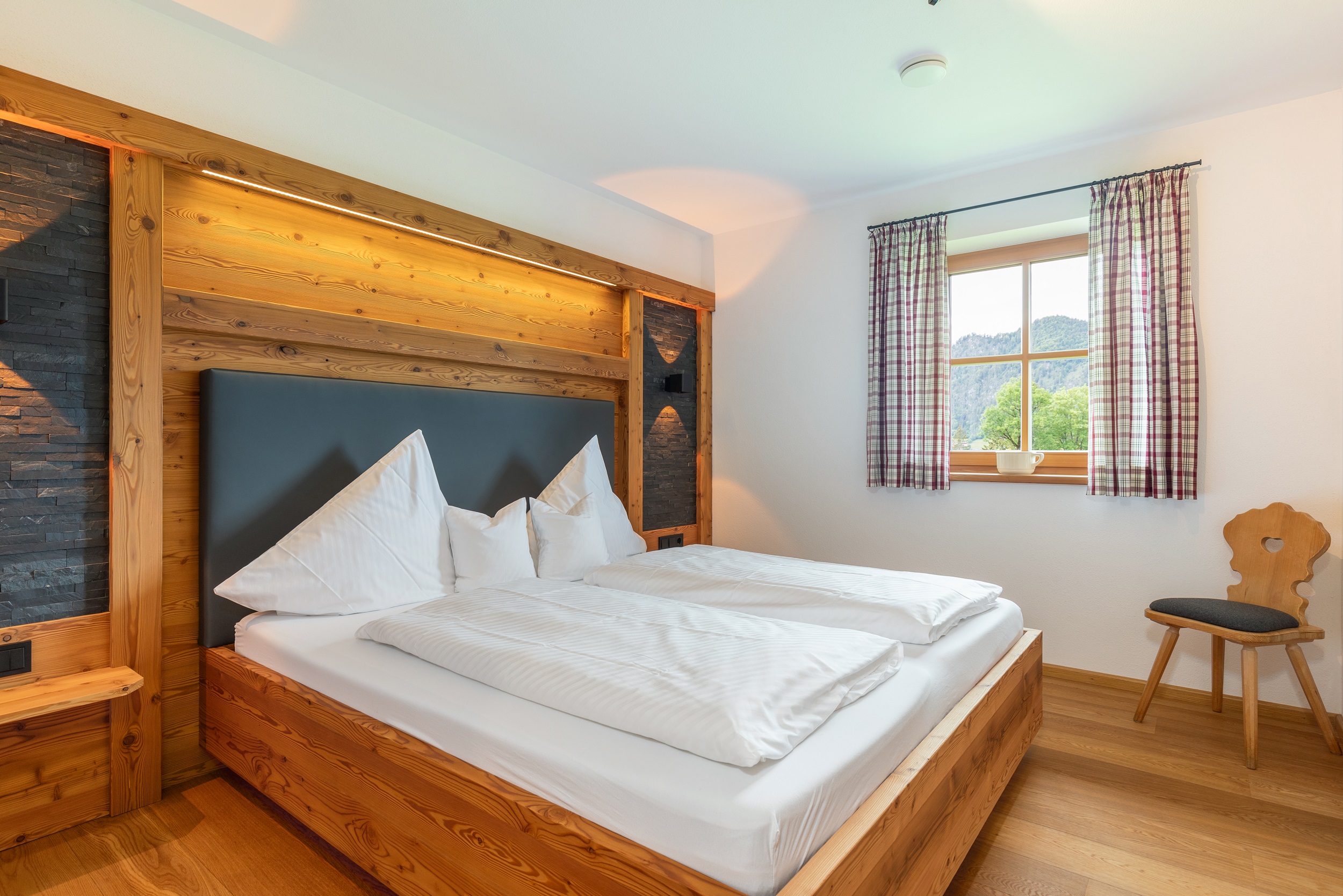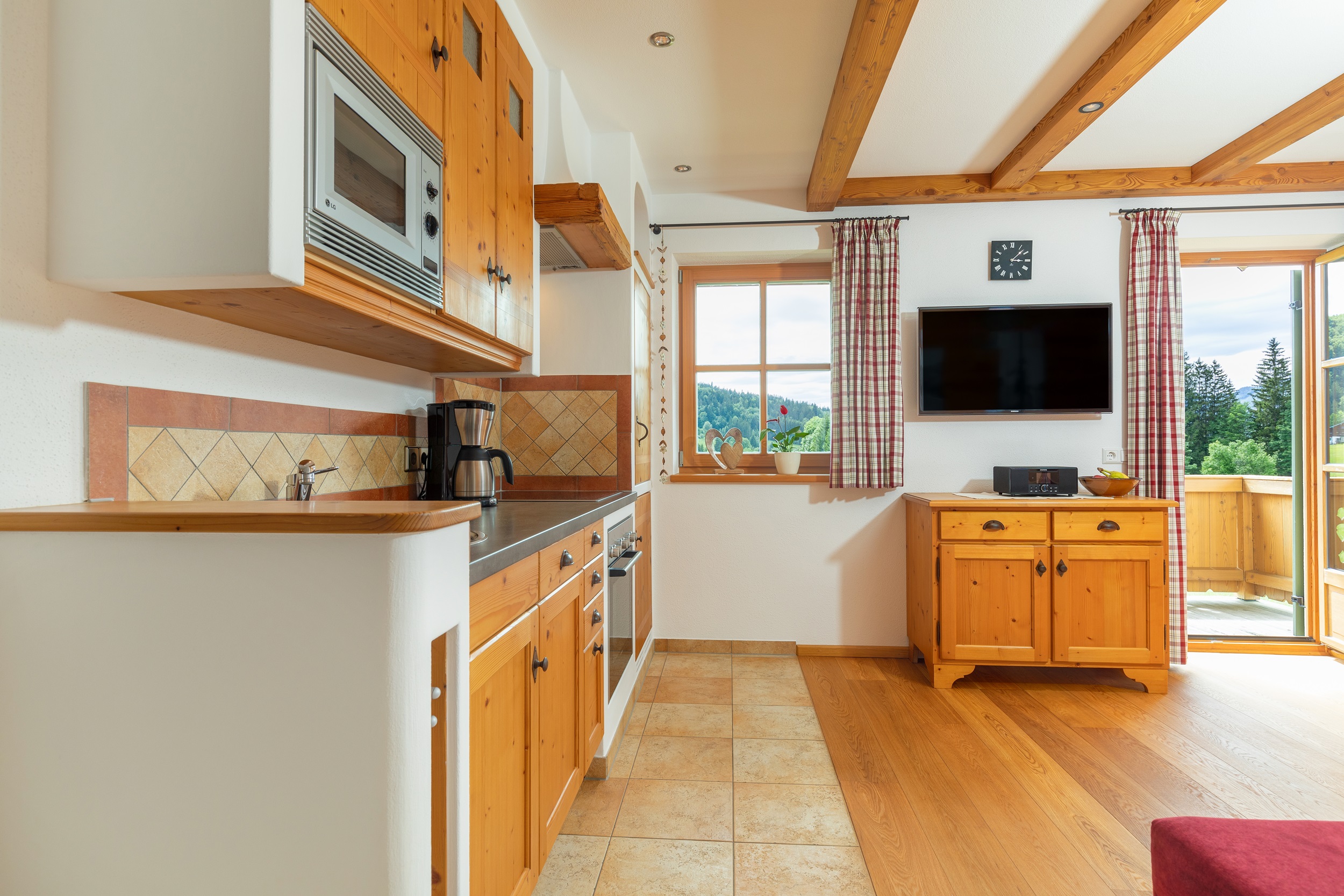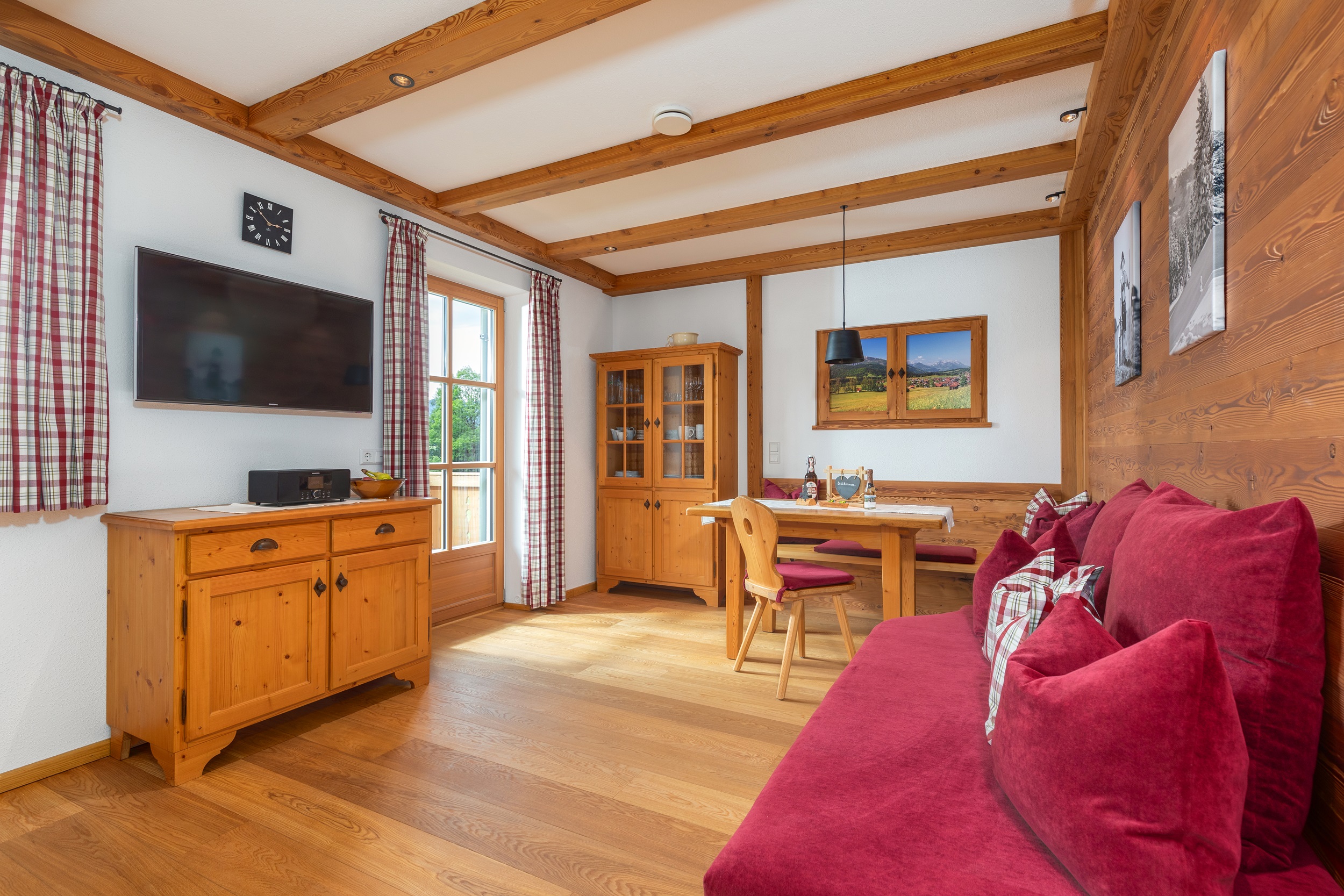 Die gemütliche, neu in 2024 renovierte, Zwei-Zimmer-Ferienwohnung im 1.OG hat eine Größe von 45m². Von dem sonnigen Westbalkon genießen Sie einen freien und unverbauten Blick auf die Reit im Winkler Bergwelt. In der gemütlich eingerichteten Wohnküche mit Essecke und Sofa sowie Flachbildschirm und DVD-Player können Sie den Urlaub so richtig genießen. Die Küchenzeile ist mit Geschirrspüler, Backofen, Mikrowelle und 4-Plattenceranfled ausgestattet. Kaffeefilter, Zucker, Reinigungszubehör und eine kleine Auswahl an Teesorten sowie Gewürze gehören bei uns zur Grundausstattung dazu. In dem Schlafzimmer befinden sich Massivholzmöbel, zudem kann der Schlafbereich feldfrei geschaltet werden, so dass einem erholsamen Schlaf nichts mehr im Wege steht. Bei der Gestaltung der Wohnung haben wir besonderen Wert auf einen ökologischen und natürlichen Wohnungsbau gelegt. Eine kontrollierte Wohnraumlüftung, Wärme für die Fußbodenheizung aus unserer Hackschnitzelheizung und Holzböden sorgen zusätzlich für eine wohnliche, harmonische und allergikergerechte Nutzung. Bett- und Tischwäsche sowie Handtücher sind ausreichend vorhanden. Genießen Sie einen erholsamen Urlaub bei uns im Haus.
