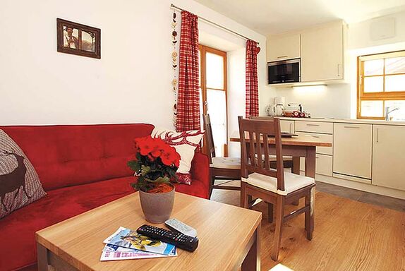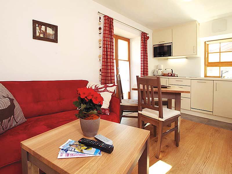 Helle und sonnige 2-Zimmer-Ferienwohnung im 1.OG mit einer Größe von ca. 34m². Der große rundum laufende Balkon bietet neben dem wunderbaren Bergblick, Sonne zu jeder Tageszeit. Die Küchenzeile ist mit einem Geschirrspüler ausgestattet und bietet allen Komfort um eine leckere Mahlzeit zuzubereiten. Im gesamten Wohn-und Schlafbereich wurde hochwertiger Parkettboden verlegt. Das komplett neu eingerichteten Bad mit Badewanne lädt nach einem Wander/ Ski-Tag zum Entspannen ein. Für einen gemütlichen Fernsehabend steht Ihnen sowohl im Wohn- als auch im Schlafraum ein Flachbildschirm TV und ein DVD-Player zur Verfügung. Bettwäsche und Handtücher sind selbstverständlich ausreichend vorhanden.
