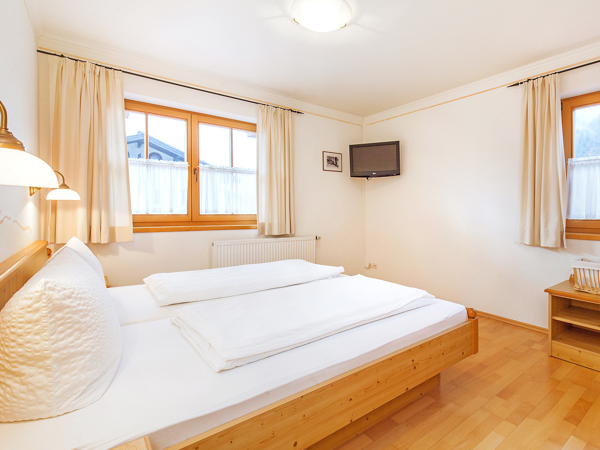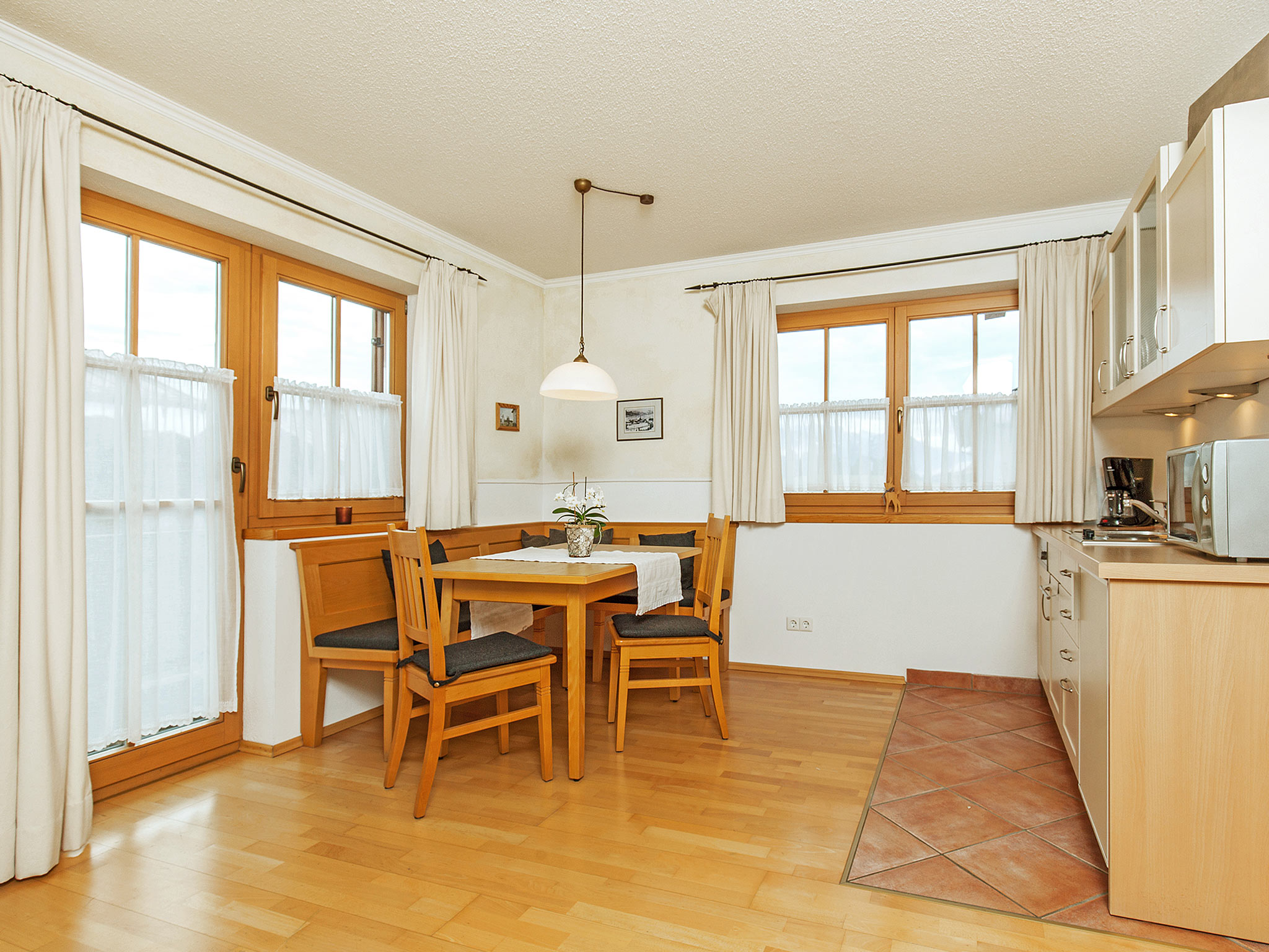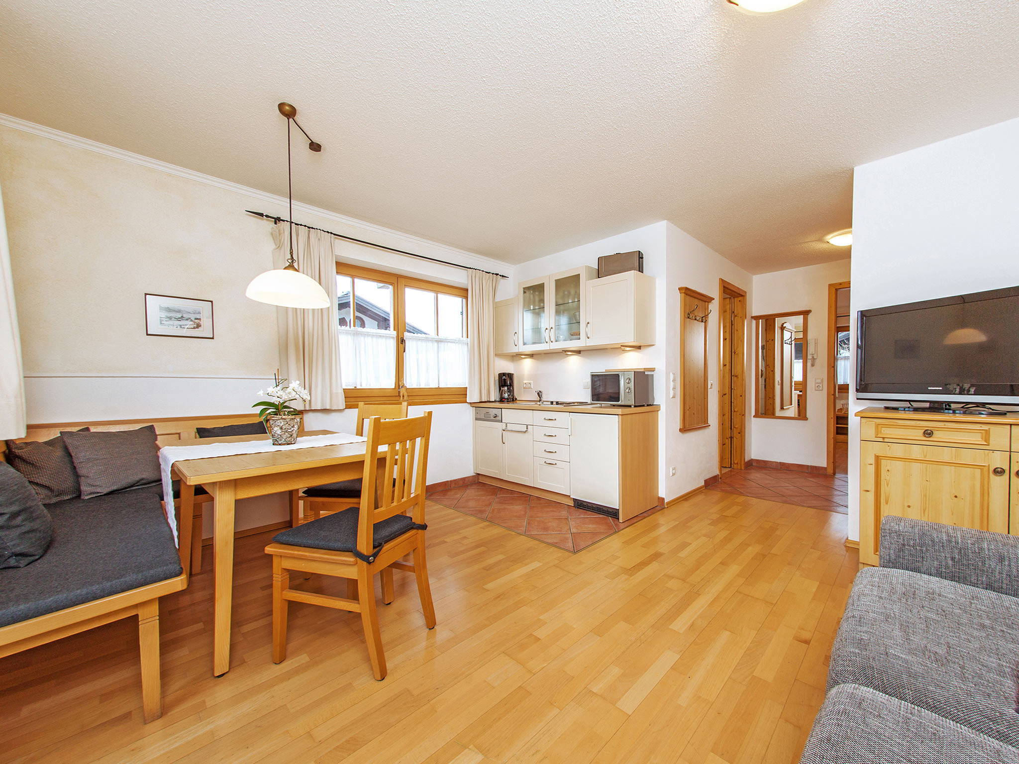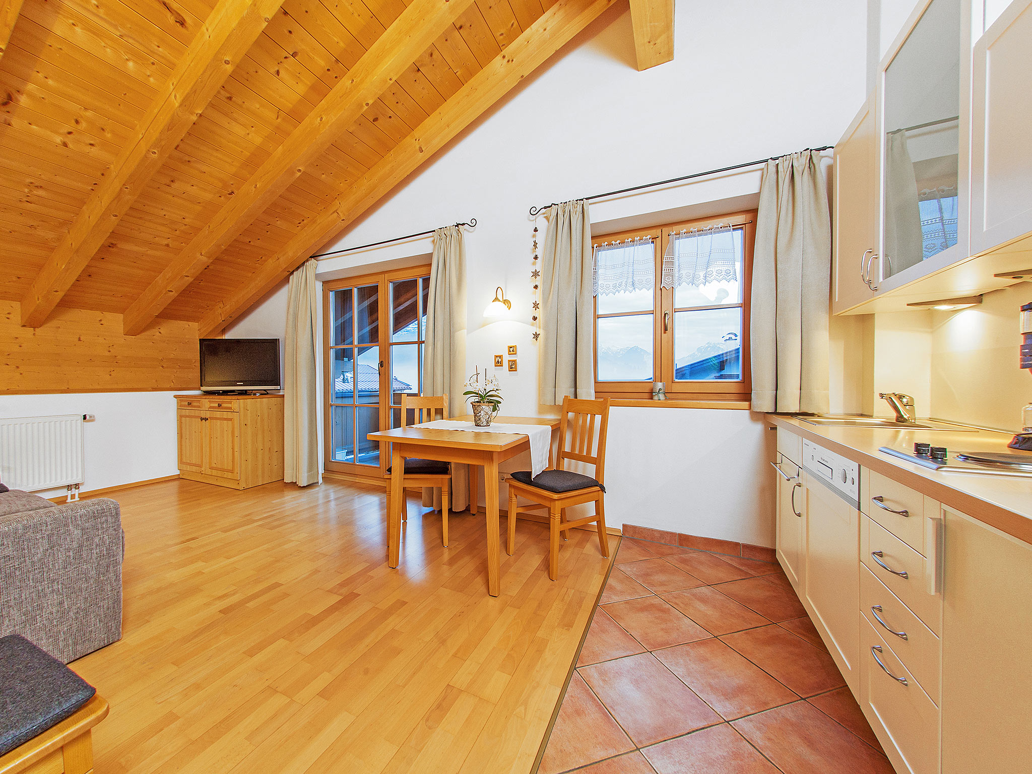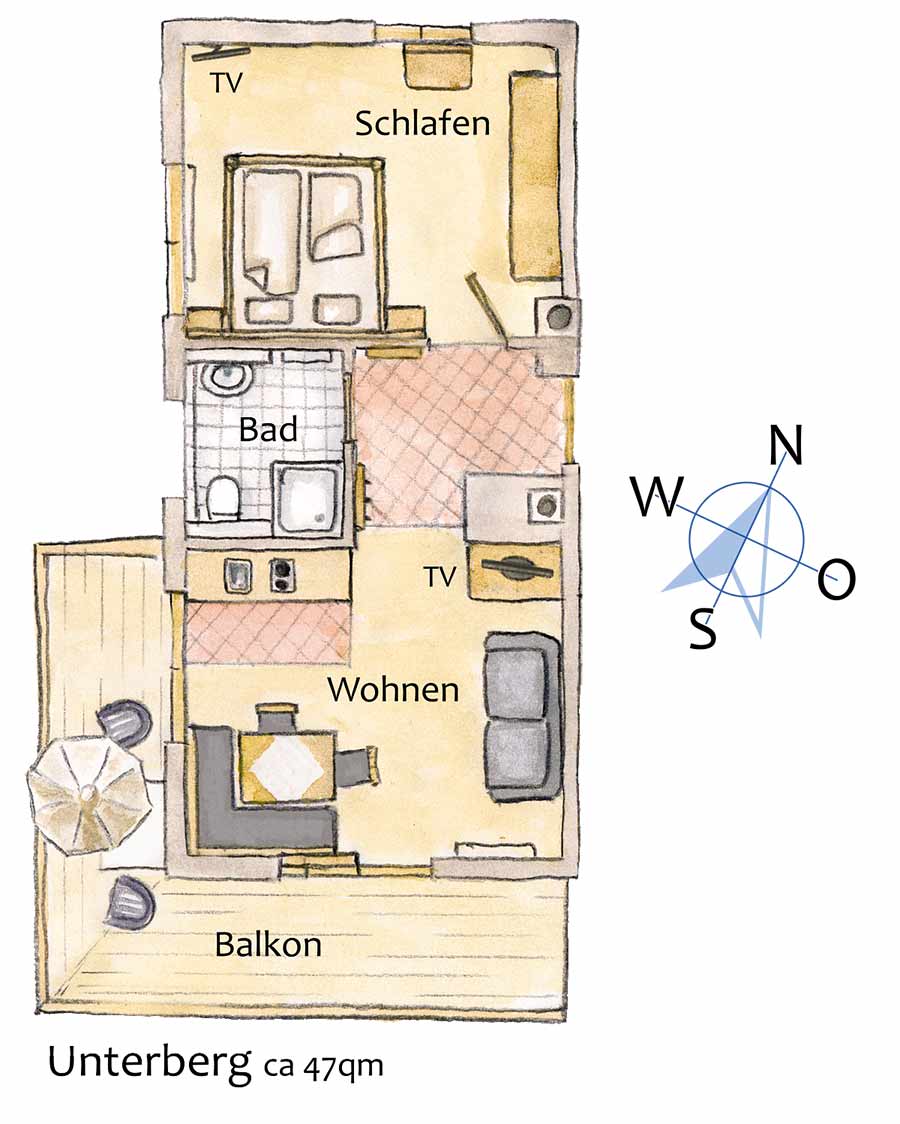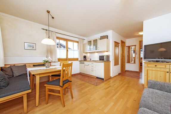 Der große, umlaufende Balkon nach Süden und Westen bietet freien Blick ins Kaisergebirge. Das großzügige 2-Zimmer-Appartement Unterberg im 1. OG, hat eine Größe von ca. 47 m². An der gemütlichen Essecke im Wohnraum können Sie die selbst zubereiteten Mahlzeiten genießen. Die Küchenzeile ist mit Geschirrspüler und Mikrowelle ausgestattet. Allergikergerecht wurde in der gesamten Wohnung hochwertiges Echtholz-Parkett verlegt. Im Wohnraum lässt sich das Sofa ausklappen und bietet Platz für eine Person. Bettwäsche und Handtücher sind ausreichend vorhanden und werden nach Ihren Wünschen gewechselt. Für den Fernsehabend steht Ihnen ein DVD-Player sowie je ein Fernsehgerät in Wohn- und Schlafzimmer zur Verfügung. Die CD-Radio-Anlage komplettiert die Ausstattung. In unseren Badezimmern bekommen Sie keine kalten Füße! Dafür sorgt die ganzjährig beheizte Fußbodenheizung.