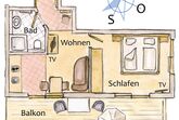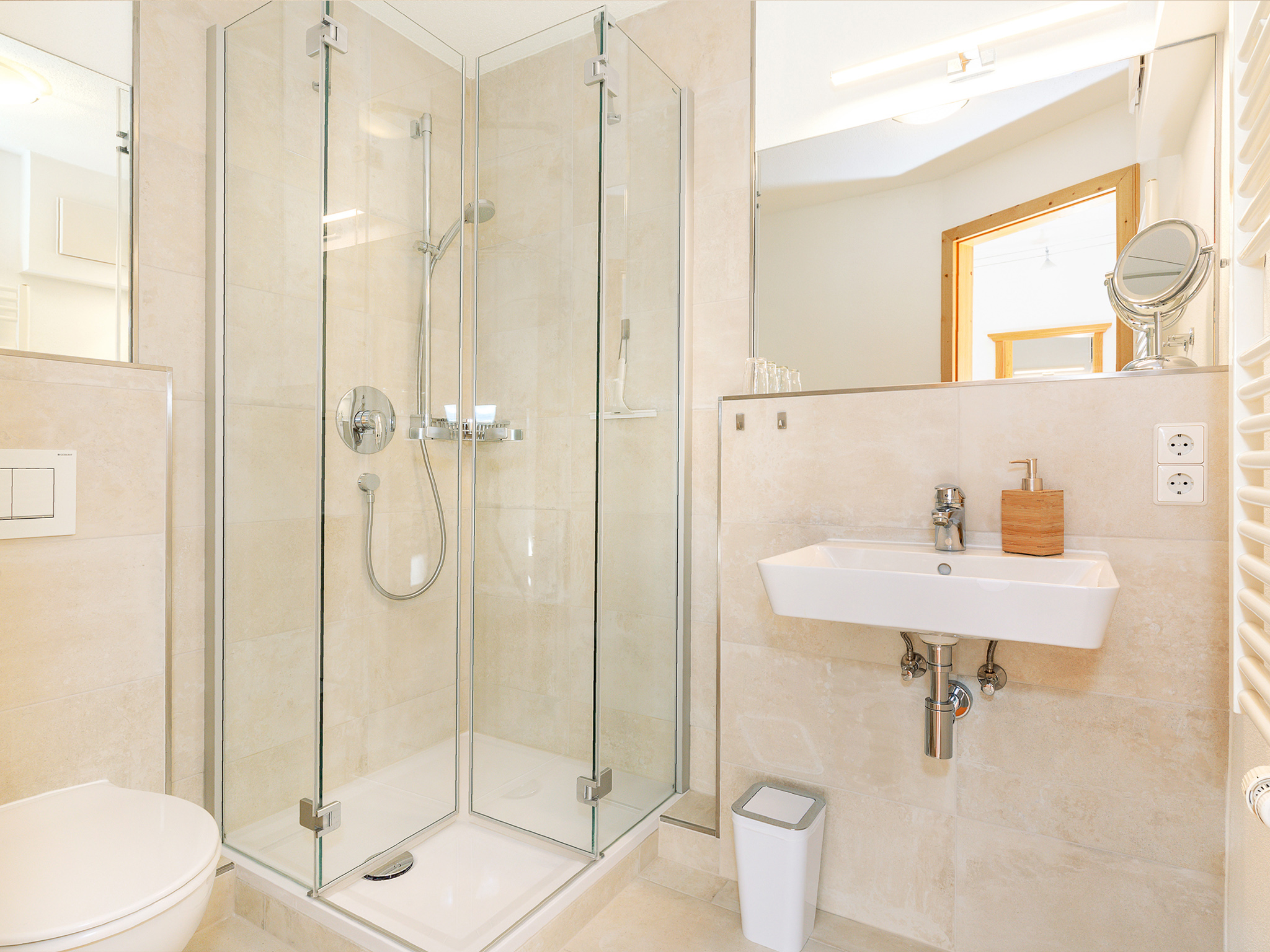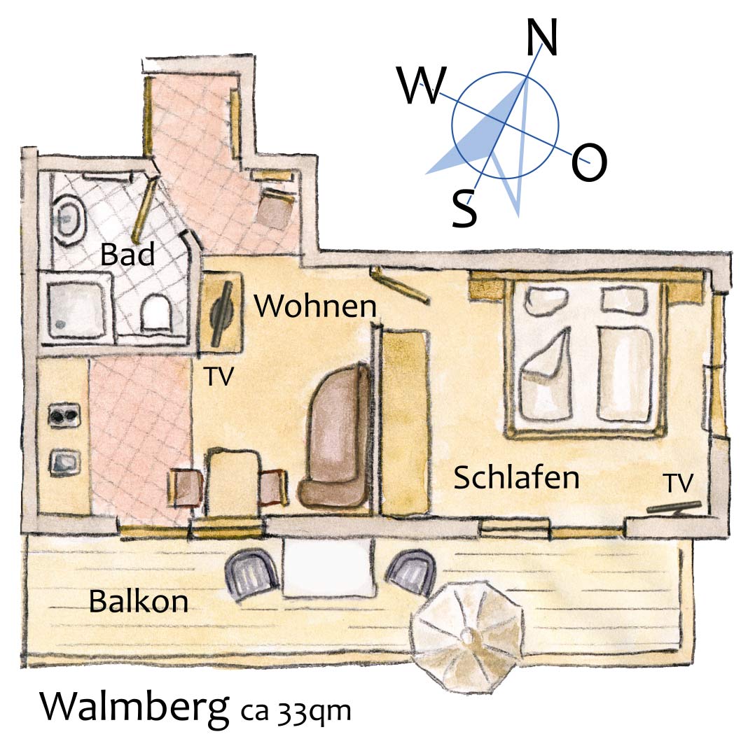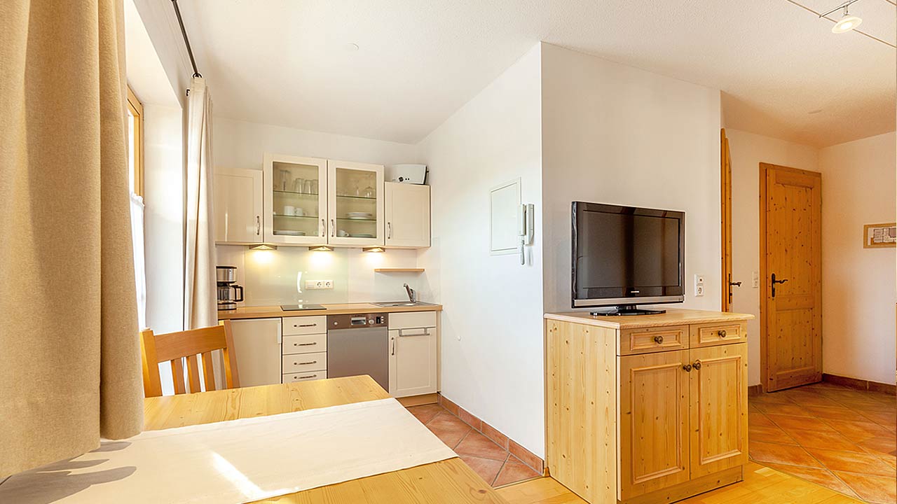 Sonnige 2-Zimmer-Ferienwohnung im 1.OG, Größe ca. 33 m². Der große Süd-Balkon bietet freien Blick ins Kaisergebirge und den Unterberg. An der kleinen Essecke im Wohnraum können Sie die selbst zubereiteten Mahlzeiten genießen. Die Küchenzeile ist mit einem Geschirrspüler ausgestattet. Allergikergerecht wurde in der gesamten Wohnung hochwertiges Echtholz-Parkett verlegt. Bettwäsche und Handtücher sind ausreichend vorhanden und werden nach Ihren Wünschen gewechselt. Für den Fernsehabend steht Ihnen ein DVD-Player sowie je ein Fernsehgerät in Wohn- und Schlafzimmer zur Verfügung. Die CD-Radio-Anlage komplettiert die Ausstattung. Das Duschbad im App. Walmberg wurde komplett renoviert. In unseren Badezimmern bekommen Sie keine kalten Füße! Dafür sorgt die ganzjährig beheizte Fußbodenheizung.