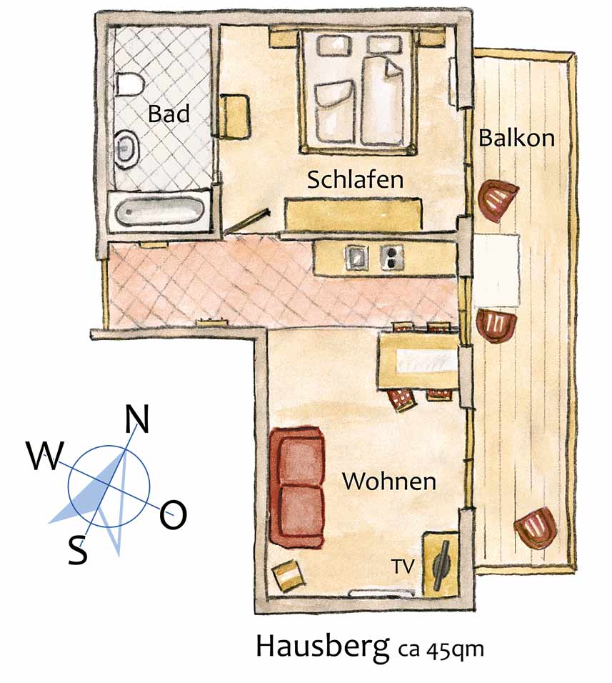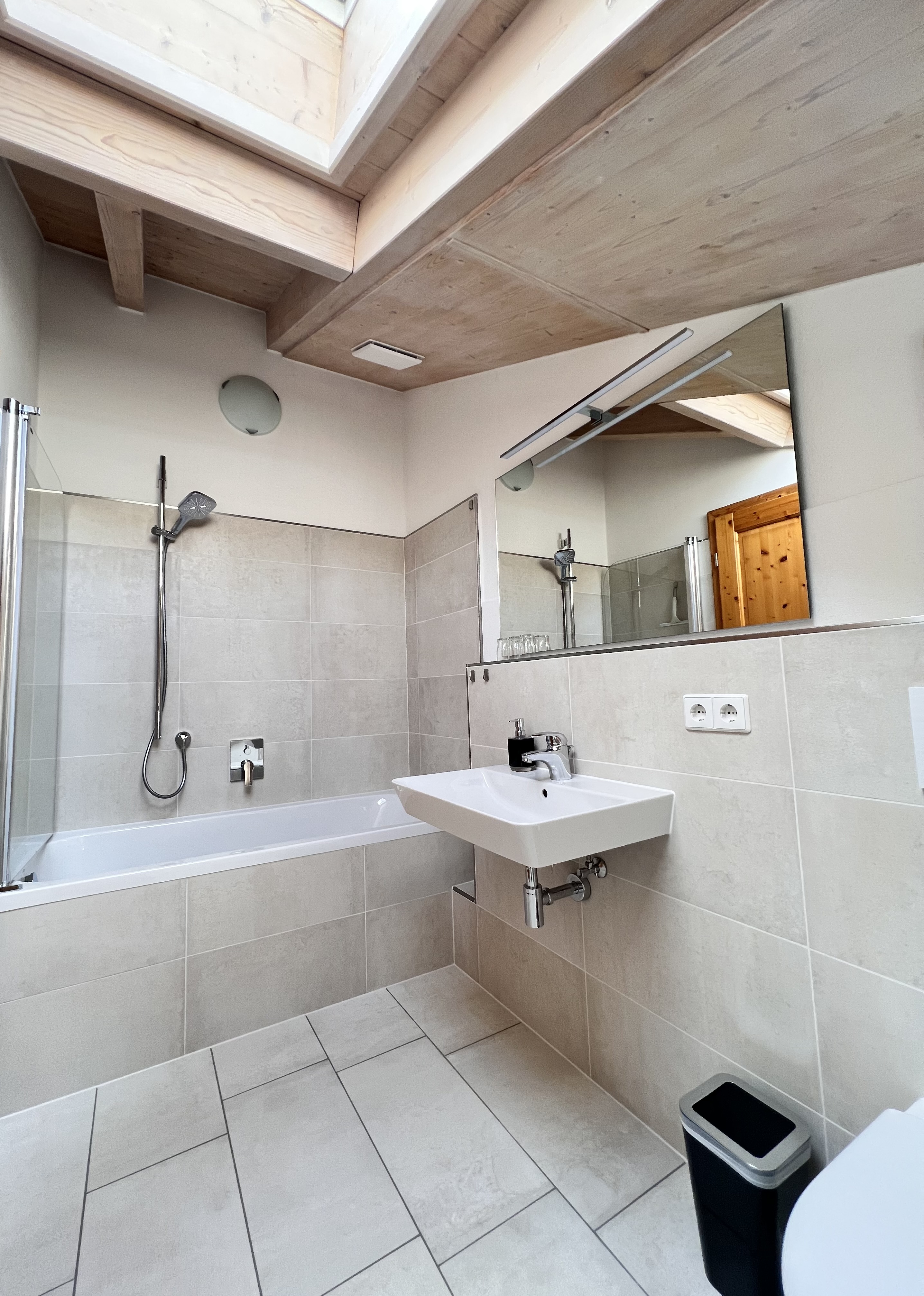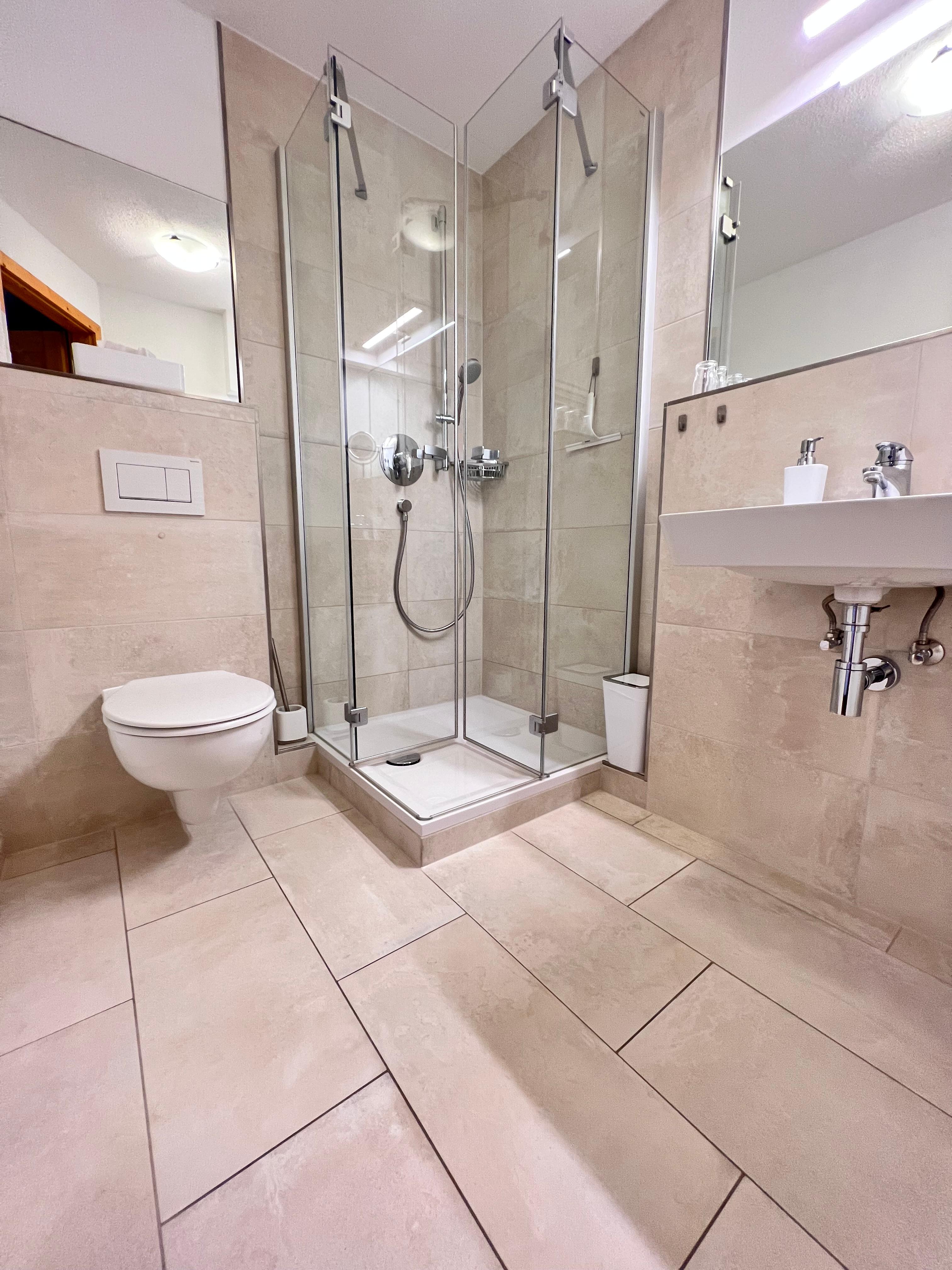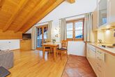 Großzügiges 2-Zimmer-Familien-Appartement im Dachgeschoss, ca. 45 m². Der große Ostbalkon bietet freien Blick ins Dorf und auf den Hausberg. An der gemütlichen Essecke im Wohnraum können Sie die selbst zubereiteten Mahlzeiten genießen. Die Küchenzeile ist mit einem Geschirrspüler sowie einer Mikrowelle ausgestattet. Allergikergerecht wurde in der gesamten Wohnung hochwertiges Echtholz-Parkett verlegt. Im Wohnraum lässt sich das Sofa ausklappen und bietet Platz für eine Person. Bettwäsche und Handtücher sind ausreichend vorhanden und werden nach Ihren Wünschen gewechselt. In unseren Badezimmern bekommen Sie keine kalten Füße! Dafür sorgt die ganzjährig beheizte Fußbodenheizung.