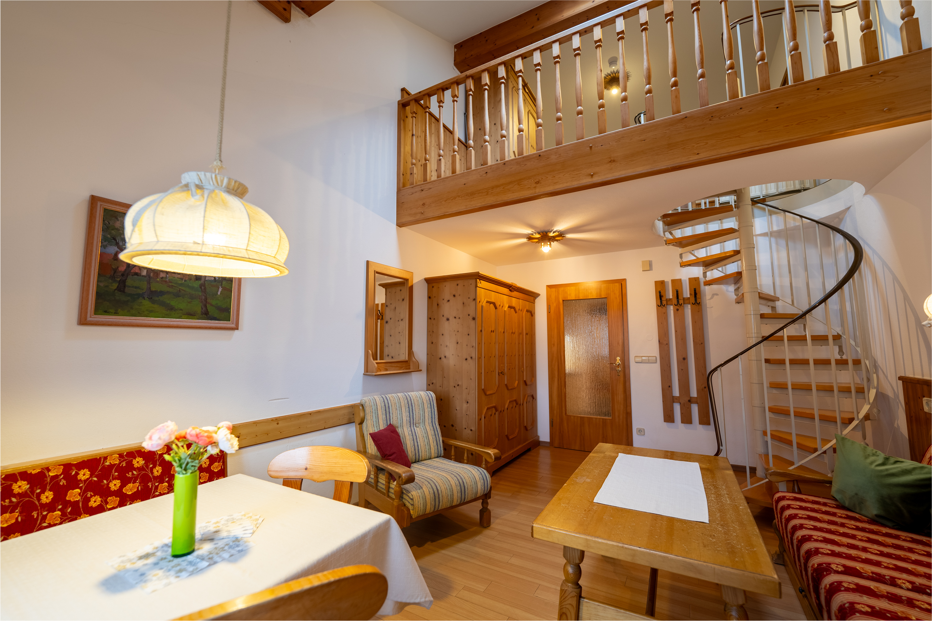 Die Galerie-Ferienwohnung (Wohnraum, Schlafraum, separate Küche und Dusche/WC) hat eine Größe von ca. 48 qm und befindet sich im 1. Obergeschoß. Der Balkon zeigt in Richtung Westen. Das Schlafzimmer ist über eine Wendeltreppe nach oben hin zu erreichen.