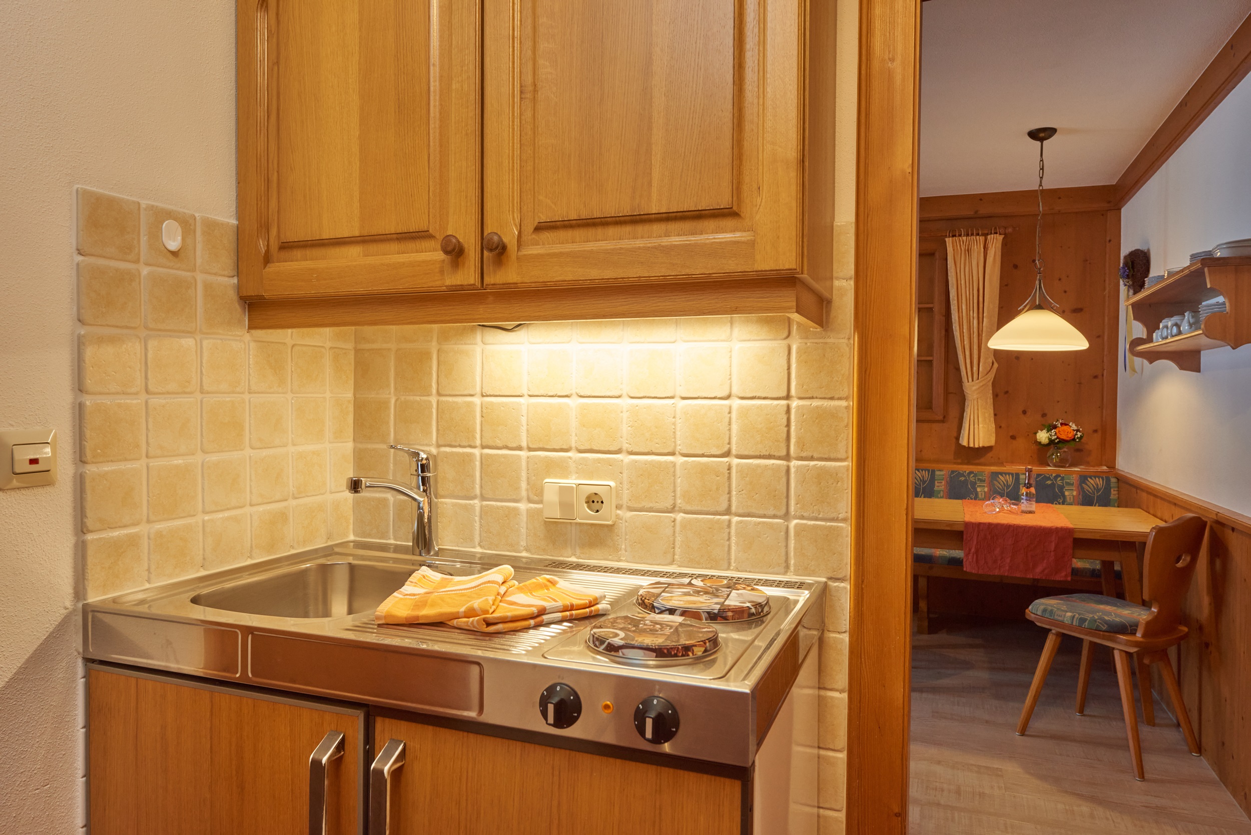 Im Landhausstil ausgestattete, sehr sonnige und ruhiggelegene 2-Raum Ferienwohnung*** im 1. OG (ca 38 qm). Der großzügige Westbalkon (Wäscheständer und Balkonmöbel) bietet einen tollen Blick auf den Unterberg und das Kaisergebirge.