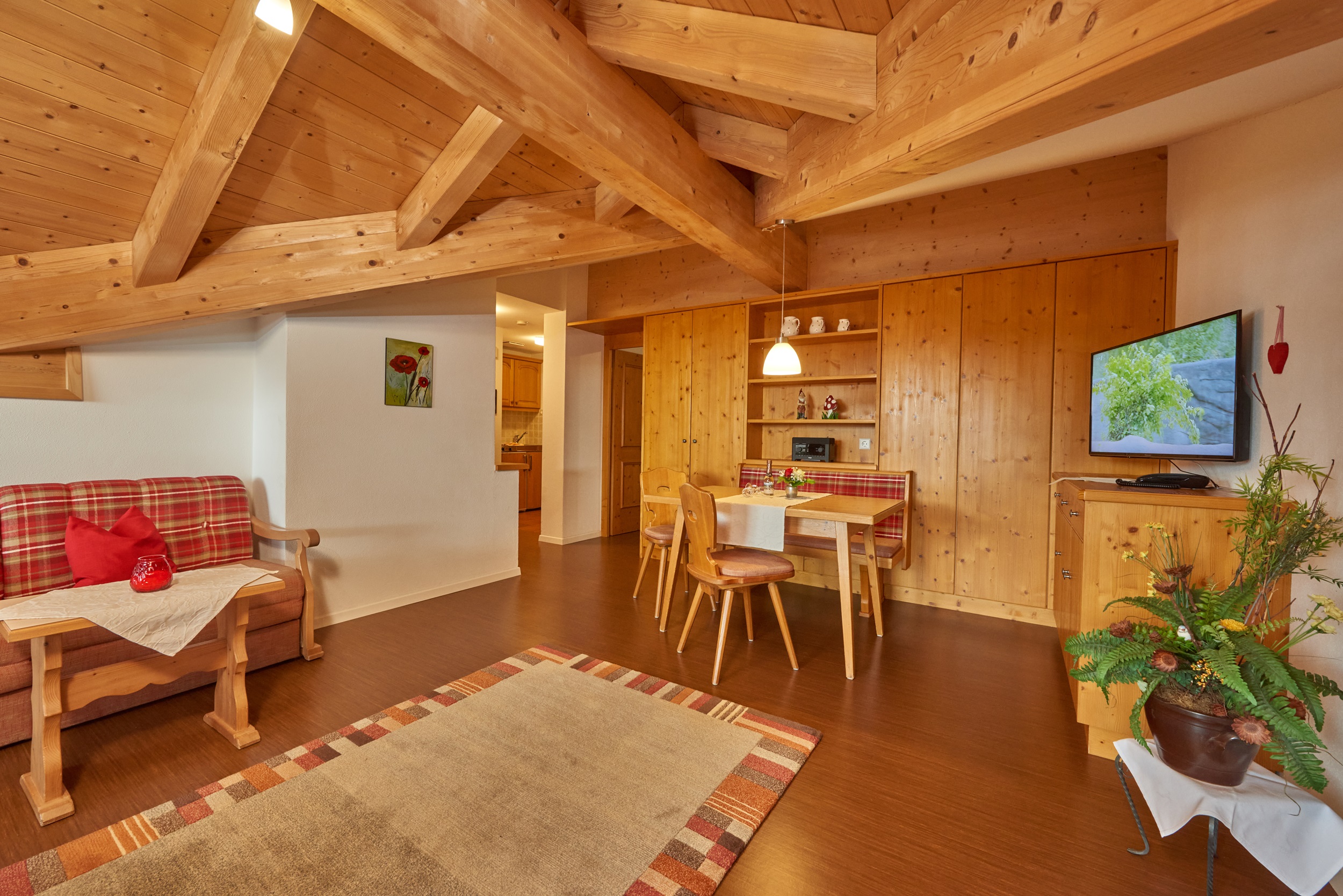 Flachbild-TV und eine Sitzgruppe, welche zum Schlafsofa umfunktioniert