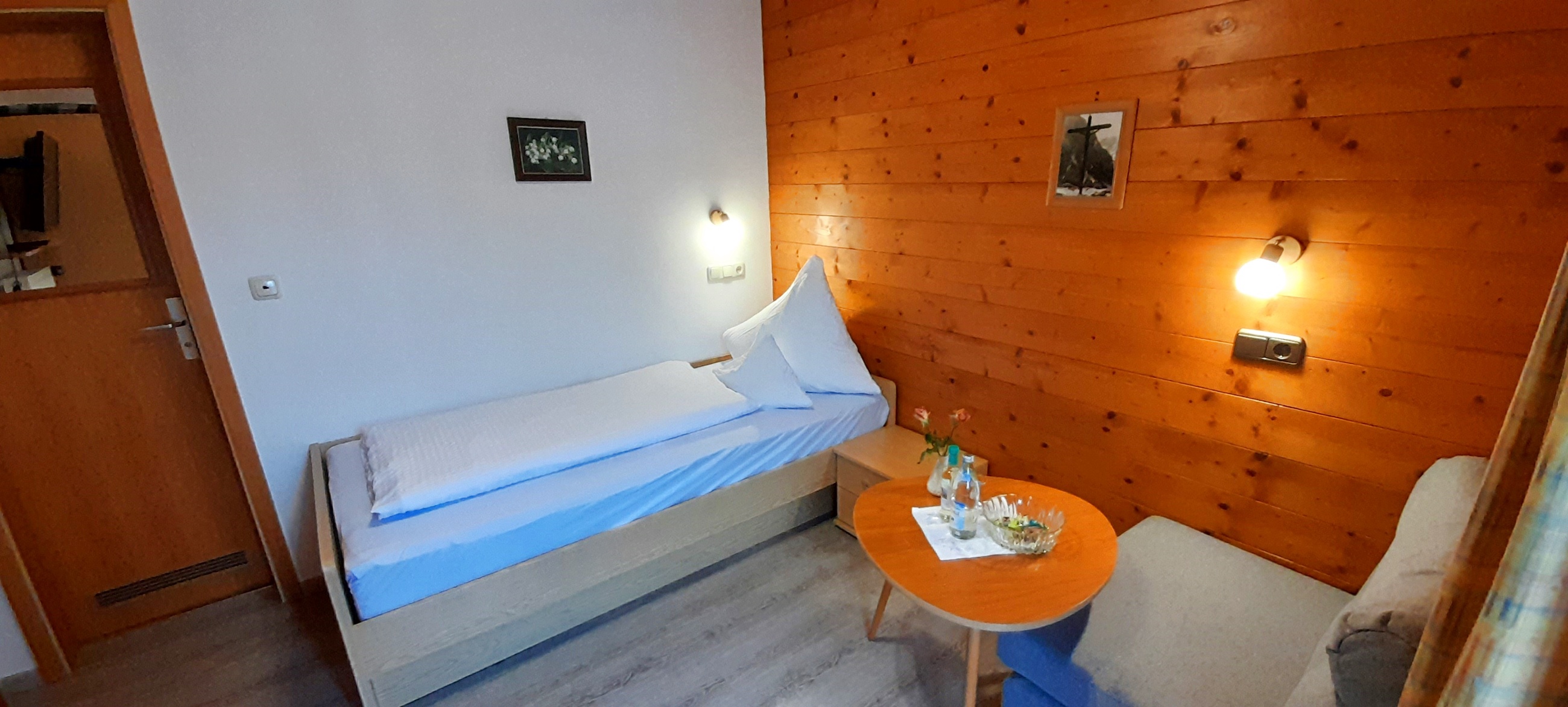 Unser Einzelzimmer Fellhorn befindet sich im 1. Stock, nach der Devise Klein aber Fein, hat einen gemütlichen Fernsehstuhl und einen Balkon in Richtung Hauszufahrt.