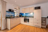 Gemütliche Wohnküche mit großem Panoramafenster (Erker), Wohnlandschaft mit Fernsehkippsessel, elektrischem Kaminfeuer, großflächigem Flachbildschirm mit DVD-Player, WLAN-Internet, Telefon. Küche mit Spülmaschine, 4er-Cerankochfeld mit Backofen, Mikrowelle, Kühlschrank mit Gefrierfach.