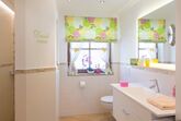 Geräumiges Bad mit Bad/WC und Wellnessdusche, Waschtischanlage und Außenfenster. Großzügige Diele mit Bank und Garderobe.