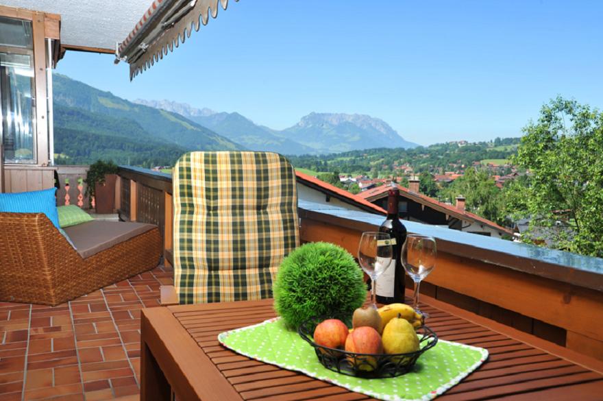 Genießen Sie das herrliche Panorama am rundumlaufenden Süd-/Westbalkon, ausgestattet mit Liegestühlen, Tisch, Markisen und moderner Relax-Lounge-Liege!