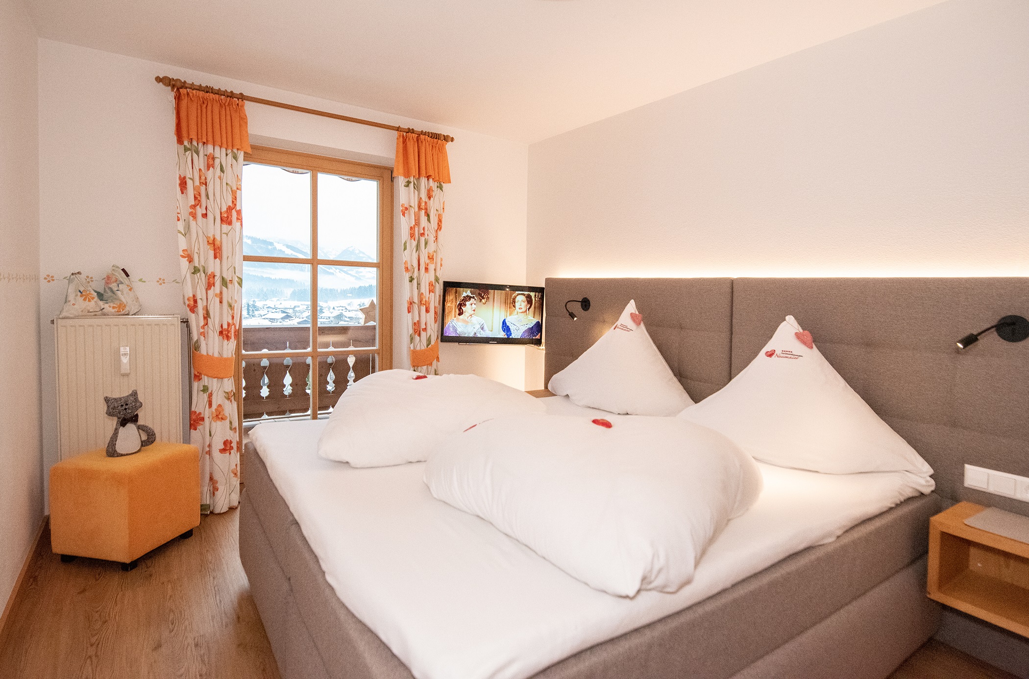 Am Morgen erwachen Sie ausgeruht und erholt im Schlafzimmer aus Zirbenholz mit seinen besonderen Eigenschaften! Das zweite Schlafzimmer ist mit einem vom Schreiner gefertigten modernen Boxspringbett eingerichtet. Beide Zimmer mit geräumigen Schiebetürenschrank, dazu Bergblick und Balkontüren!