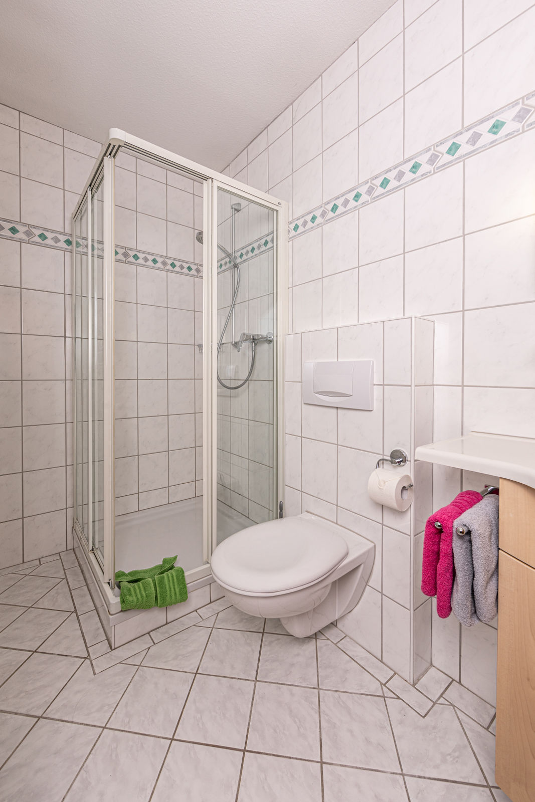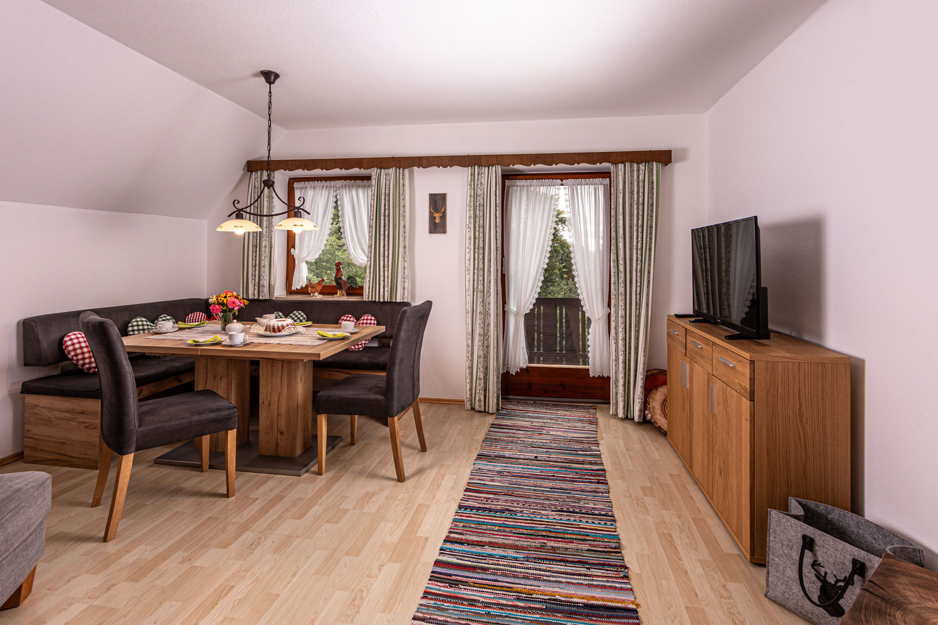 Die gemütliche Nichtraucher-Ferienwohnung bietet Platz für 5 Personen. Zu jedem der drei Schlafzimmer gehört ein eigenes Bad - ideal für Familien. In 2 Schlafzimmern befindet sich jeweils ein Doppelbett, im dritten ein Einzelbett. Das Wohnzimmer ist großzügig und gemütlich im ländlichen Stil eingerichtet und hat einen SAT-Flachbildschirm und Stereoanlage. Die Küche ist sehr gut ausgestattet mit Mikrowelle, Ceranfeld, Backofen und Geschirrspüler.