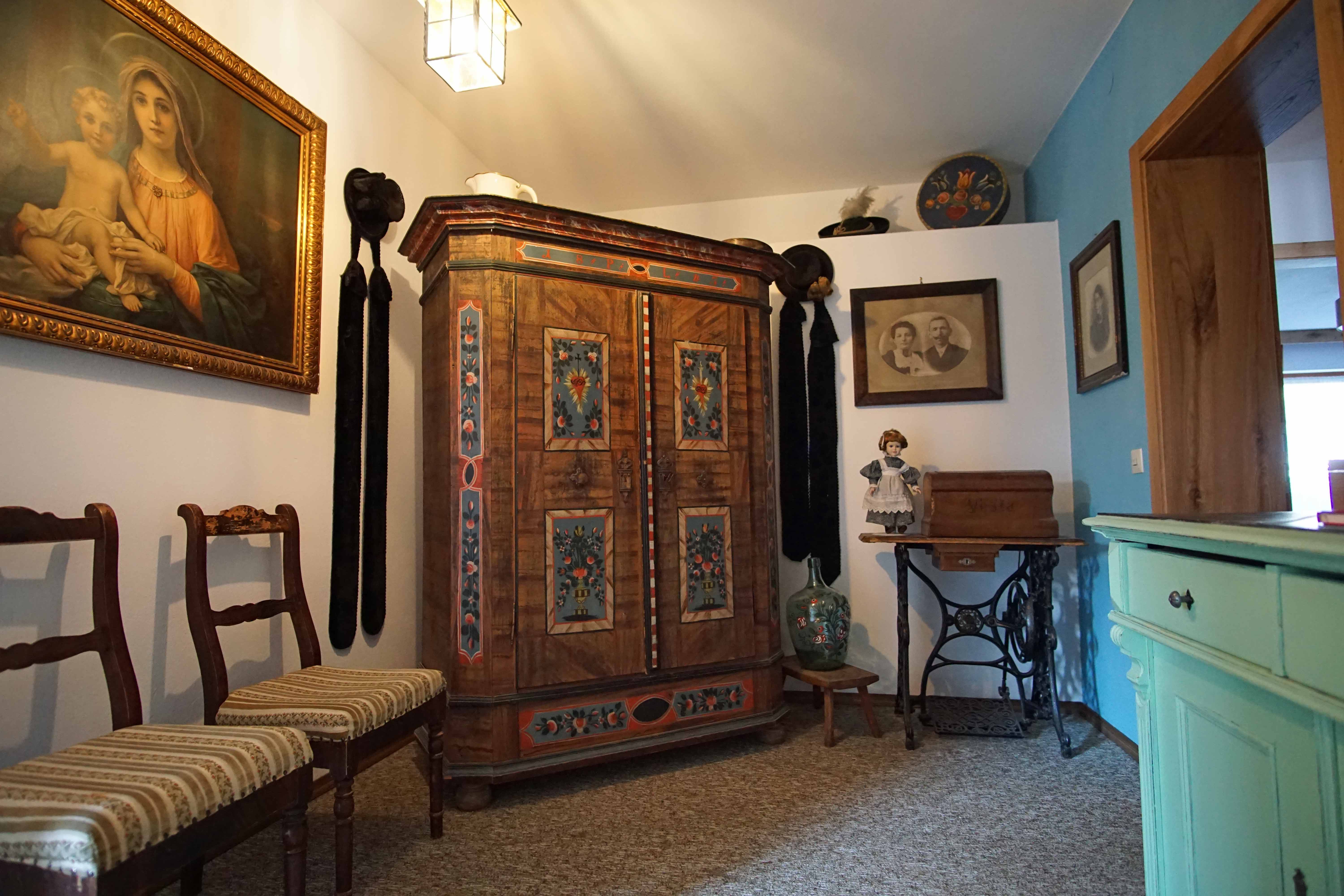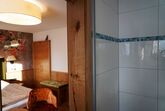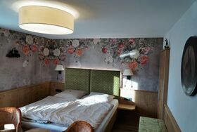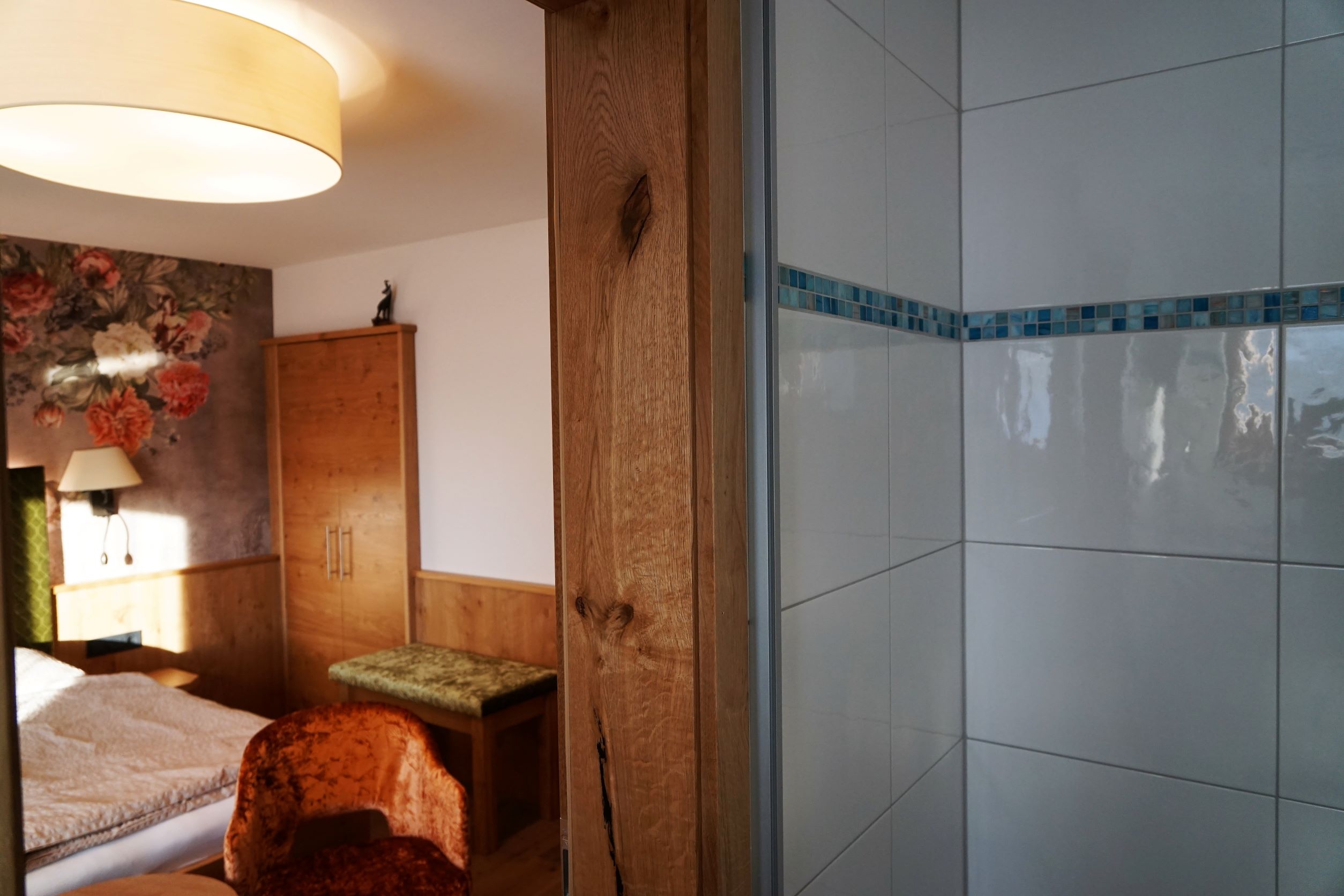 Außergewöhnliches Doppelzimmer mit liebevollen Details im extravaganten, alpinen Stil für 2 Personen, kleines, hochwertiges Badezimmer mit Tageslicht, Balkon und 32 Zoll Flachbildfernseher.