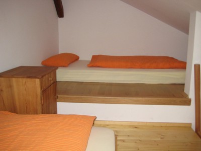 Gemütliches Appartement Vorgeher mit freiliegendem Dachgebälk. Schlafplatz mit zwei Betten und Wohnraum mit Schlafcouch, sind durch Raumteiler getrennt.