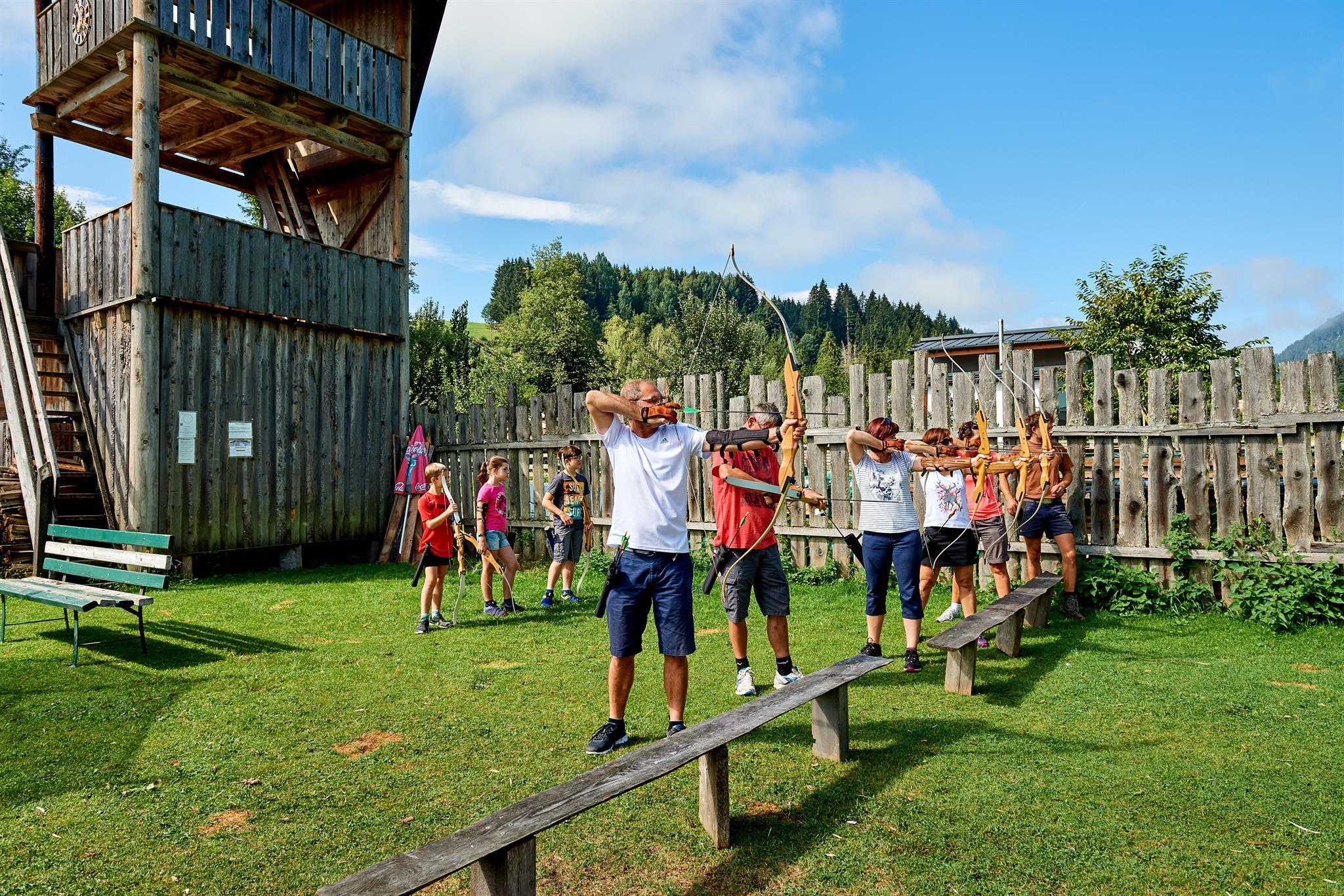 Sommer: Reiten, Fischen, Bogenschießen. Abwechslung und Gemütlichkeit, Ponywanderung, Traktorfahrt, Kletterwand. Am Dorfrand - freie Aussicht auf die umliegende Bergwelt, von 40.000 qm Wiese umgeben - viel Platz zum Herumtollen.