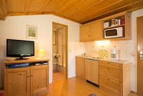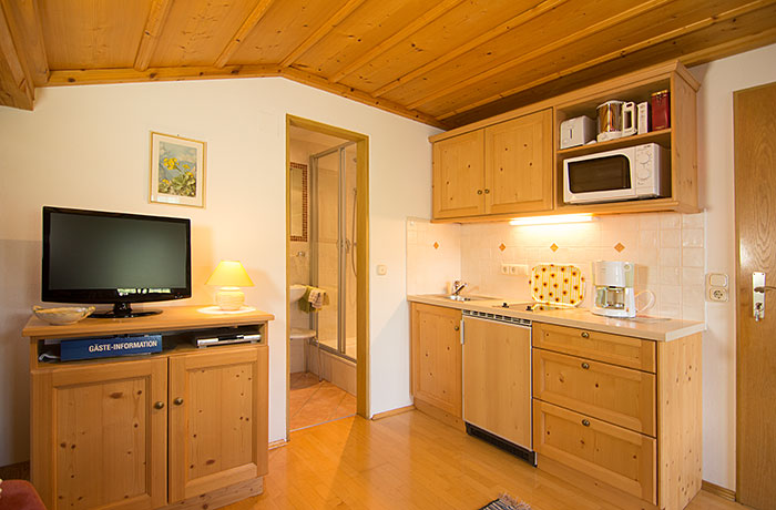 Die heimelige Wohnung wurde mit hochwertigen Möbeln von unserem Dorfschreiner mit viel Liebe zum Detail im heimischen Stil gefertigt. Das Doppelbett befindet sich in einer gemütlichen Dachschräge. Die Küchenzeile mit 2 Ceran-Kochfeldern, Mikrowelle, Wasser - Eierkocher, Toaster, Tassimo-Kapsel-Kaffeemaschine und vielen weiteren komfortablen Extras ausgestattet.