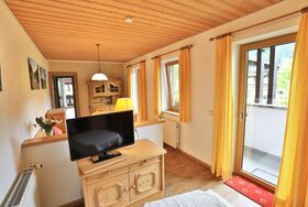 Großzügig konzipierte und bestens ausgestattete 2 Raum Wohnung. Schlafzimmer, Küche und Wohnzimmer mit 2 weiteren Schlafmöglichkeiten (Doppelbettcouch). 1. Etage West und Ostbalkon. Hochwertige Oberland Möbel.