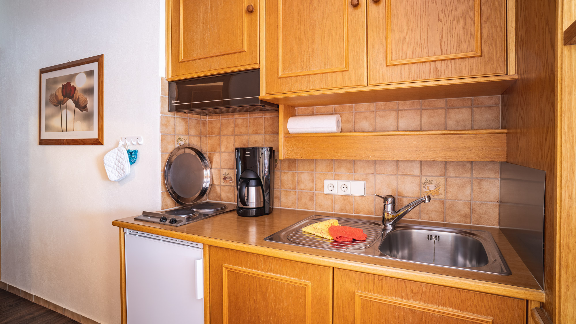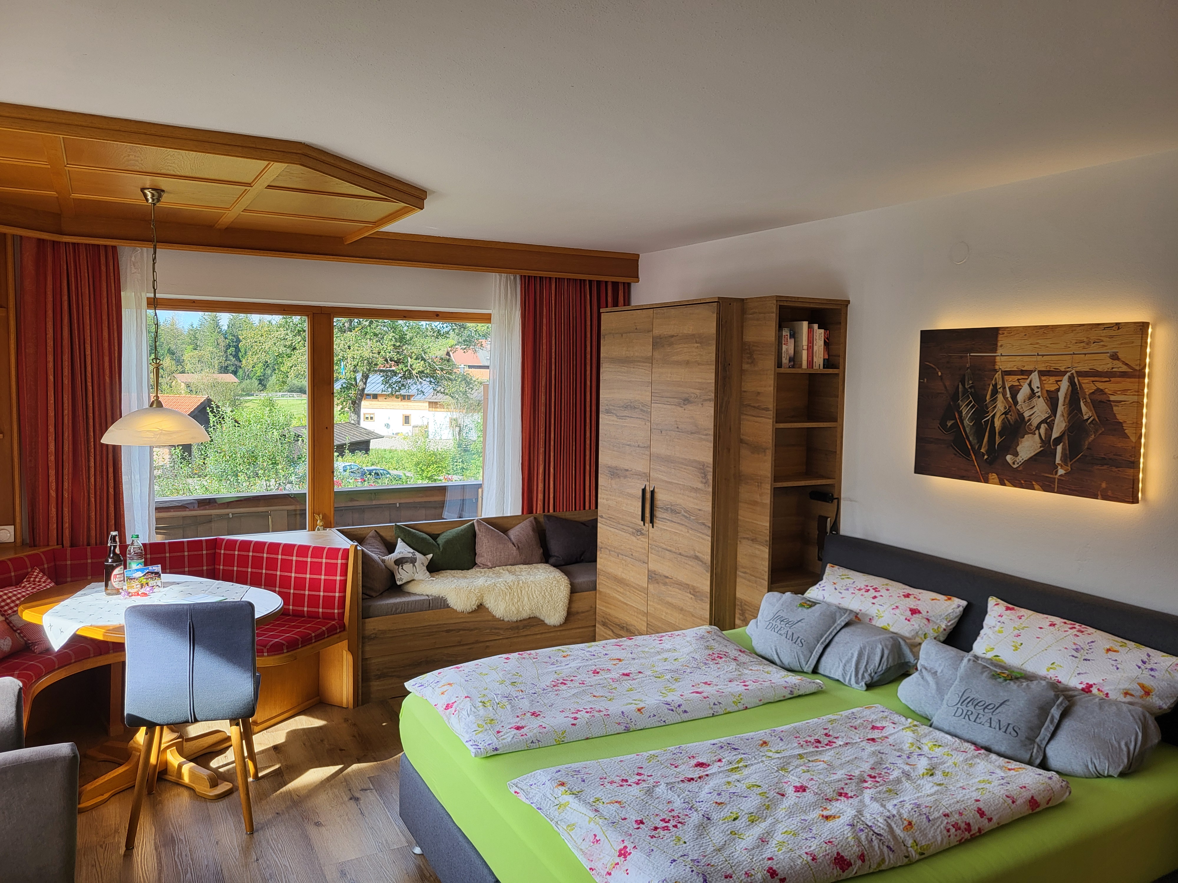 Sehr helles Studio Apartment mit 40 m2 in der 1. Etage, kombinierter Wohn-/Schlafraum mit Sitz- bzw. Essecke aus Naturholz und kleiner Küchenzeile, Boxspringbett, kleines Sofa am Panoramafenster und großem Balkon mit Morgen- und Abendsonne und Bergblick und neuem Vinyldekorboden in Eichenoptik.