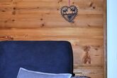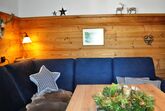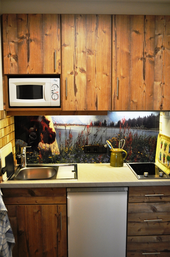 Alpines Studio Apartment mit 40 m2 im 1. Stock mit großem, überdachten Balkon in Westausrichtung (auch f. Allergiker geeignet!): Die im Altholzstil konzipierte Wohnung besteht aus einem großen Wohn-/Schlafraum mit Ledereckcouchgarnitur vor einer Fichtenaltholzwandvertäfelung, Esstisch und Stühlen, sowie einem gemütlichen Boxspringbett, einer kleinen, aber feinen Küche und einem modernen Bad. Unsere Wohnung Almstüberl hat ausschließlich Vinylböden mit Holz- und Granitdekor.