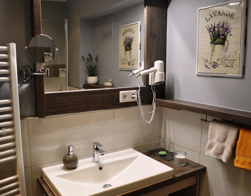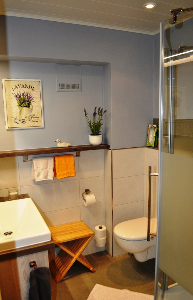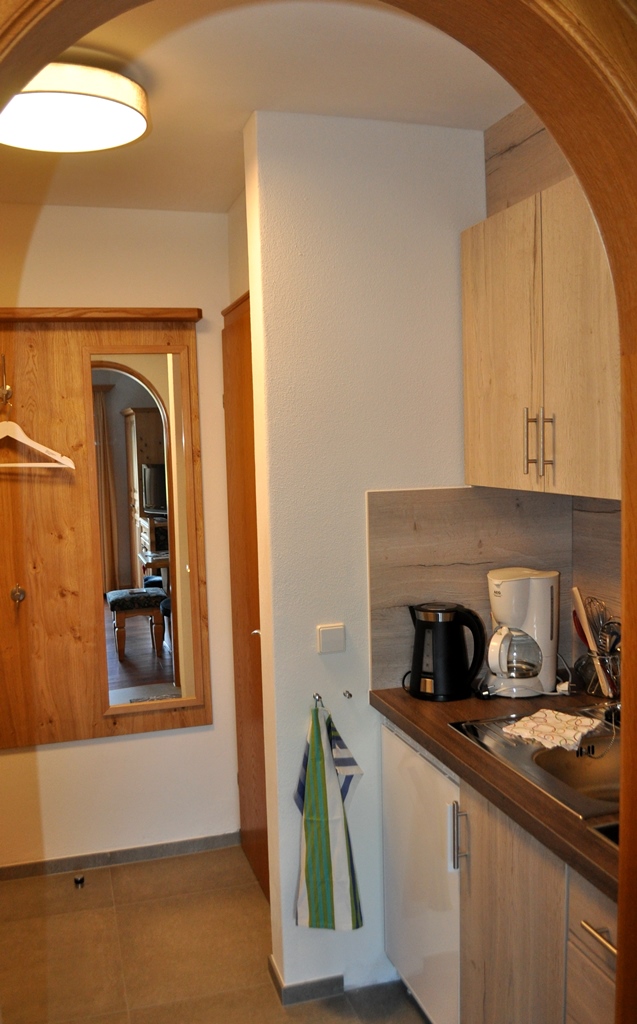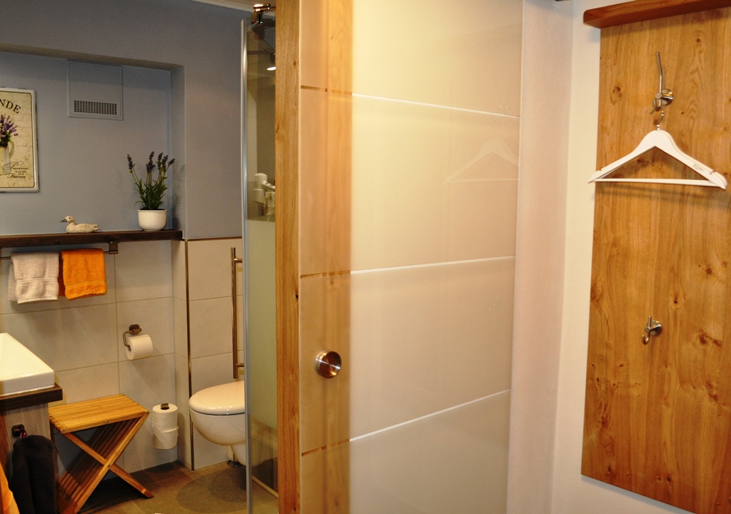 Komfortzimmer für zwei Personen im Landhausstil mit 30m² im 1. Stock:im Schlafraum Schreinermöbel aus hellem Fichtenholz, sowie Sitzecke uch, im Vorraum eine moderne kleine Küche und ein neues Bad mit Waschtisch, Eckdusche und Glastür zum Wohnraum, außerdem Balkon mit Abendsonne - unser Allergikerzimmer mit Vinyldekorholz- und Fliesenböden.