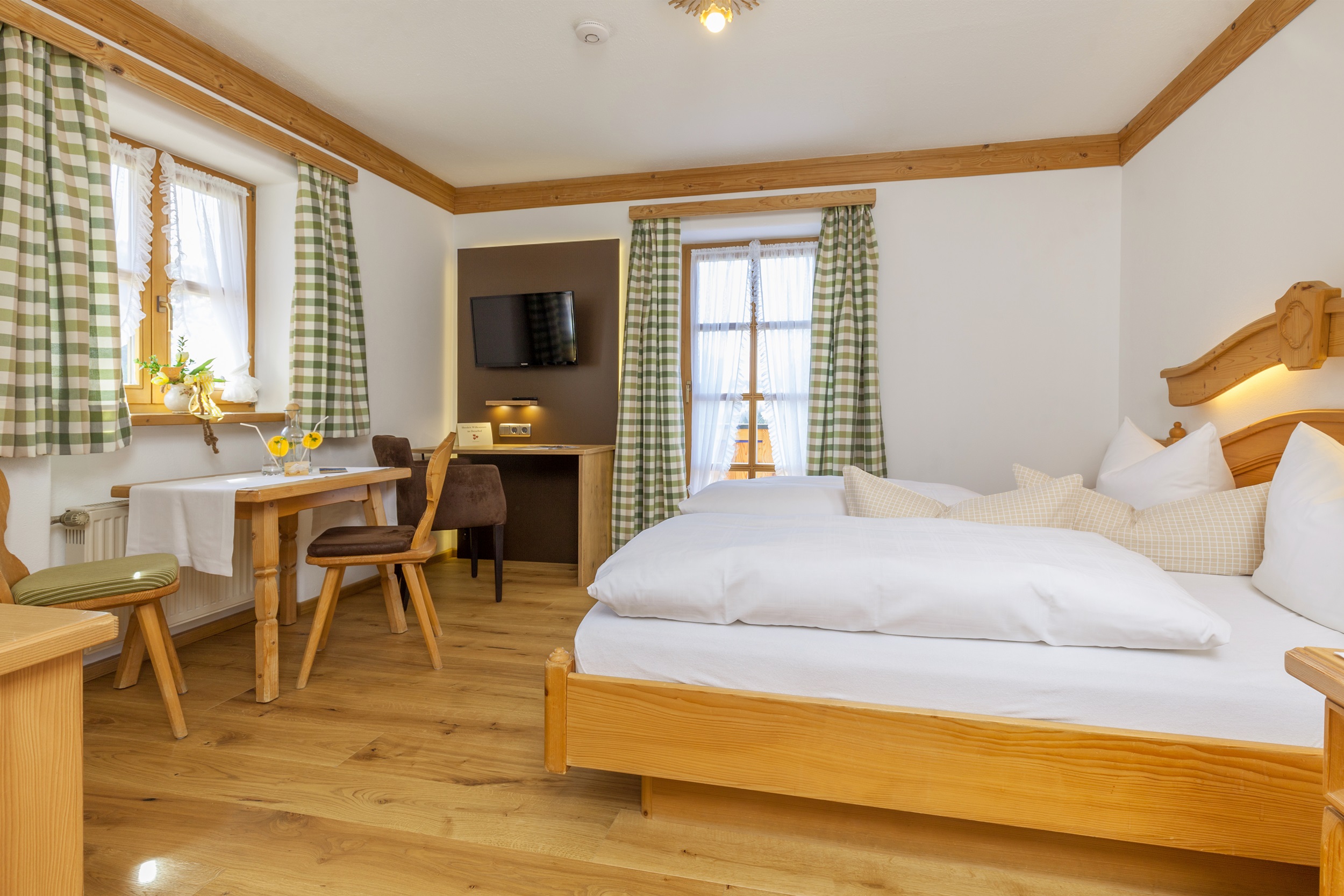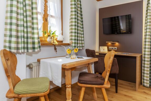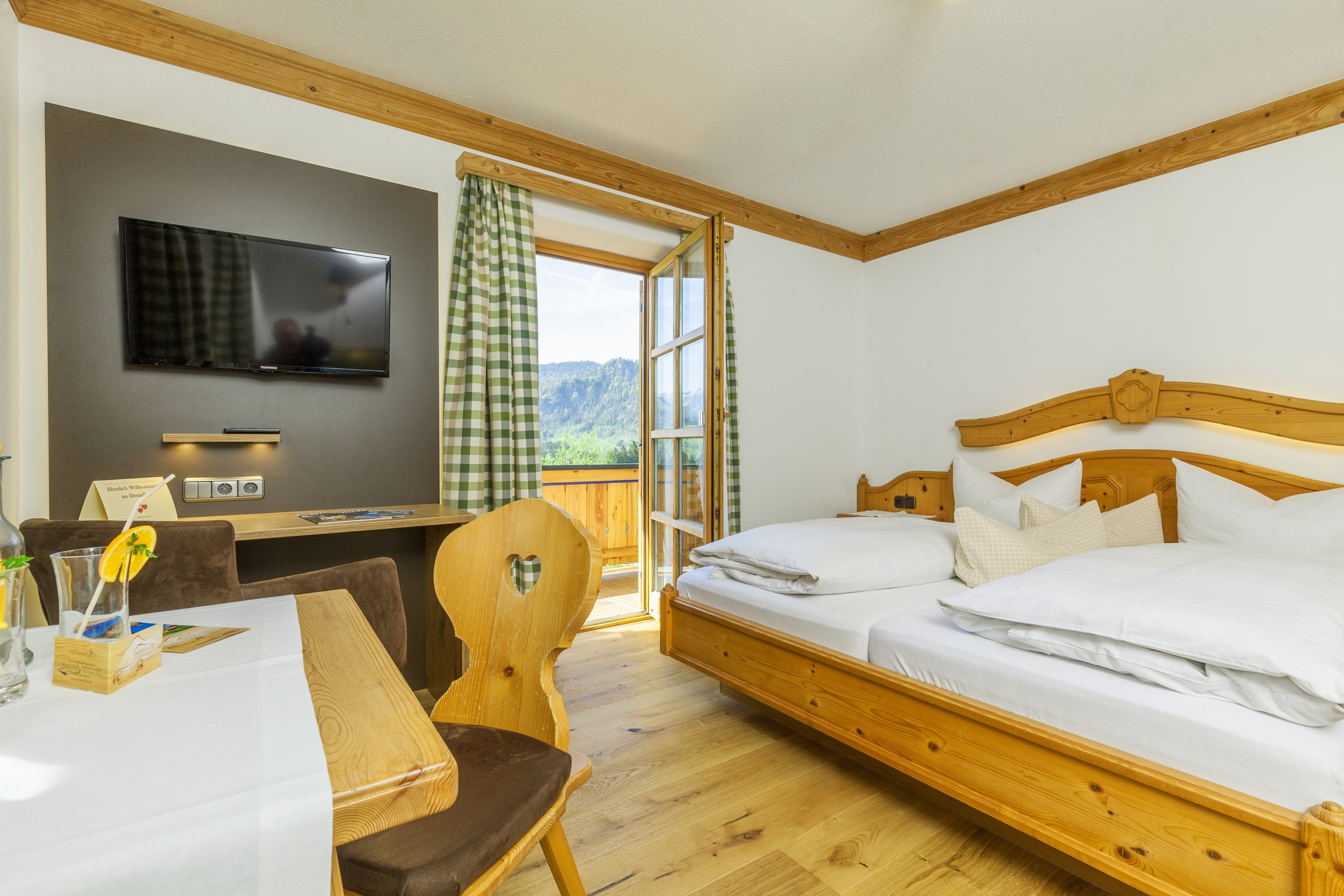 Gemütlich eingerichtetes Eckzimmer mit Balkon und herrlicher Aussicht. Schlafmöglichkeit für das Kind auf einer Ausziehcouch vorhanden.
