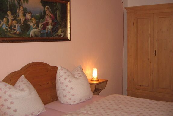 Das behagliche Doppelzimmer (ca. 15 qm) ist im 1. Stock des Bauernhauses und ist mit Sitzgelegenheit und TV ausgestattet. Die dazugehörende Dusche und das extra WC zur Alleinnutzung sind außerhalb neben dem Zimmer. Das reichhaltige Frühstück servieren wir Ihnen in unserer gemütlichen Bauernstube.