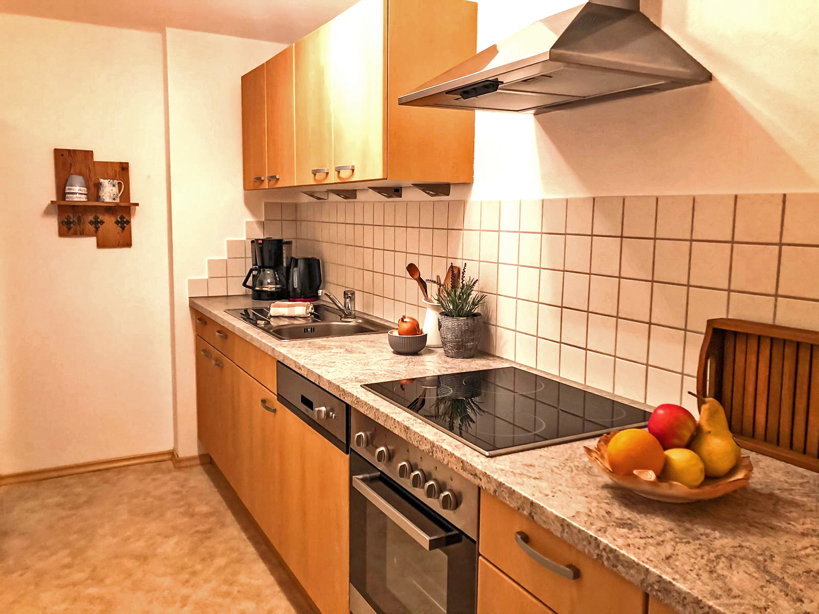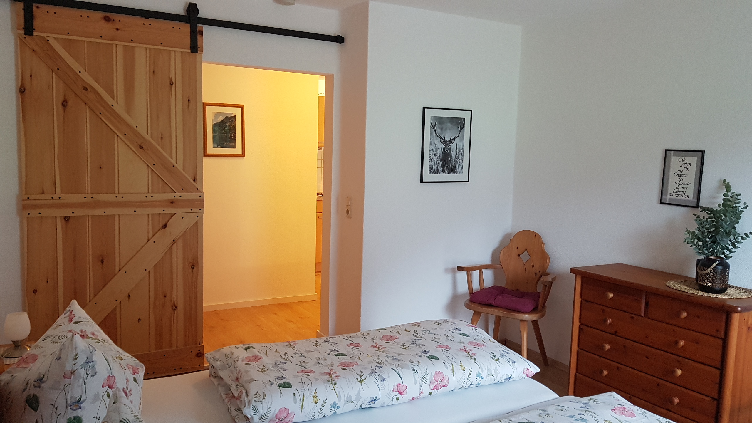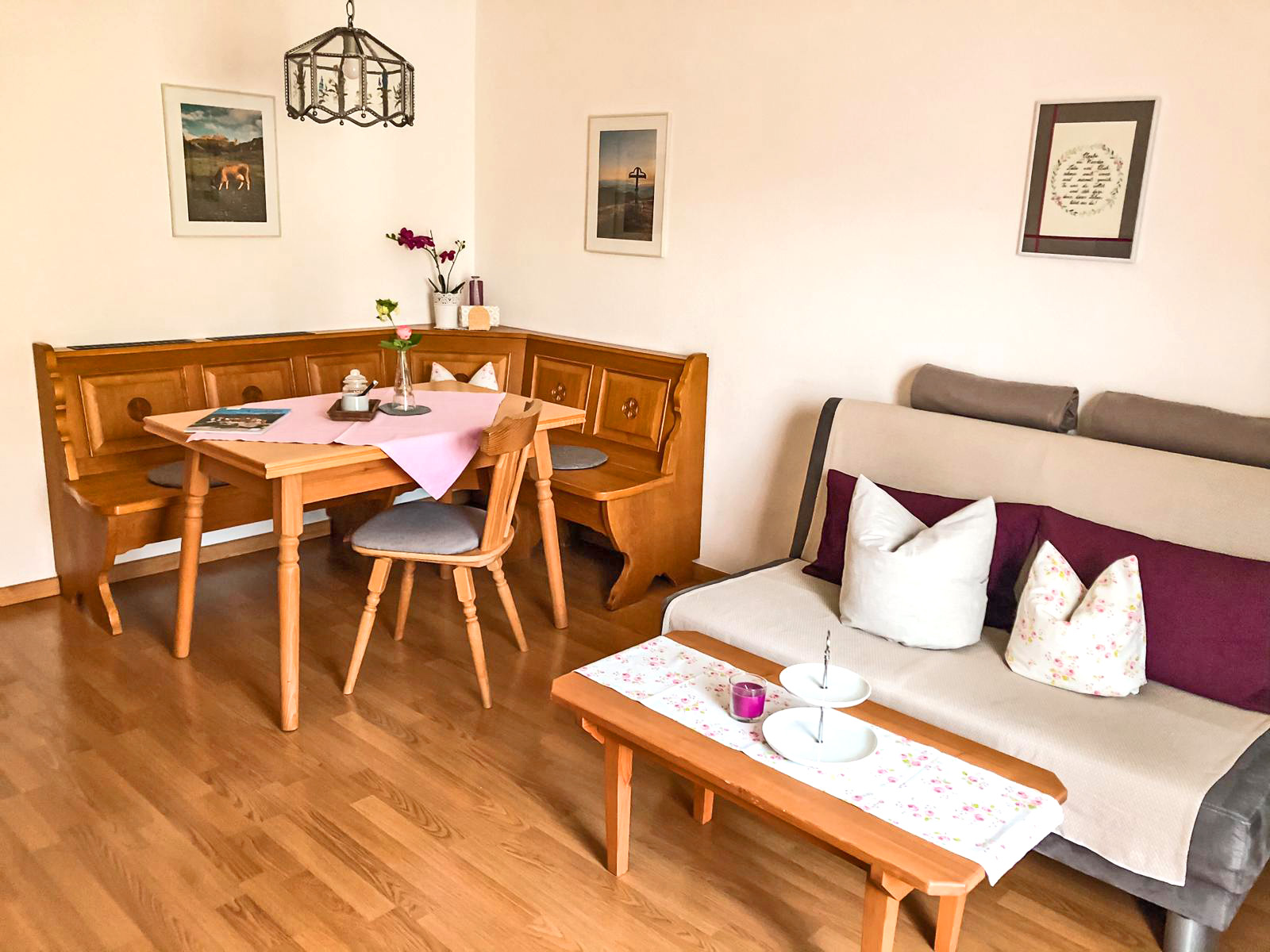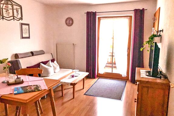 Die 45 qm große Nichtraucher-Ferienwohnung befindet sich im 1. Stock des Hauses mit Süd-Balkon und einem extra Eingang über eine Außentreppe. Kleine separate Küche mit Geschirrspüler, Ceran-Elektroherd mit Backofen, Kaffeemaschine, Wasserkocher und Toaster. Wohnzimmer mit gemütlicher Eckbank zum Essen und Sitzen, Couch, Flat-SAT-TV und kostenloses WLAN. Separates Schlafzimmer mit Doppelbett. TV-Anschluss im Wohn- und Schlafzimmer, Fernseher auswahlweise aufstellbar. Badezimmer mit Badewanne, Dusche/WC und Fön.