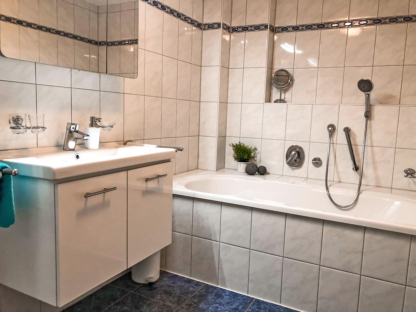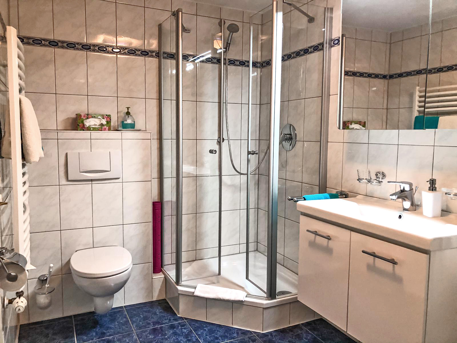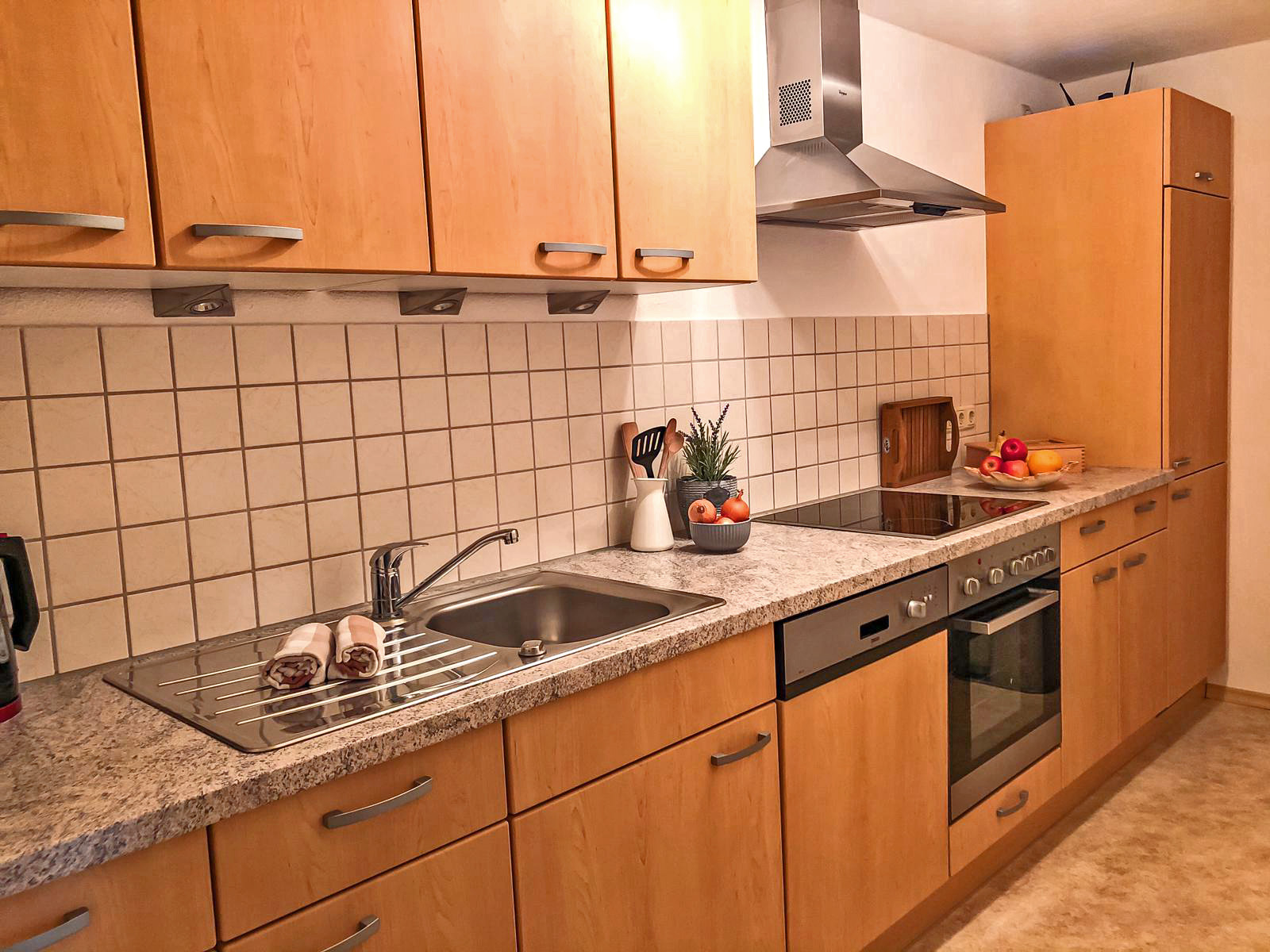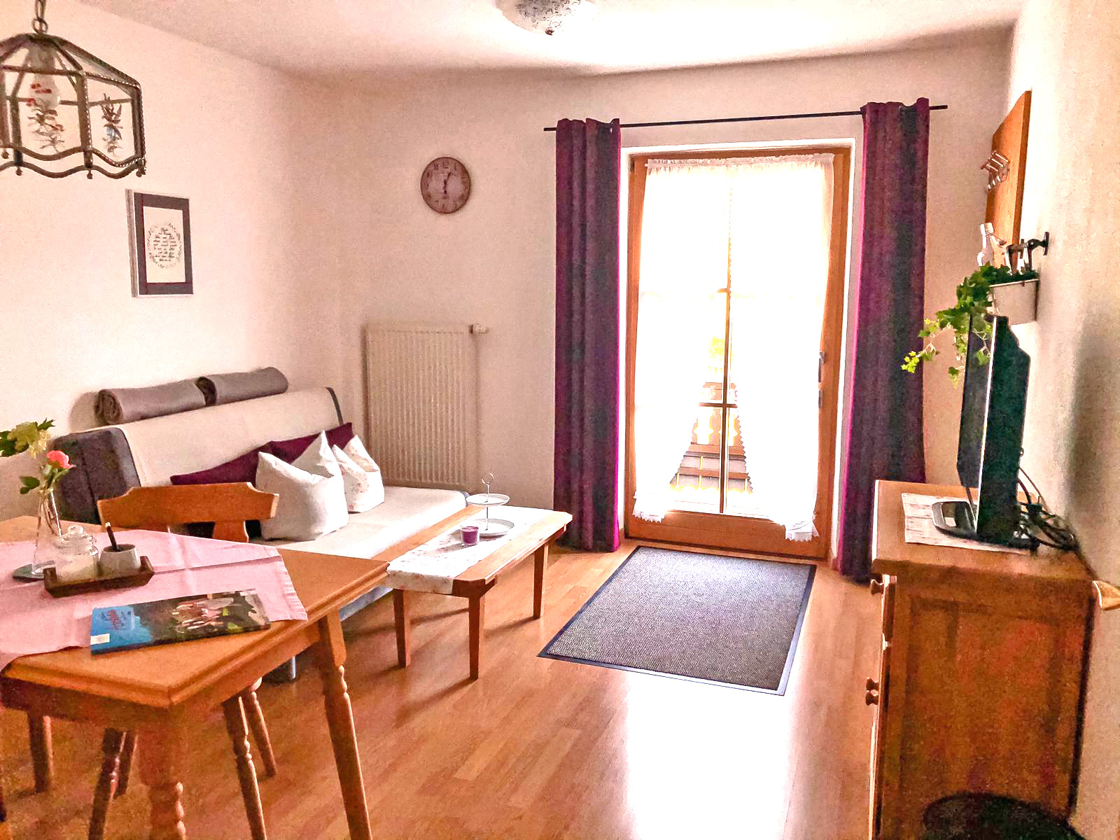 Die 45 qm große Nichtraucher-Ferienwohnung befindet sich im 1. Stock des Hauses mit Süd-Balkon und einem extra Eingang über eine Außentreppe. Kleine separate Küche mit Geschirrspüler, Ceran-Elektroherd mit Backofen, Kaffeemaschine, Wasserkocher und Toaster. Wohnzimmer mit gemütlicher Eckbank zum Essen und Sitzen, Couch, Flat-SAT-TV und kostenloses WLAN. Separates Schlafzimmer mit Doppelbett. TV-Anschluss im Wohn- und Schlafzimmer, Fernseher auswahlweise aufstellbar. Badezimmer mit Badewanne, Dusche/WC und Fön.