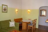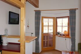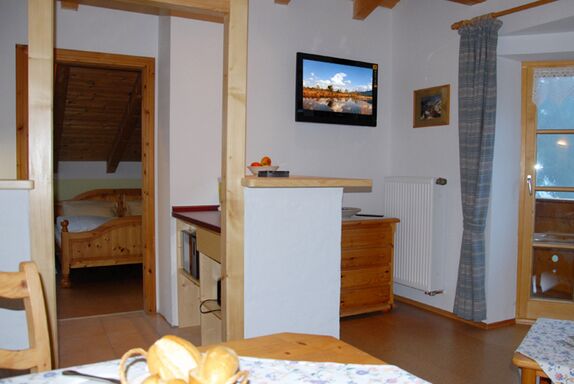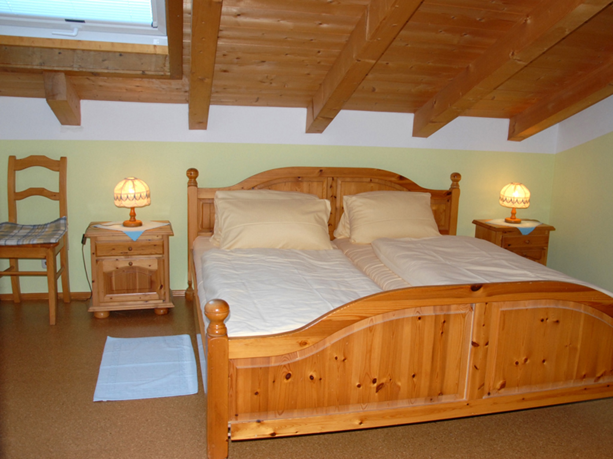 Die helle, mit Fichtenmöbel eingerichtete Ferienwohnung liegt im Obergeschoss und hat einen Balkon. Der Wohn-Schlafraum ist mit einer ausziehbaren Couch, TV mit Flachbildschirm 32 Zoll und Essgruppe, ausgestattet. In der Küche befindet sich eine Mikrowelle sowie auch auf der Küchenzeile ein 2-Plattenherd. Das Schlafzimmer ist mit einem Doppelbett ausgestattet. Das Badezimmer ist mit Dusche und WC, Vergrößerungsspiegel und Fön ausgestattet. W-LAN.Haustier gegen Gebühr erlaubt.