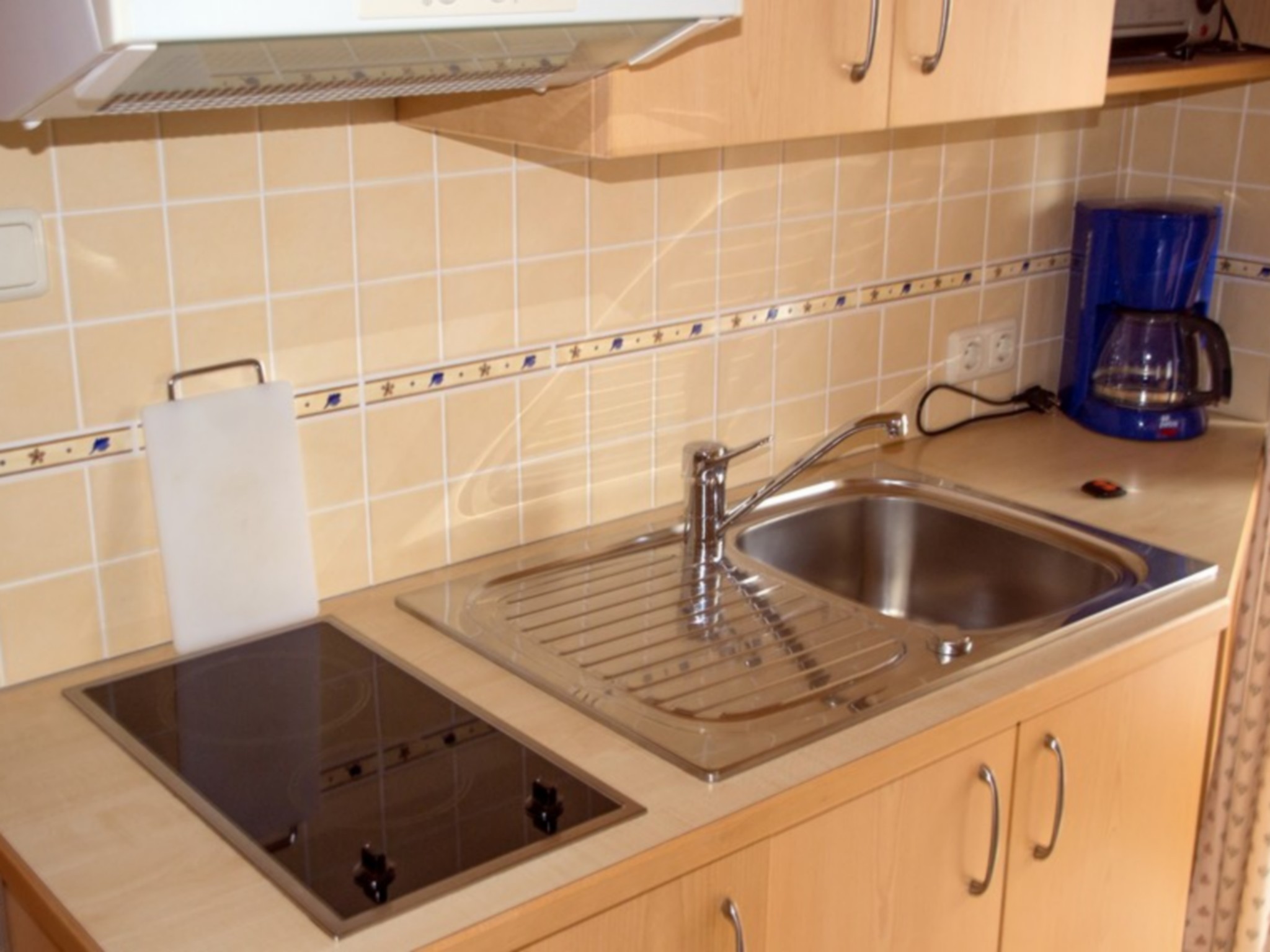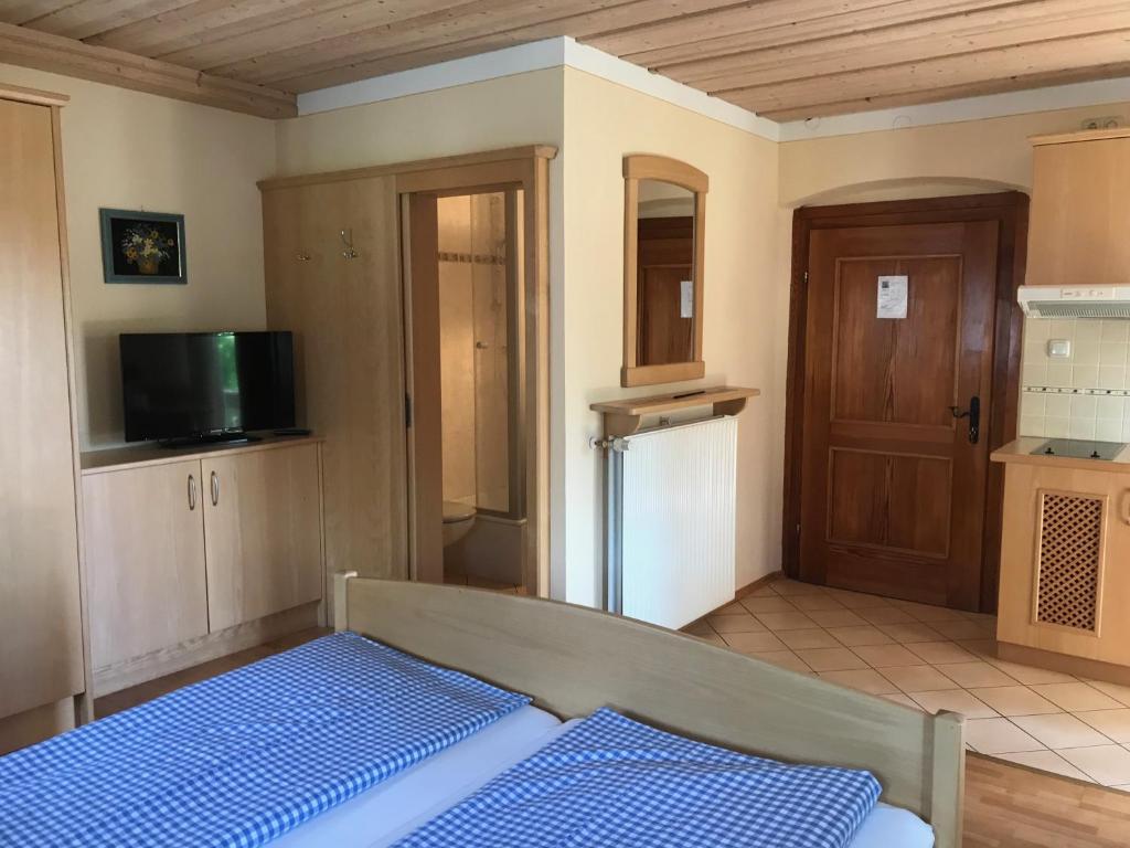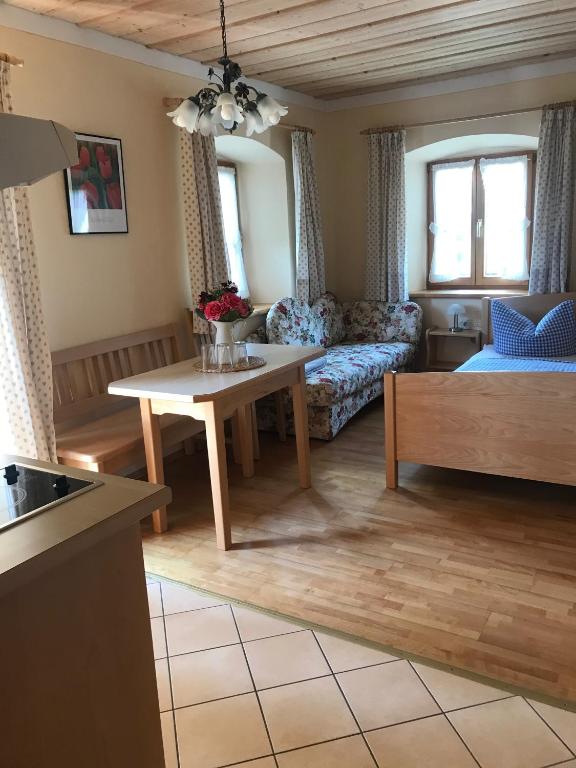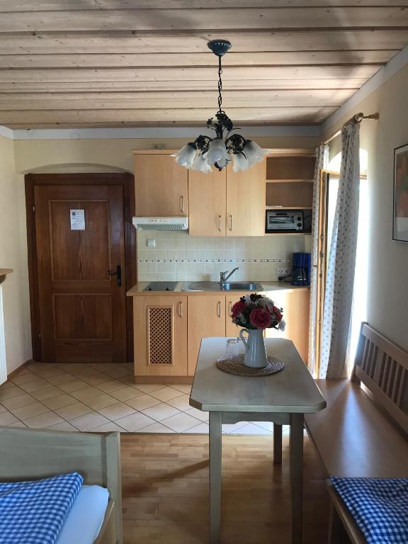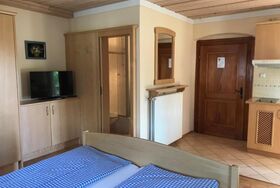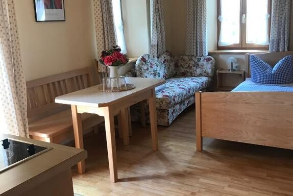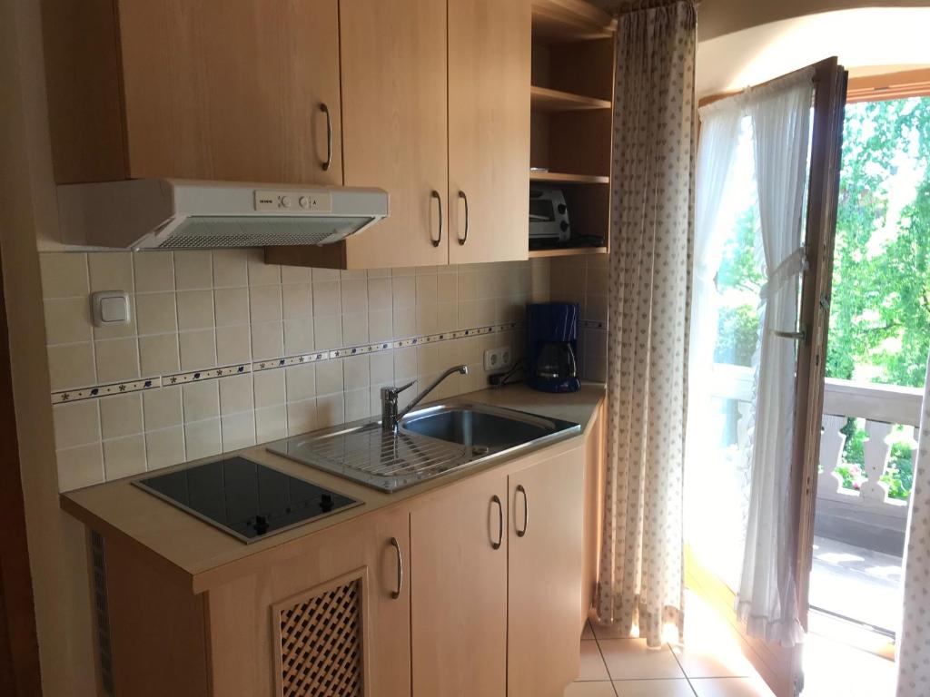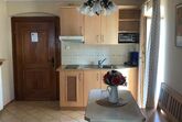 Unser Appartement befindet sich im 1. Stock und ist ausgestattet mit einer Küchenzeile mit Kühlschrank, Herd, Kaffeemaschine und Flachbildfernseher. Ein Zugang zum Balkon mit einer Sitzgelegenheit ist ebenfalls vorhanden. Im Zimmer gibt es auch einen Tisch mit Bank und Stühlen. Das Bad mit Dusche/WC befindet sich im Zimmer.