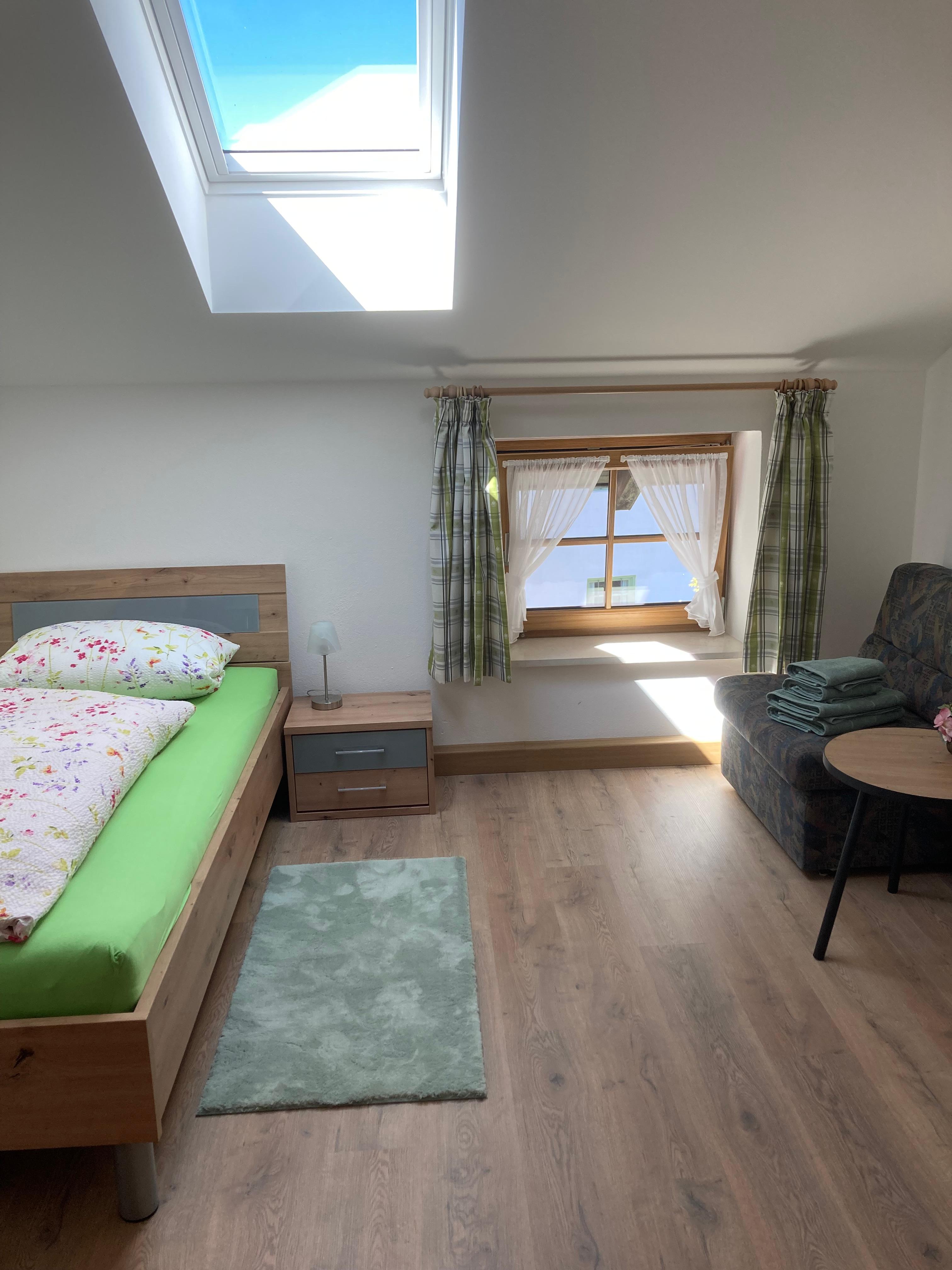 Doppelzimmer mit Zustellbett und Einzelzimmer (ab 4. Person), Etagen DU/WC auf Bauernhof: Das Einzelzimmer ist nur bei Belegung von 4 Erwachsenen im Preis inbegriffen, kann aber für 40 € pro/Nacht dazugebucht werden.