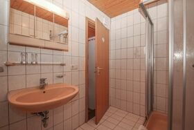 Doppelzimmer mit Dusche/WC und Fenster zum Hof.