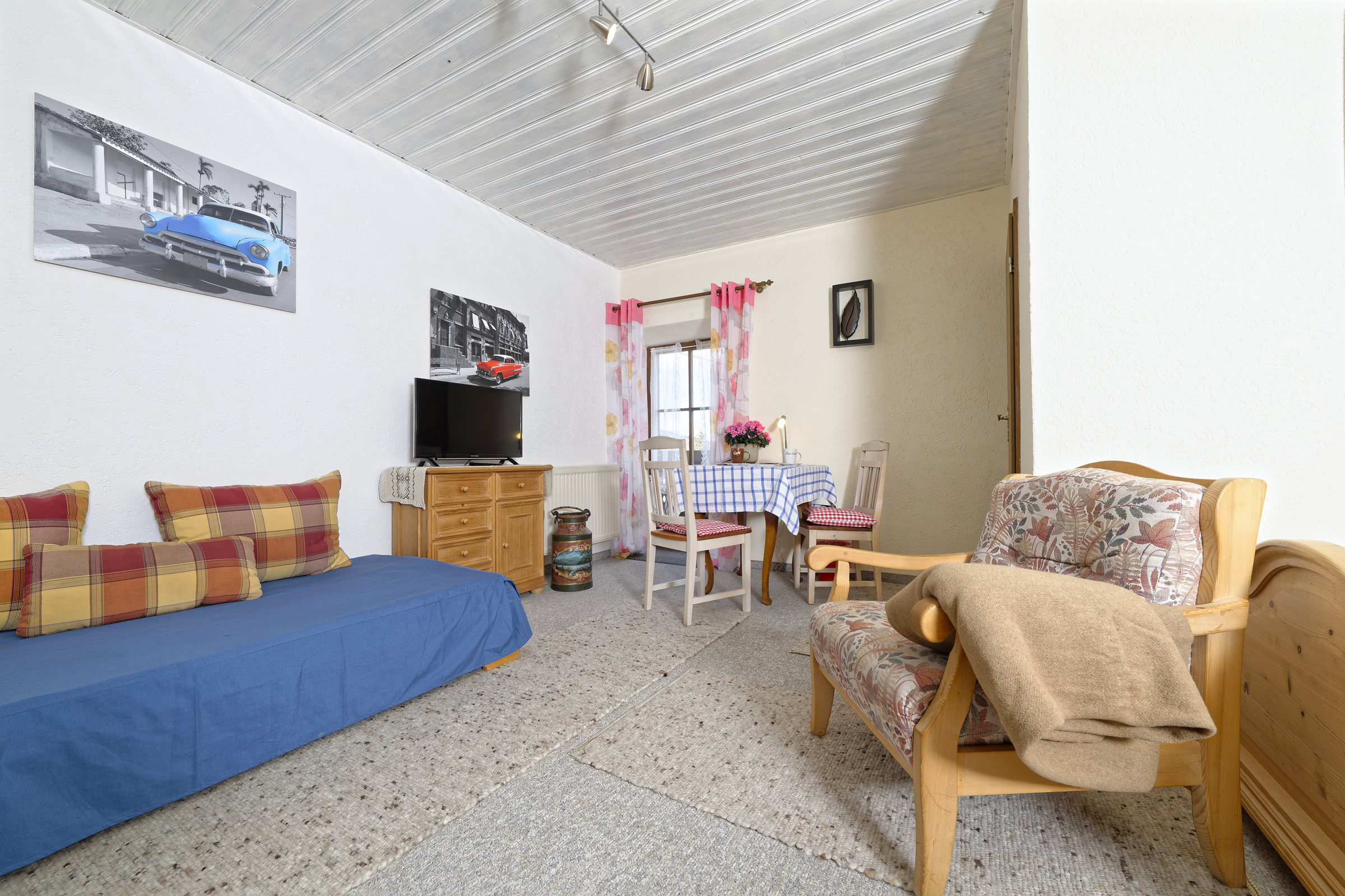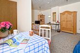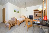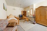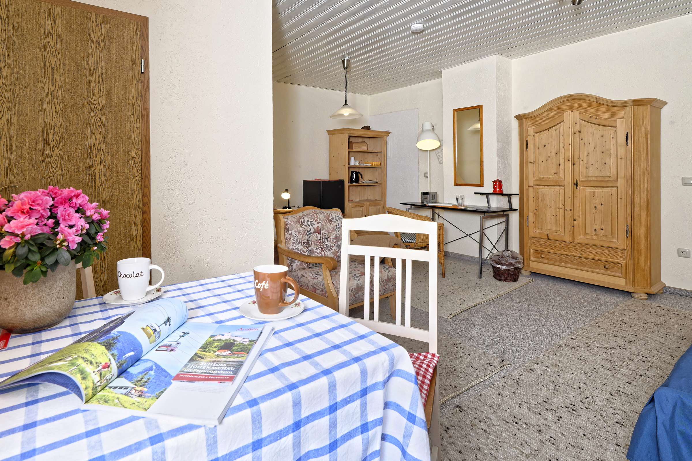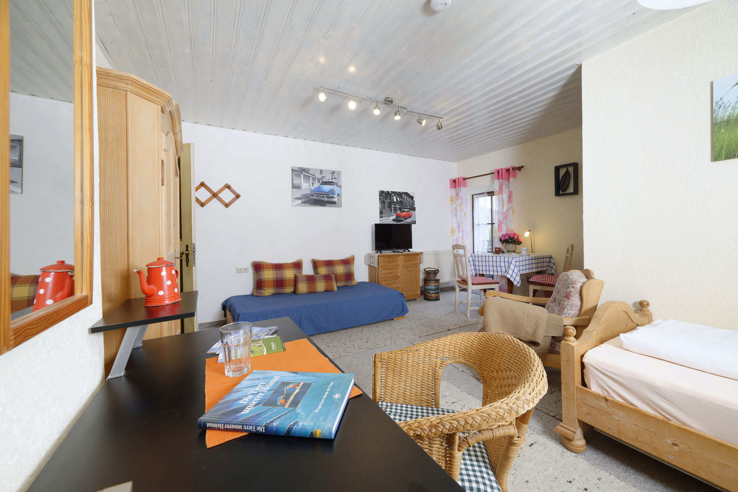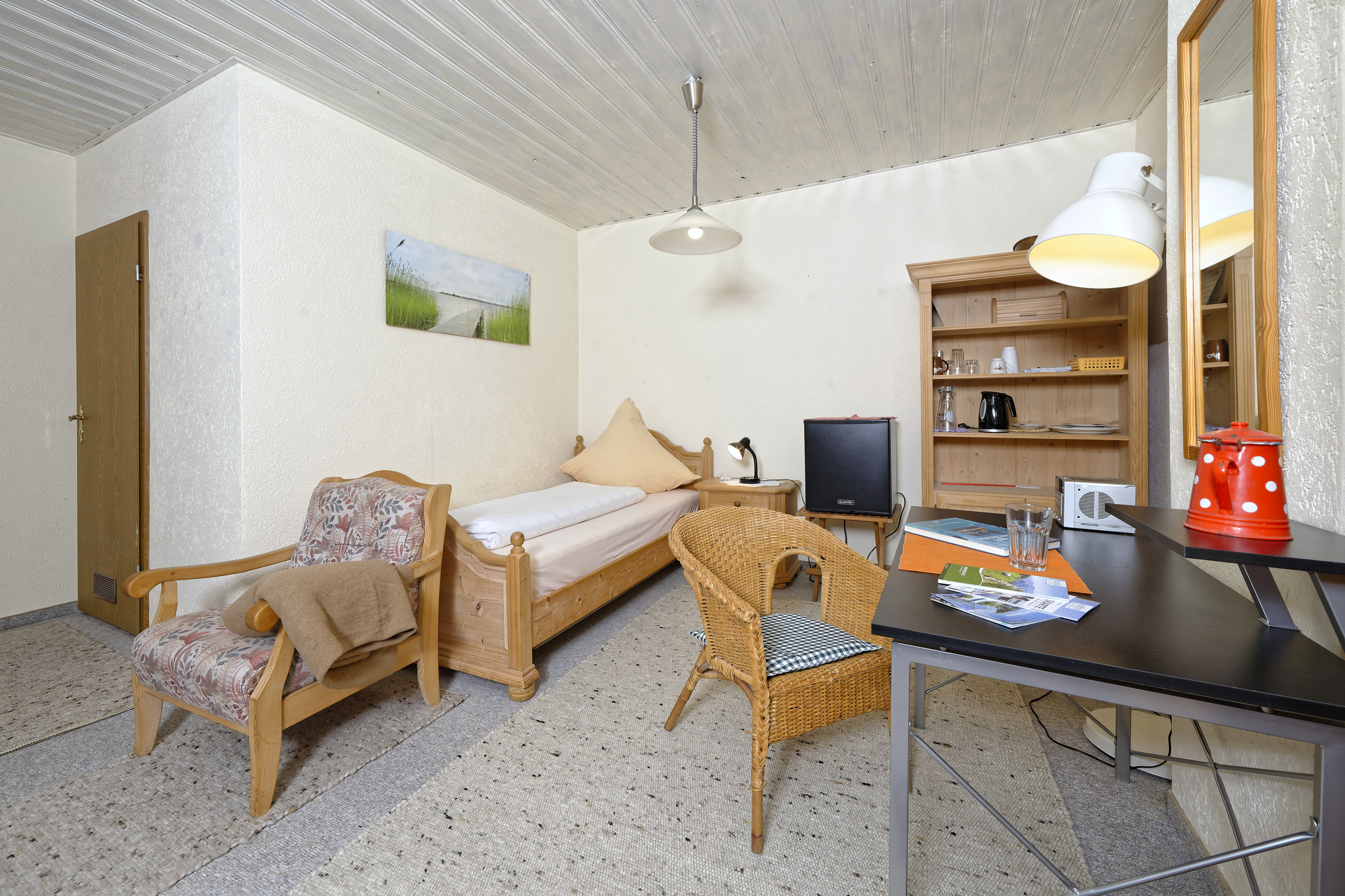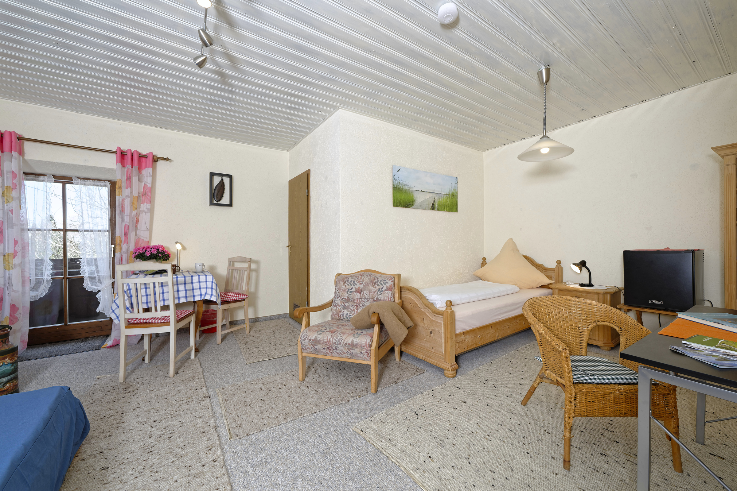 Unser helles Nichtraucher-Einraumzimmer/Zweibettzimmer im Haupthaus ist ohne Frühstück und befindet sich im 1. Stock mit West-Balkon, einem Einzelbett und einem Zustellbett (die Betten können nicht zusammen stehen), Flachbild-Digital-SAT-TV, kostenloses WLAN und Dusche/WC. Für Ihre eigene Frühstückszubereitung wurde das Zimmer mit Kaffeemaschine, Toaster, Wasserkocher und Kühlschrank ausgestattet. Babybett auf Anfrage möglich. Es dürfen keine Hunde oder Haustiere mitgebracht werden. Gegen Gebühr Waschmaschine und Wäschetrockner im Haus.