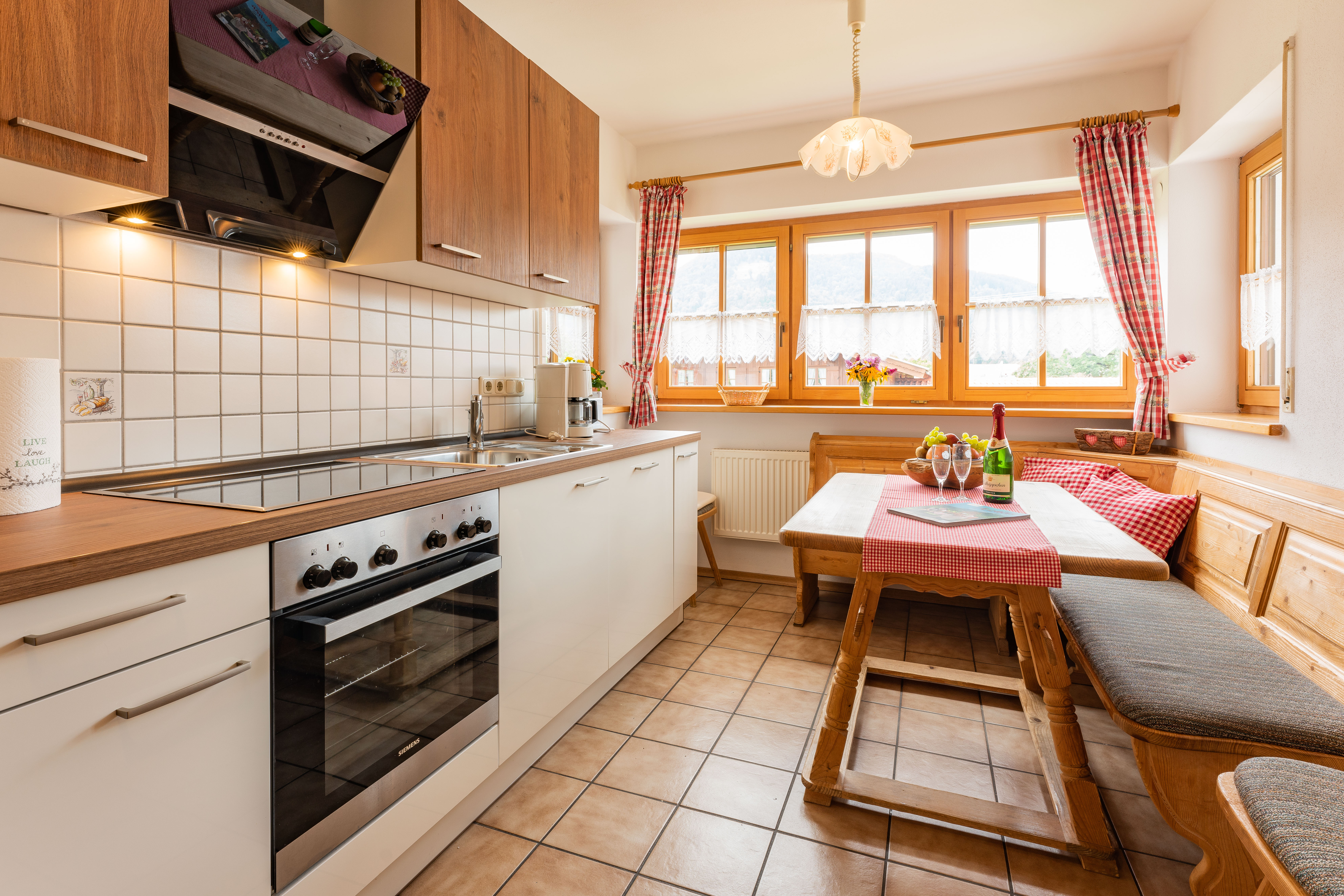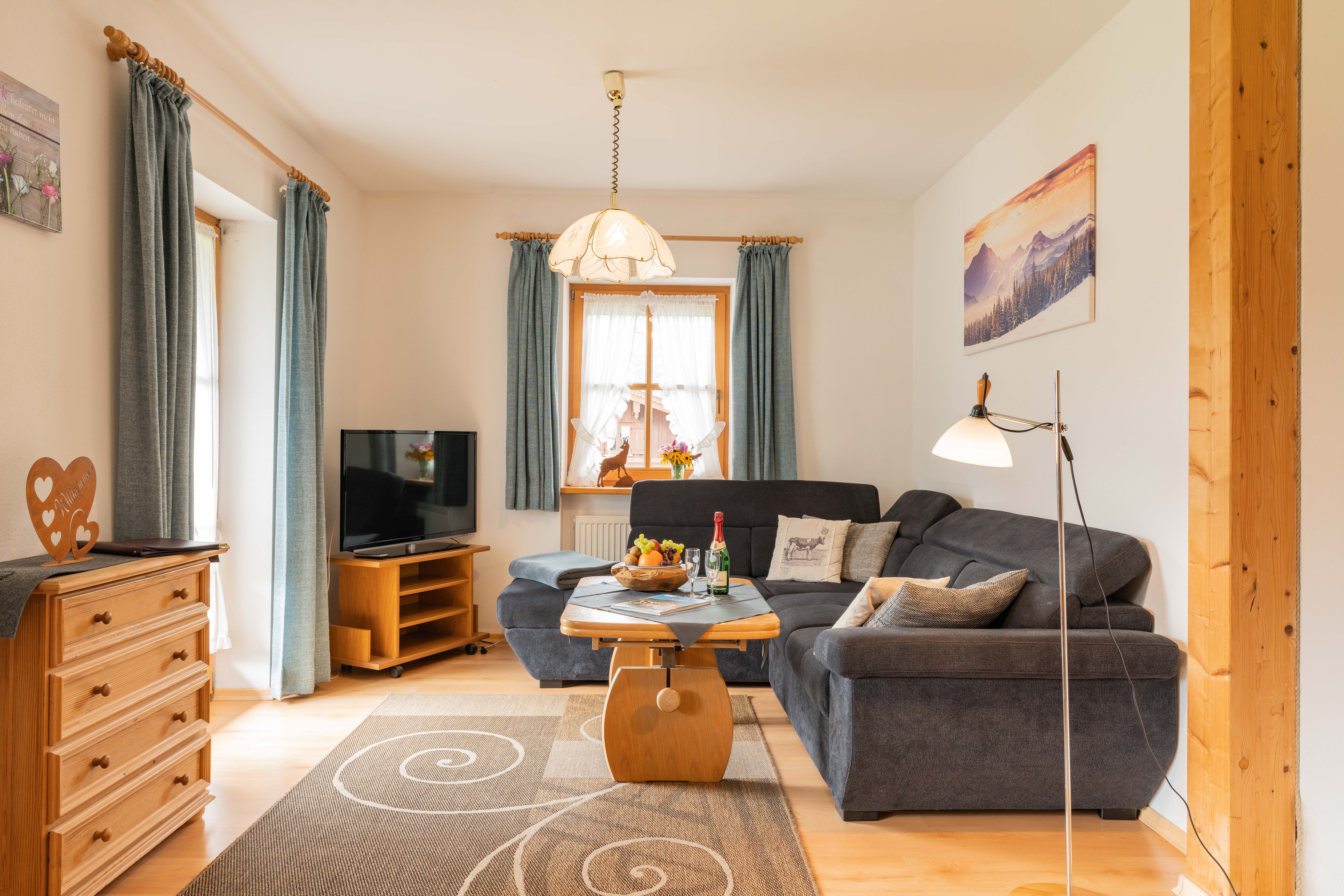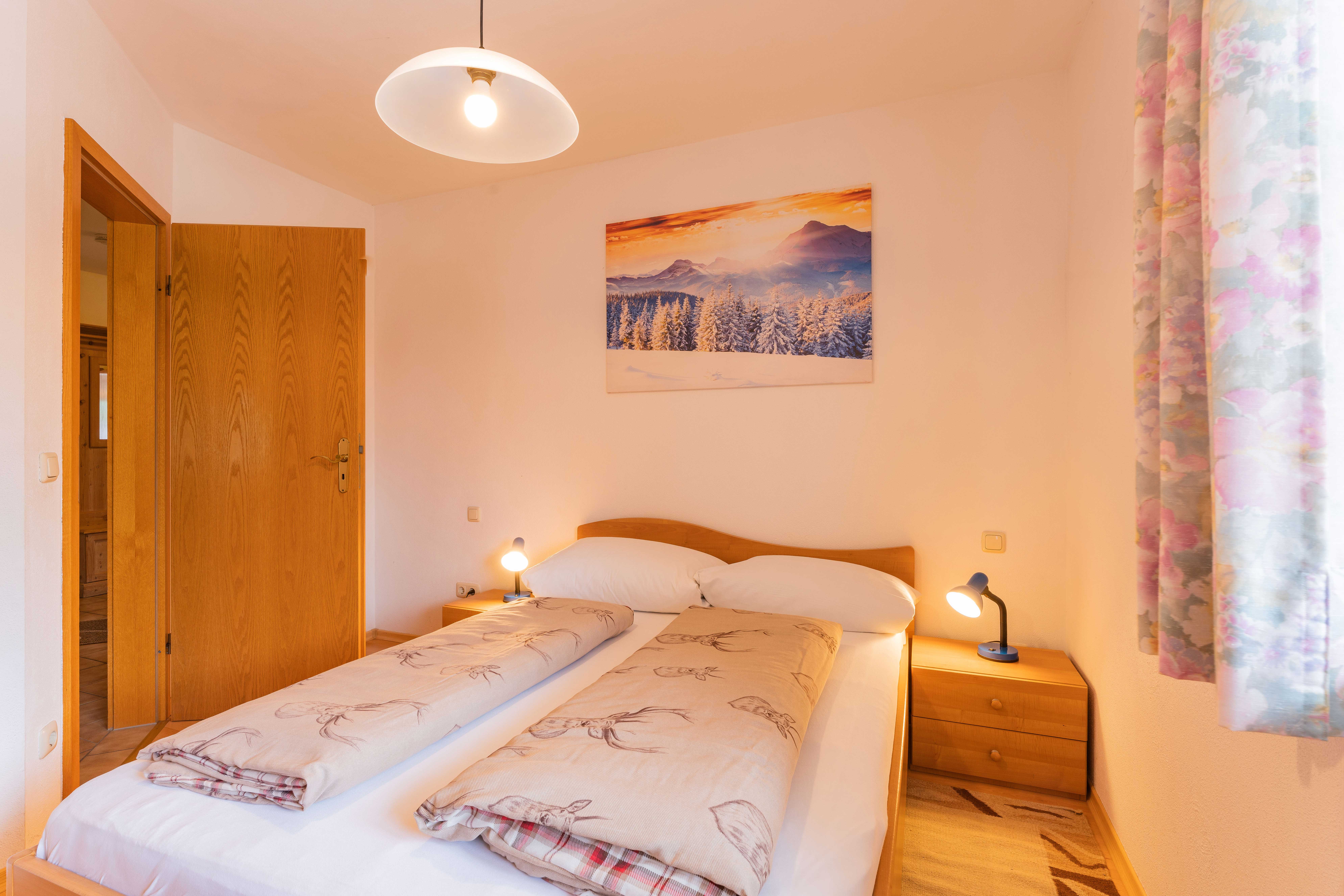 Helle, geräumige Nichtraucher Ferienwohnung 75 qm für 2 - 4 Personen mit Süd-Balkon und herrlichem Blick auf die Berge. Zwei separate Schlafzimmer: ein Schlafzimmer mit Doppelbett, ein kleineres Schlafzimmer mit Französischem Bett 1,40 x 2 m. Großes Wohnzimmer mit gemütlicher Couch, Flat-Kabel-TV und kostenloses WLAN. Separate Küche mit Eckbank und Esstisch, Geschirrspülmaschine, Herd/Backofen und Kühlschrank/Tiefkühlfach. Zwei Badezimmer mit Dusche/WC. Bettwäsche und Handtücher vorhanden. Hunde und Haustiere sind nicht erlaubt.