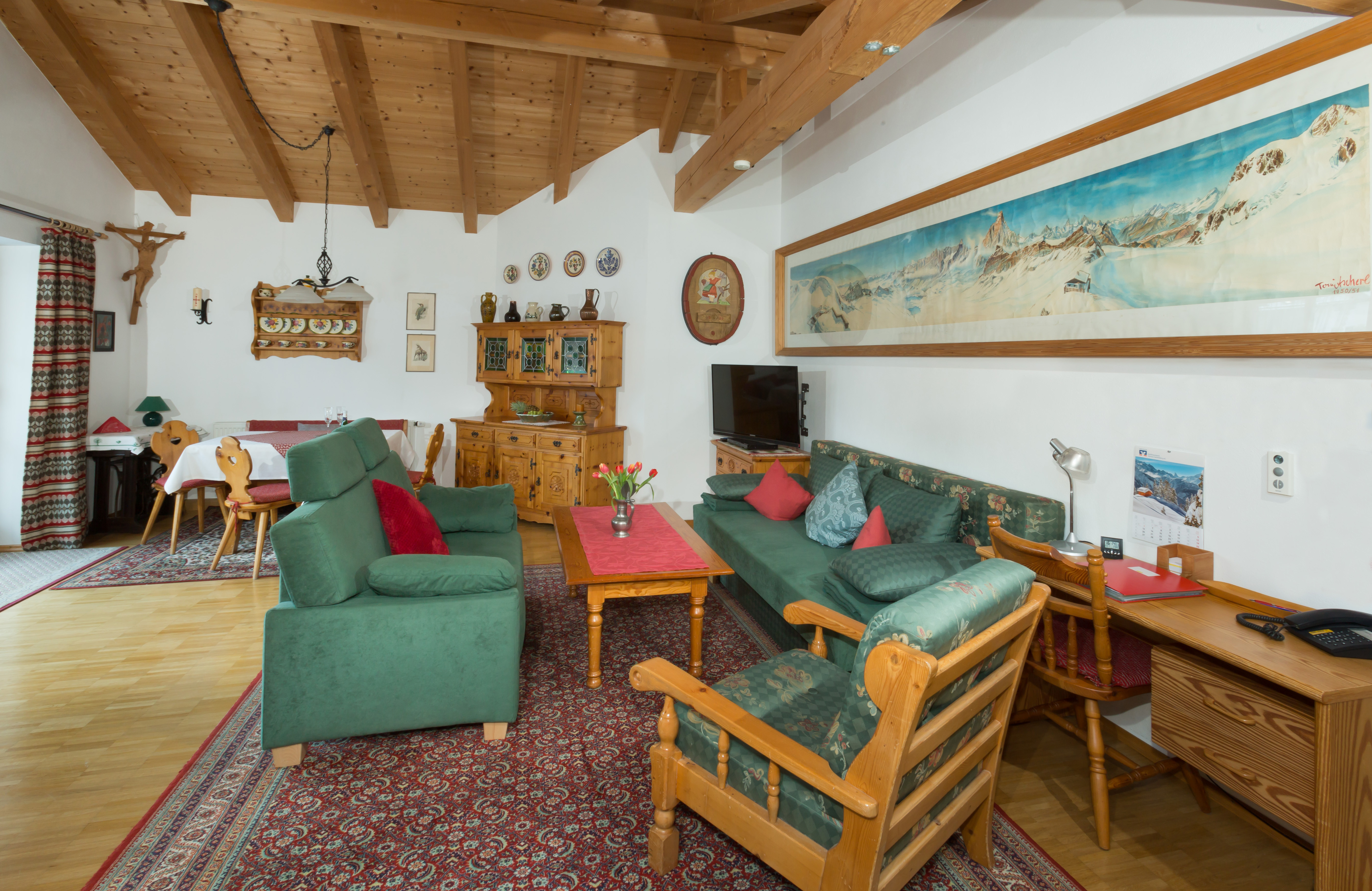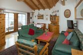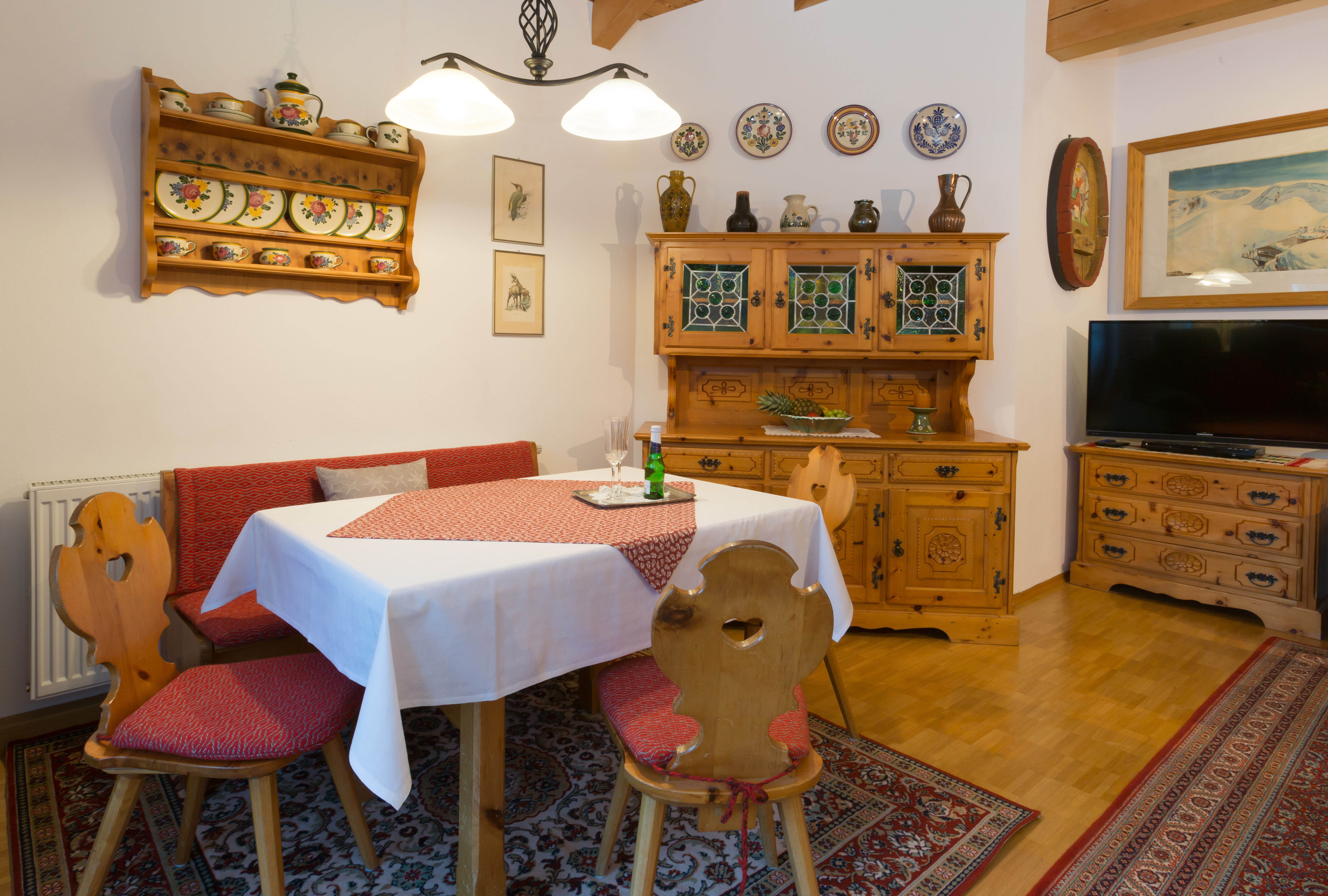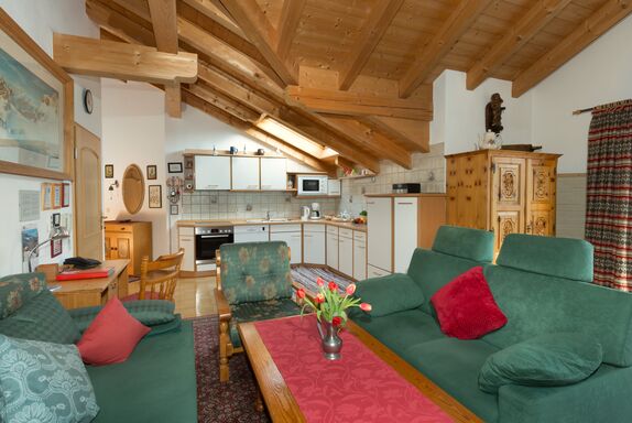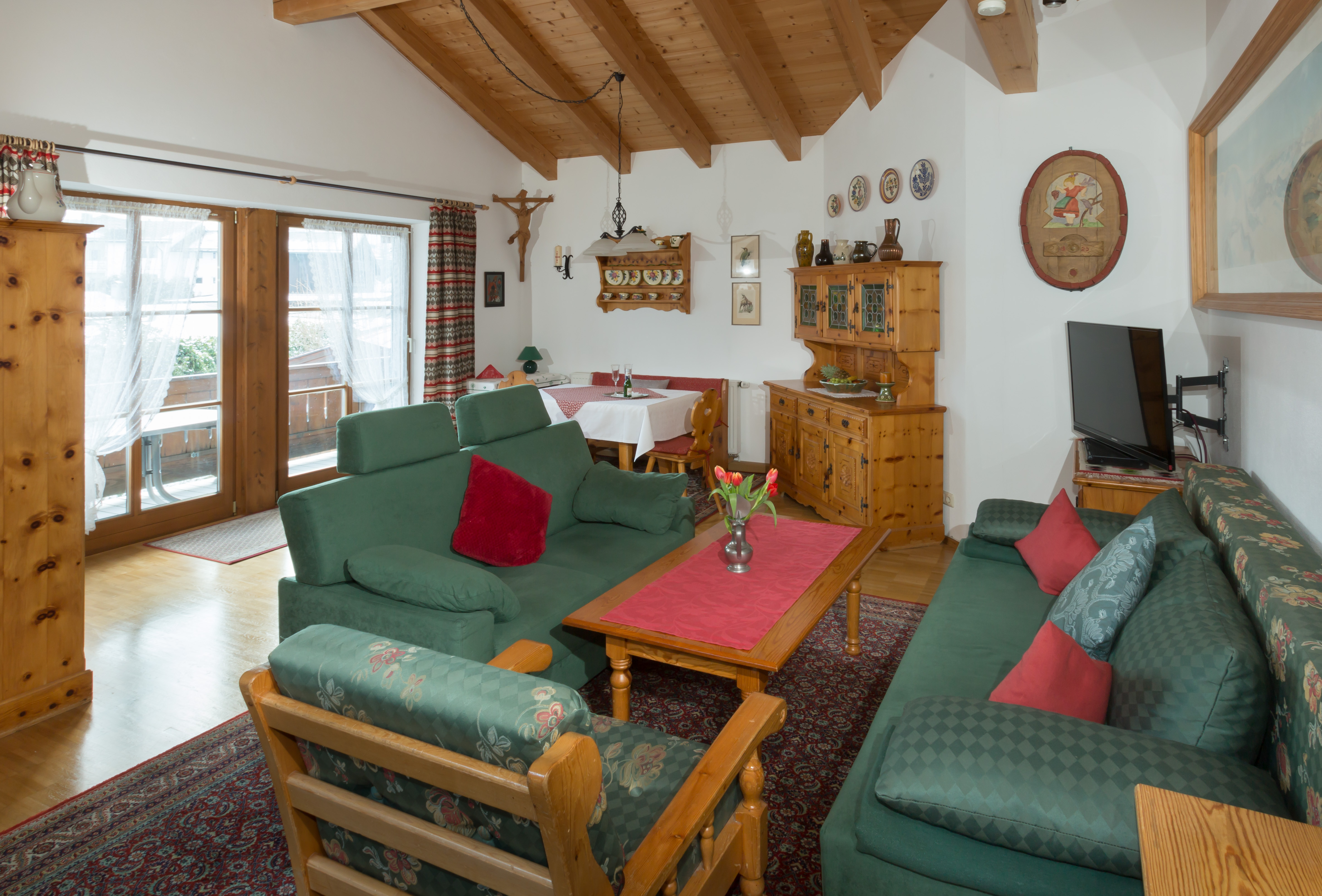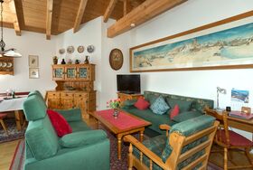 Sehr helle 70 qm Ferienwohnung II -Kampenwand- mit gehobener, kompletter Ausstattung, sichtbares Gebälk, Bodenheizung und Heizkörper. Sehr großes Wohnzimmer mit vollausgestatteter offener Küche, harmonisch im Wohnraum integriert mit Geschirrspüler, Ceranfeld, Backofen und allen Geräten, großer Tisch für 6 Personen, bequeme Doppel-Schlafcouch, SAT-TV, Radio mit CD, DVD-Player, Telefon, Internetanschluss mit D-LAN und kostenloses WLAN. Extra Schlafraum mit 3 Betten: Doppel- und Einzelbett. Großzügiges Badezimmer mit Dusche, Badewanne und WC. Süd-Balkon mit Balkonmöbel. Kinderbett, Kinderhochstuhl, Wickelauflage in jeder Wohnung. Gerne können Sie gegen Aufpreis einen Hund mitbringen. Waschmaschine und Wäschetrockner gegen Gebühr im Haus nutzbar. Ferienwohnung bedingt Behindertengerecht: breite Treppe und Türen, sehr gute Beweglichkeit, großzügige Wohnung, keine Schwellen, großes Bad. Auch für Rollstuhlfahrer Kinder, wenn Sie hochgetragen werden!